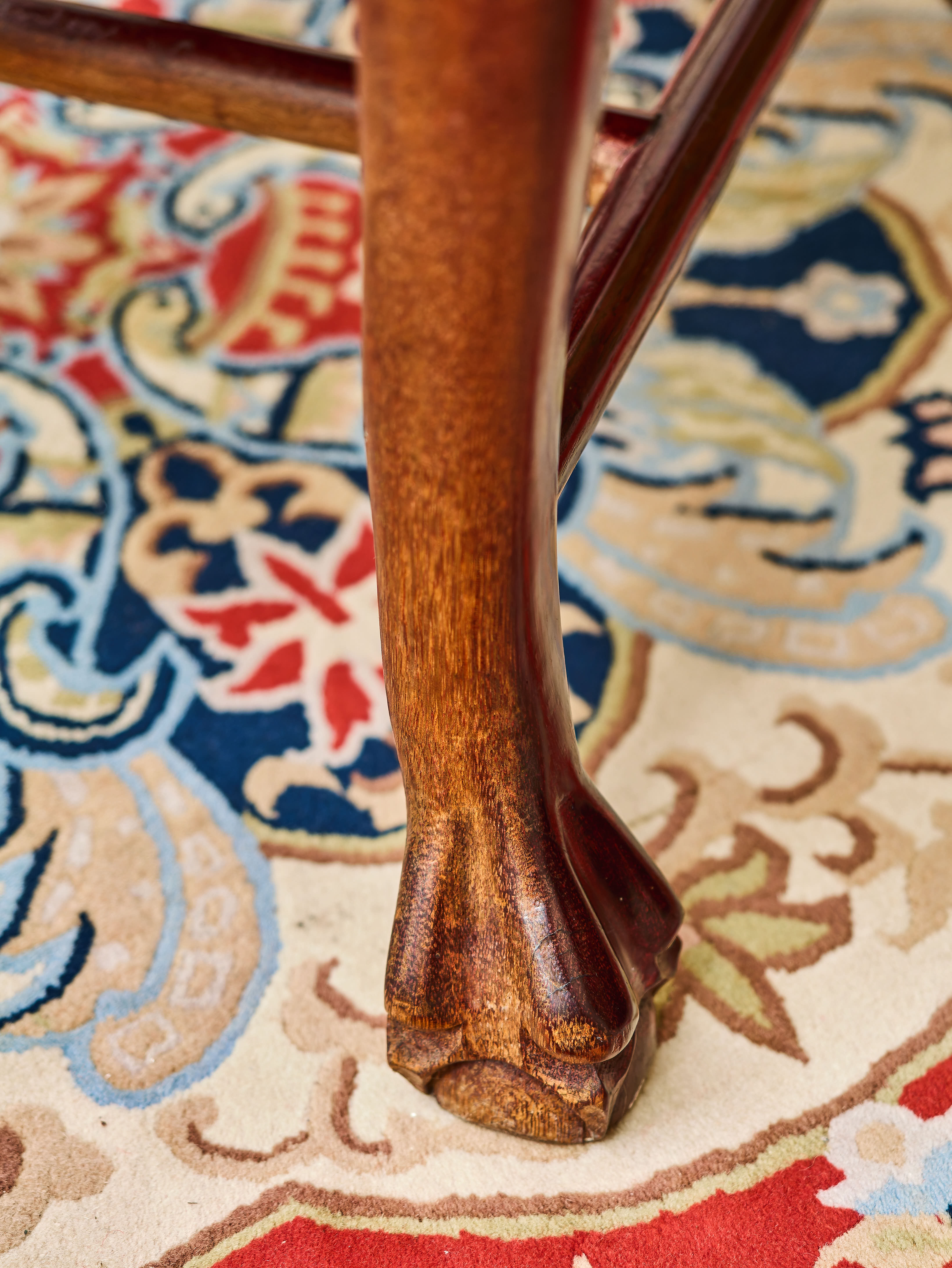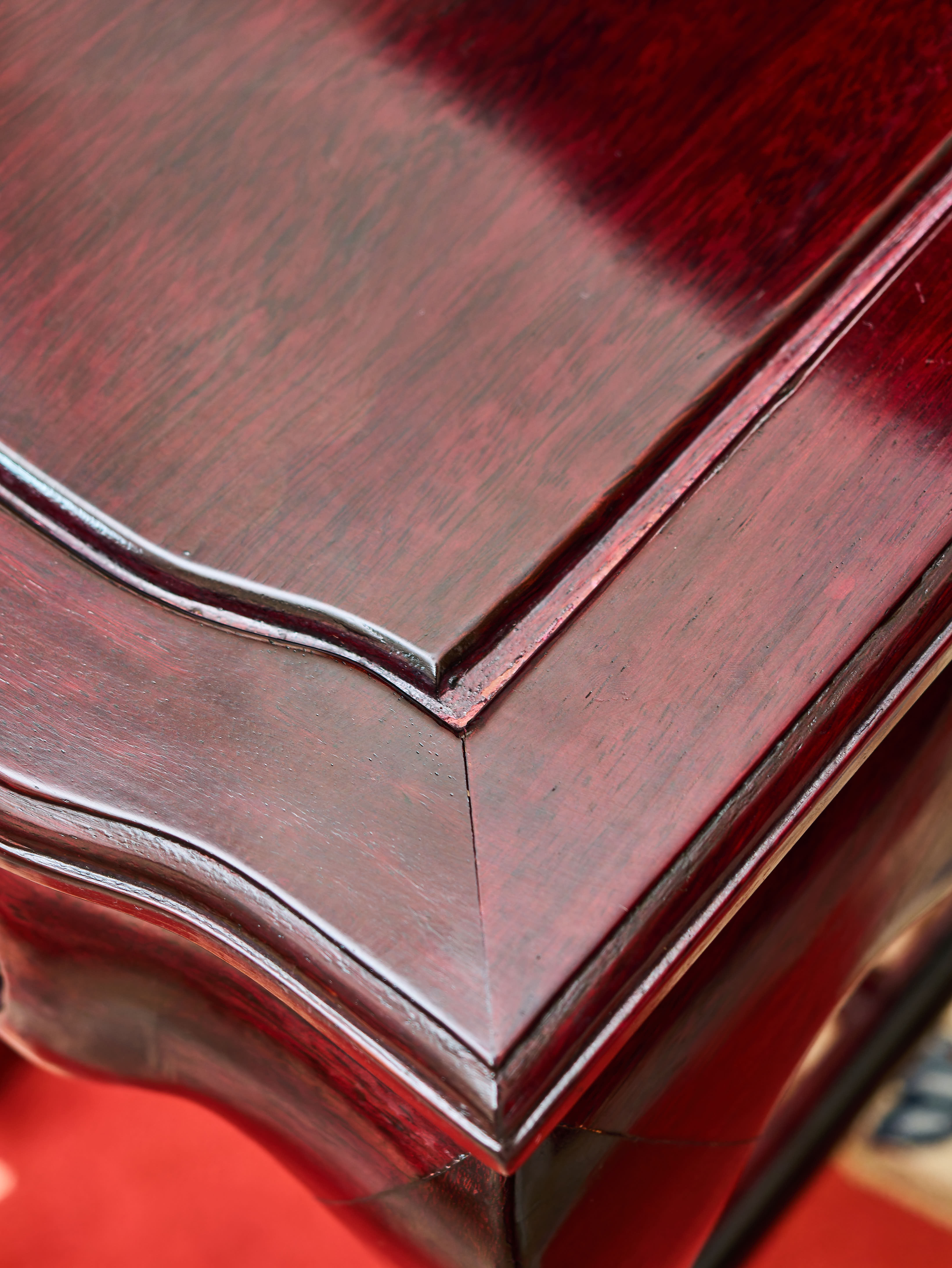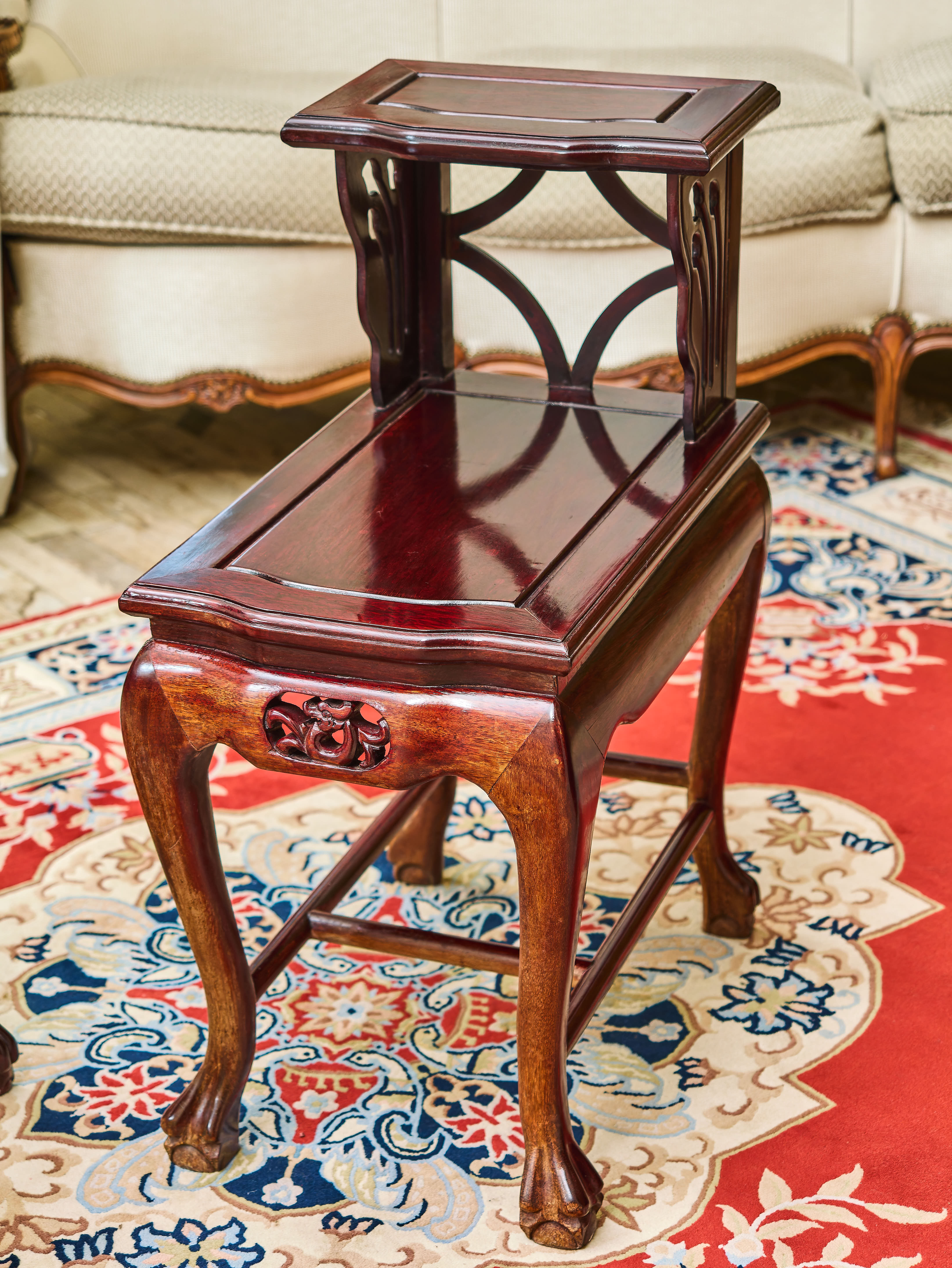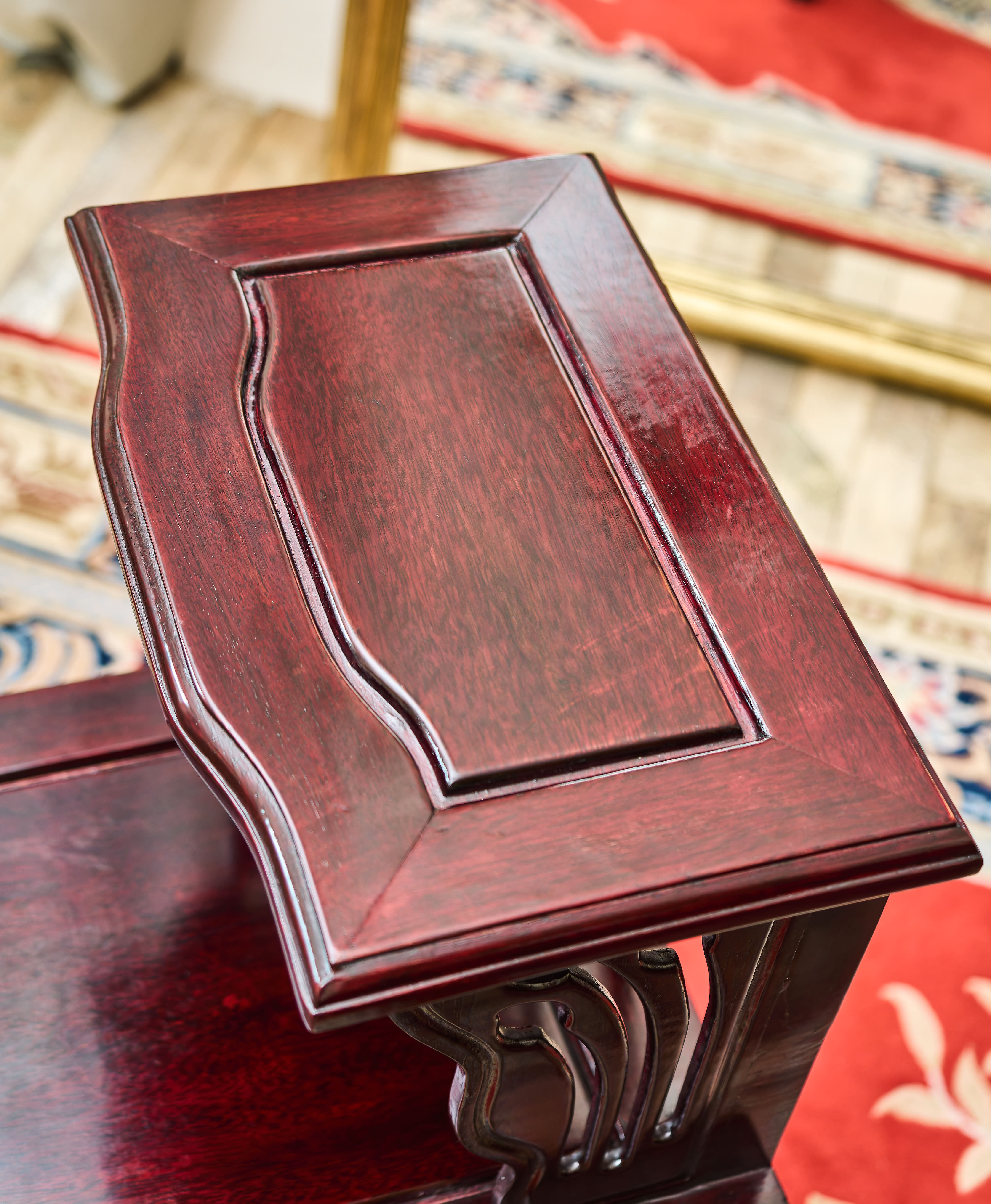 Elegantní pár čínských stolků z masivního tvrdého dřeva, ručně vyřezávaný v tradičním stylu. Stolky mají jemně profilované nohy, boční výplně s obloukovým dekorem a plastickou řezbu v čelních partiích. Povrch je ručně leštěný do hlubokého, teplého lesku, který zvýrazňuje kresbu dřeva.