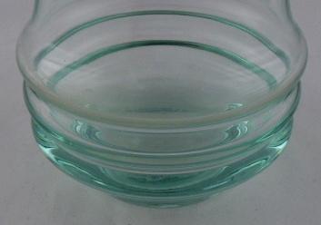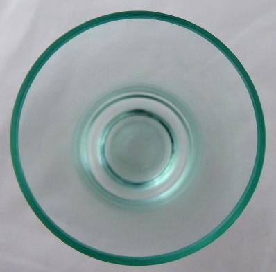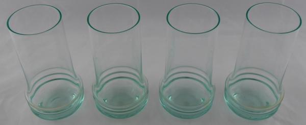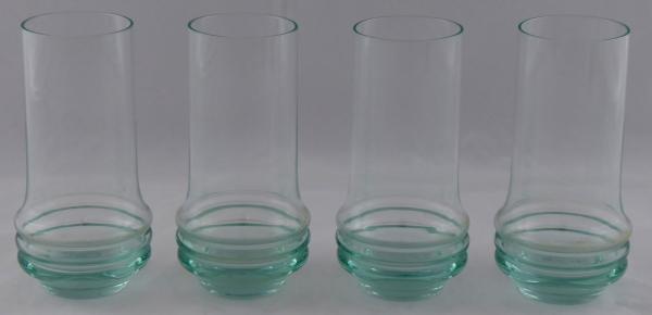 Berylové sklo. Autor designu Bruno Morbelli, Itálie vyrobila sklárna Moser. Skleničky válcovitého tvaru, v dolní části se třemi prstenci. Kulatá nízká silnostěnná podstava. Československo kolem roku 1970. Výška 15 cm.
