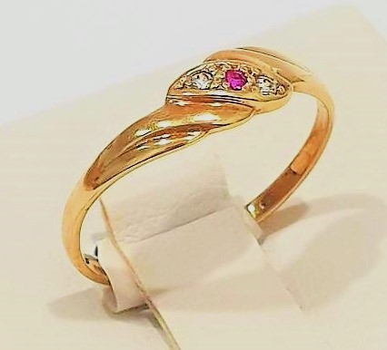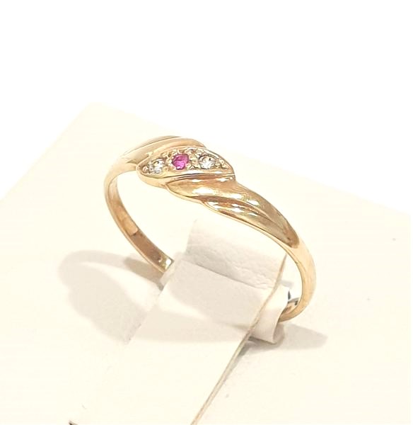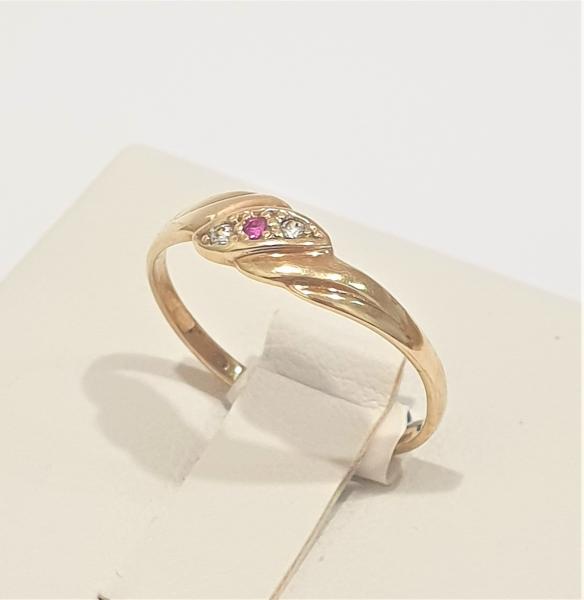 Hezký dámský zlatý prstýnek ze 14 karátového žlutého zlata se synt. rubínem a dvěmi synt. bílými lekosafíry. Tento jemný prstýnek je ve velikosti 51, váha prstýnku brutto 1,19 gramů. Prstýnek nepoškozen, nepoškrábán.