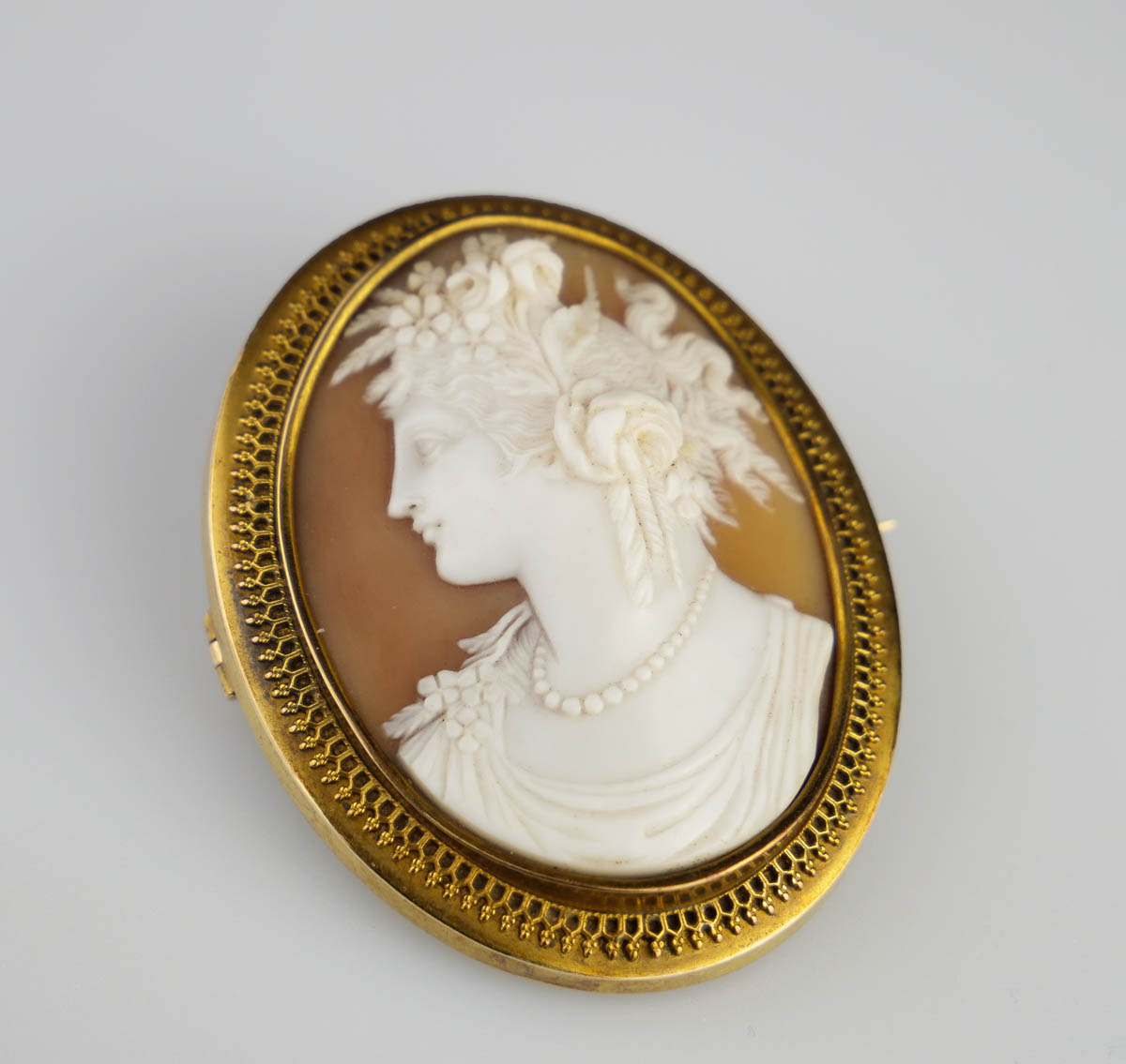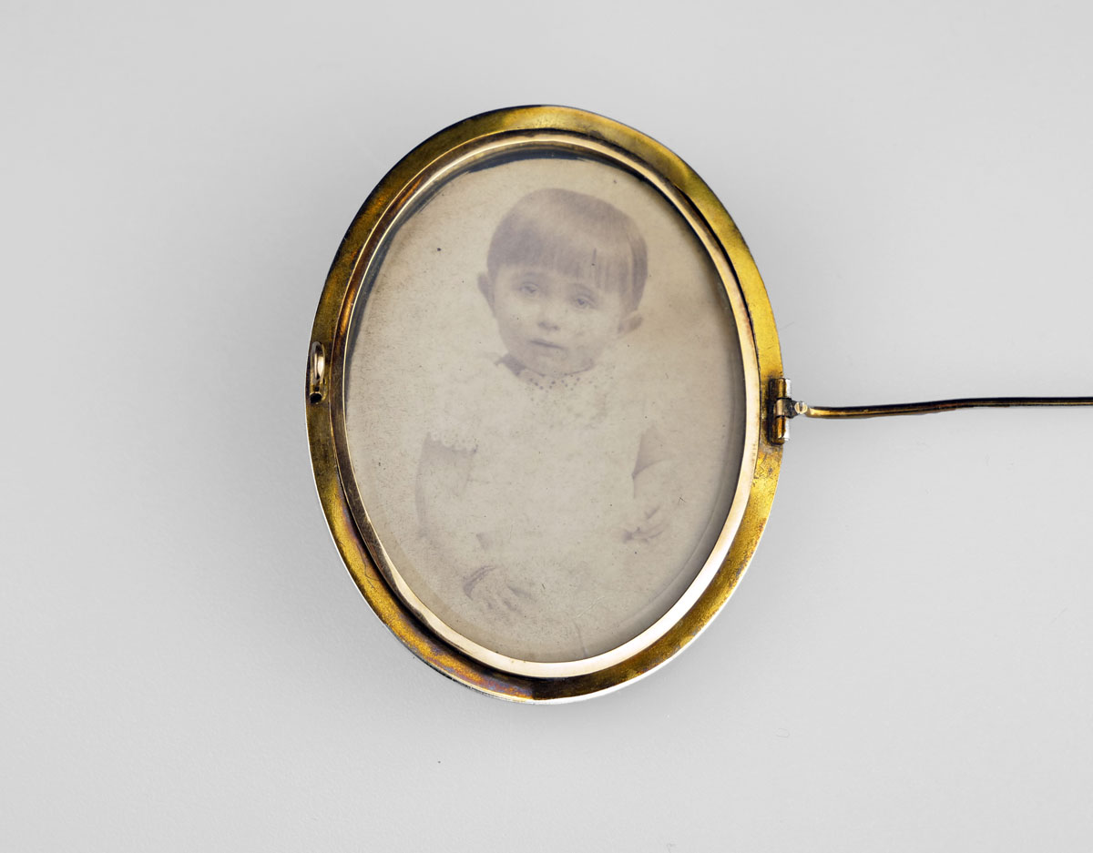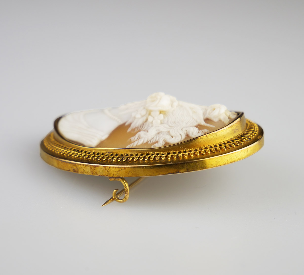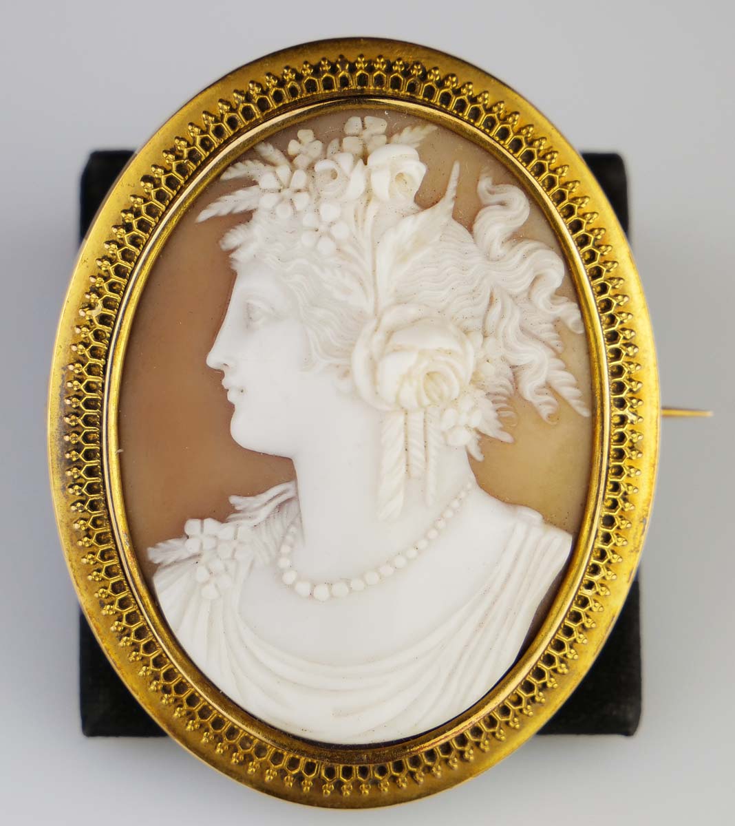 velká zlatá oválná brož s mistrovsky řezanou kamejí v mušlovině s profilem ženy v antikizujícím stylu, na zadní straně v prosklené schránce fotografie malé dívenky, Au btto 24,52 g/580/1000, Rakousko-Uhersko (Čechy), kolem r. 1880, dobový rakousko-uherský punc (liška) se značkou pražského Puncovního úřadu; rozměry 5,5 x 4,5 cm; sběratelsky zajímavé