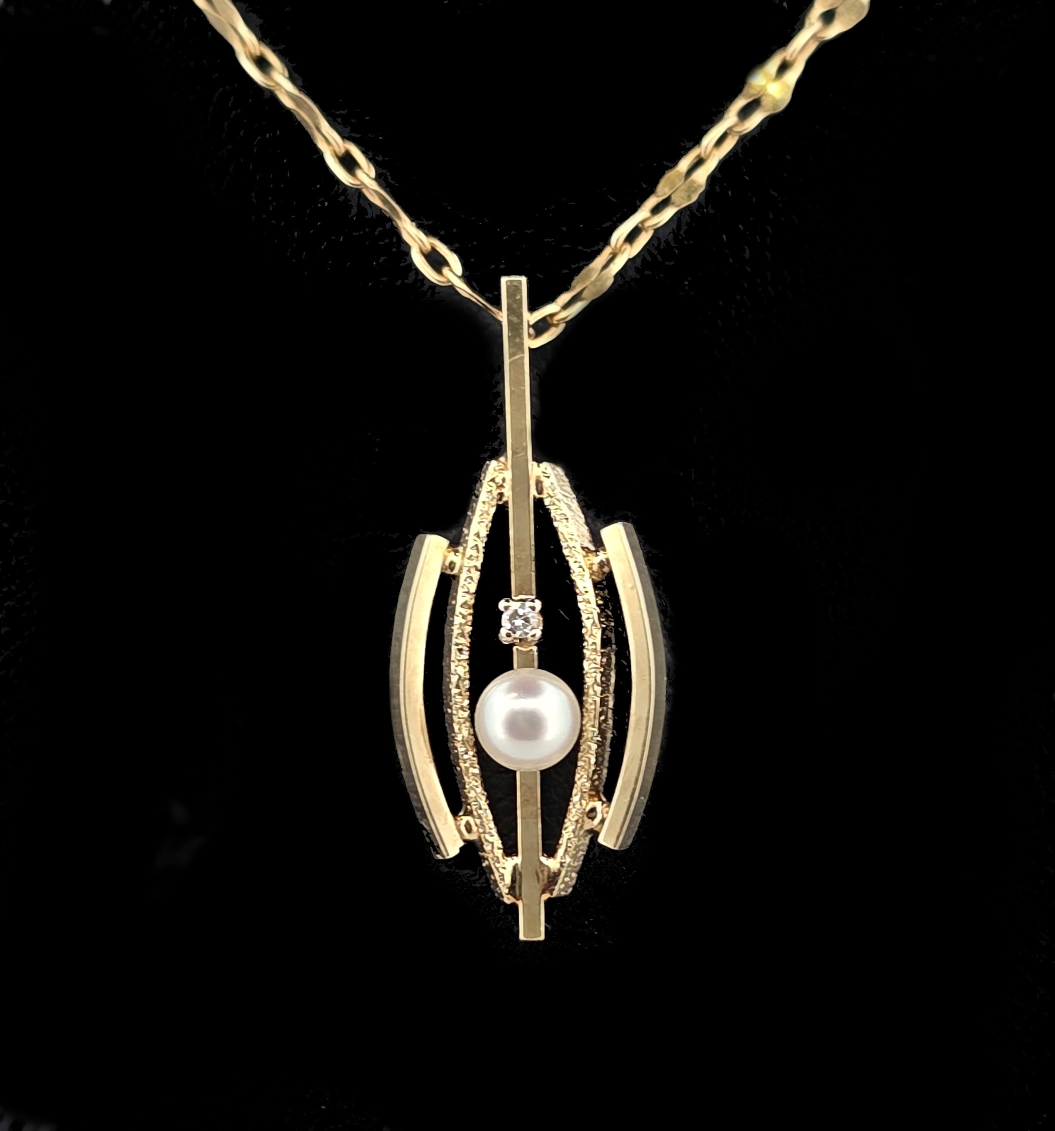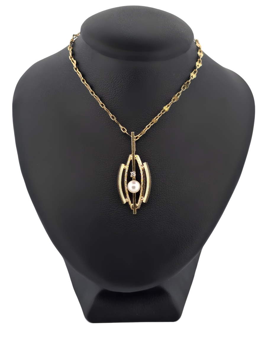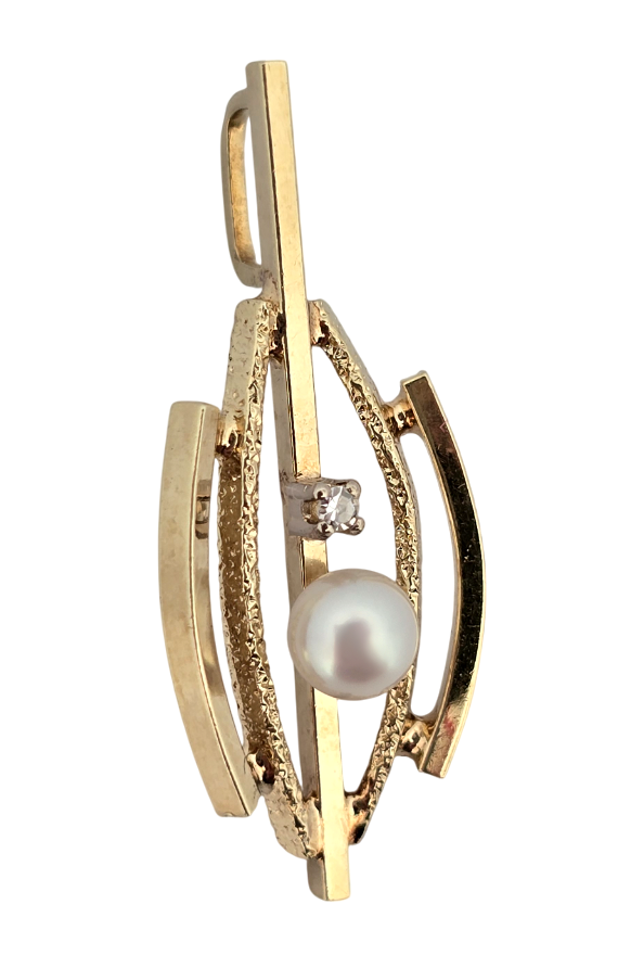 Popis: Designový starožitný zlatý přívěsek art deco s diamantem a perličkou. Diamant je přírodní, kulatého jednoduchého brusu, velmi dobré kvality, o váze cca 0,015 ct.