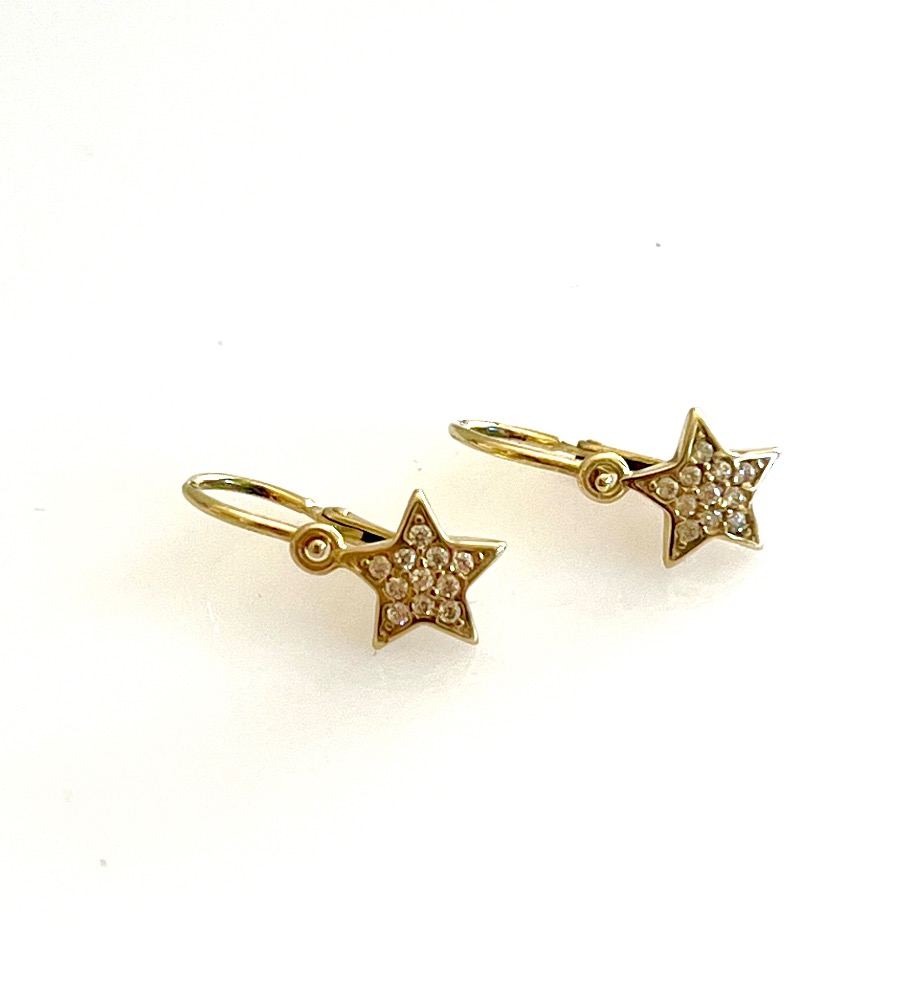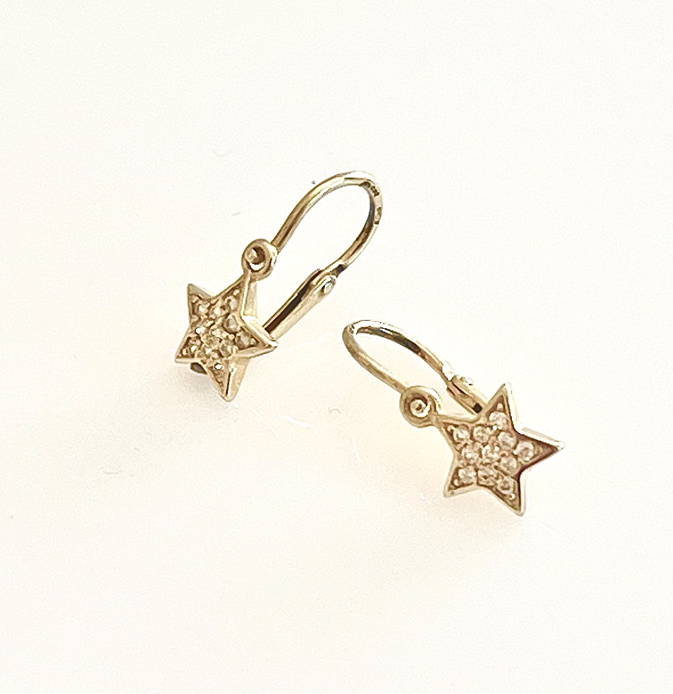 Dětské zlaté náušnice ze žlutého 14 karátového zlata se zirkony ve tvaru hvězdiček. Náušnice mají přední zapínání – ryzost AU 585/1000 váha 1,03 gramů. Celková délka náušnice 1,5 cm