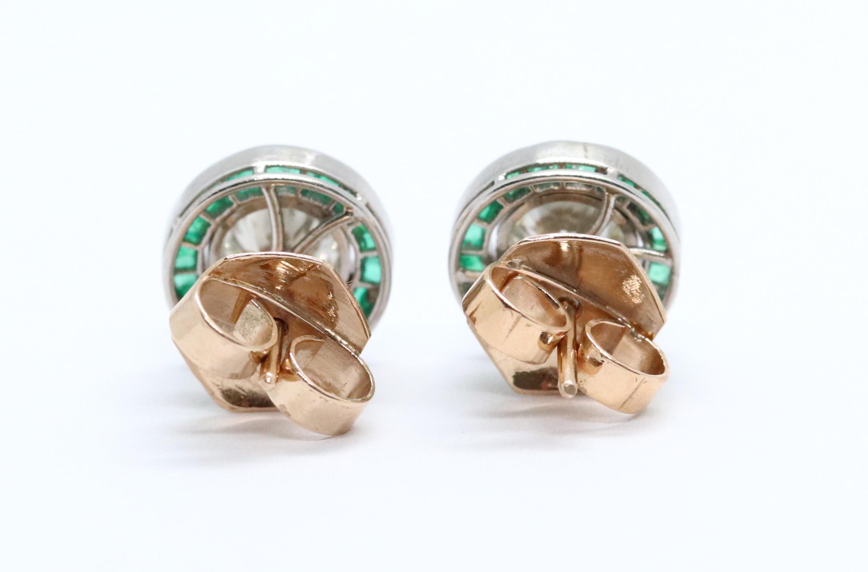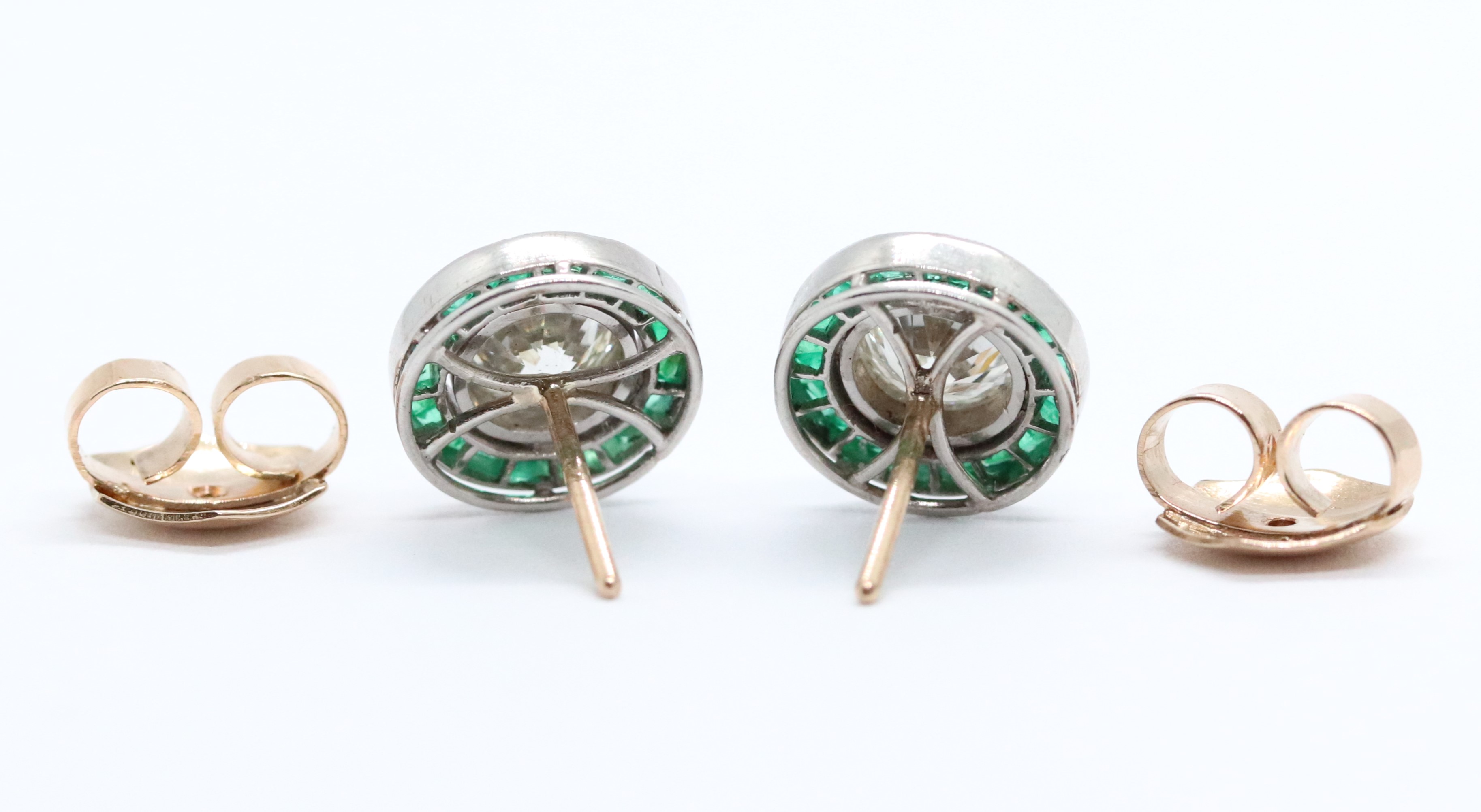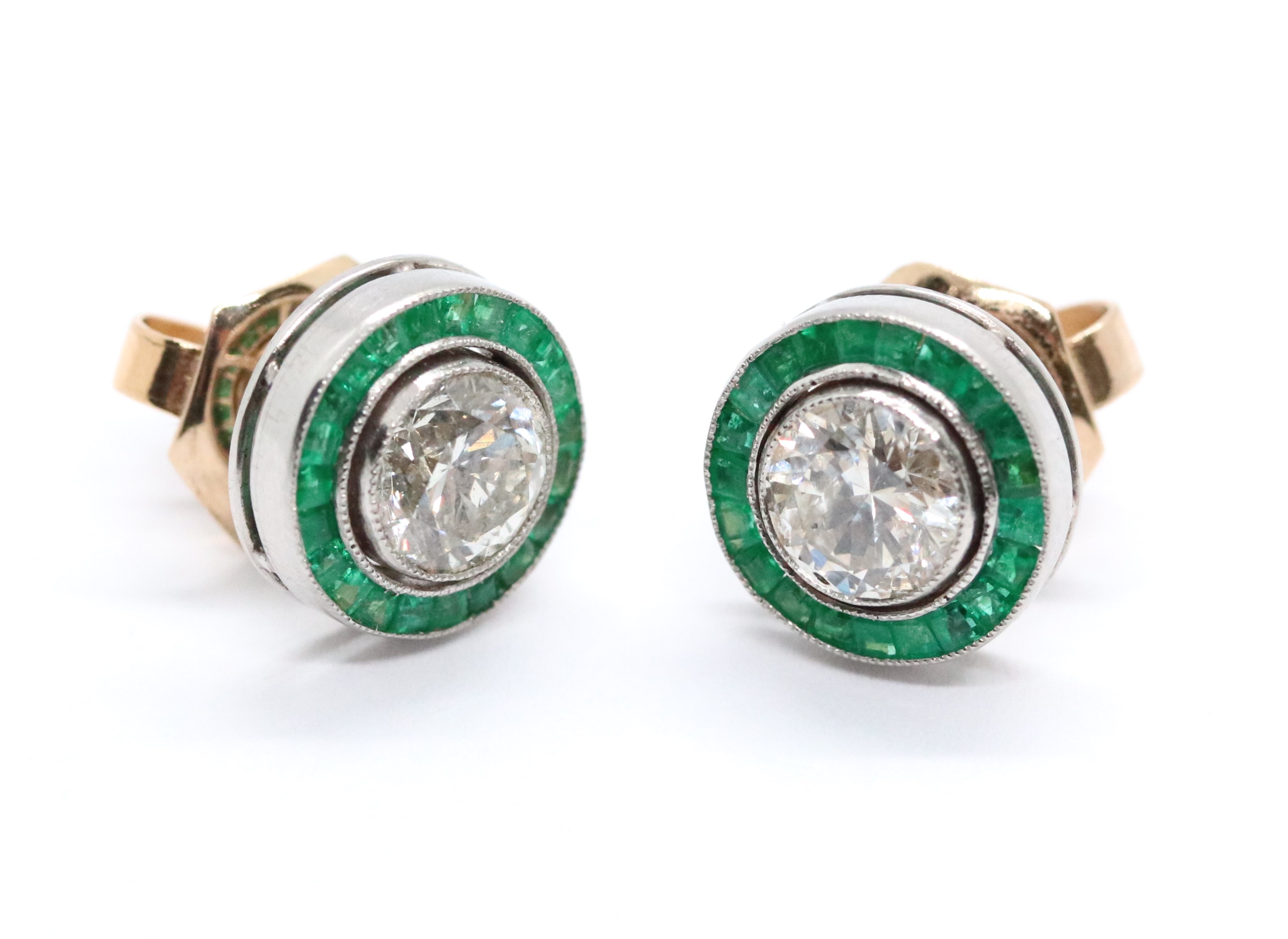 Art deco diamantové náušnice se smaragdy, kombinace platiny a zlata, Pt+Au btto 5,30g/950+750/1000, jednotlivé diamanty briliantového brusu o hmotnosti a kvalitě: 0,82 ct (čistota P 1, barva M – N) a 0,92 ct (čistota SI 2, barva M – N), přírodní smaragdy o celkové hmotnosti 0,84 ct. Západní Evropa, 30. léta 20. století, vyhotoven znalecký posudek a atest puncovního úřadu; průměr každé náušnice 1,1 cm