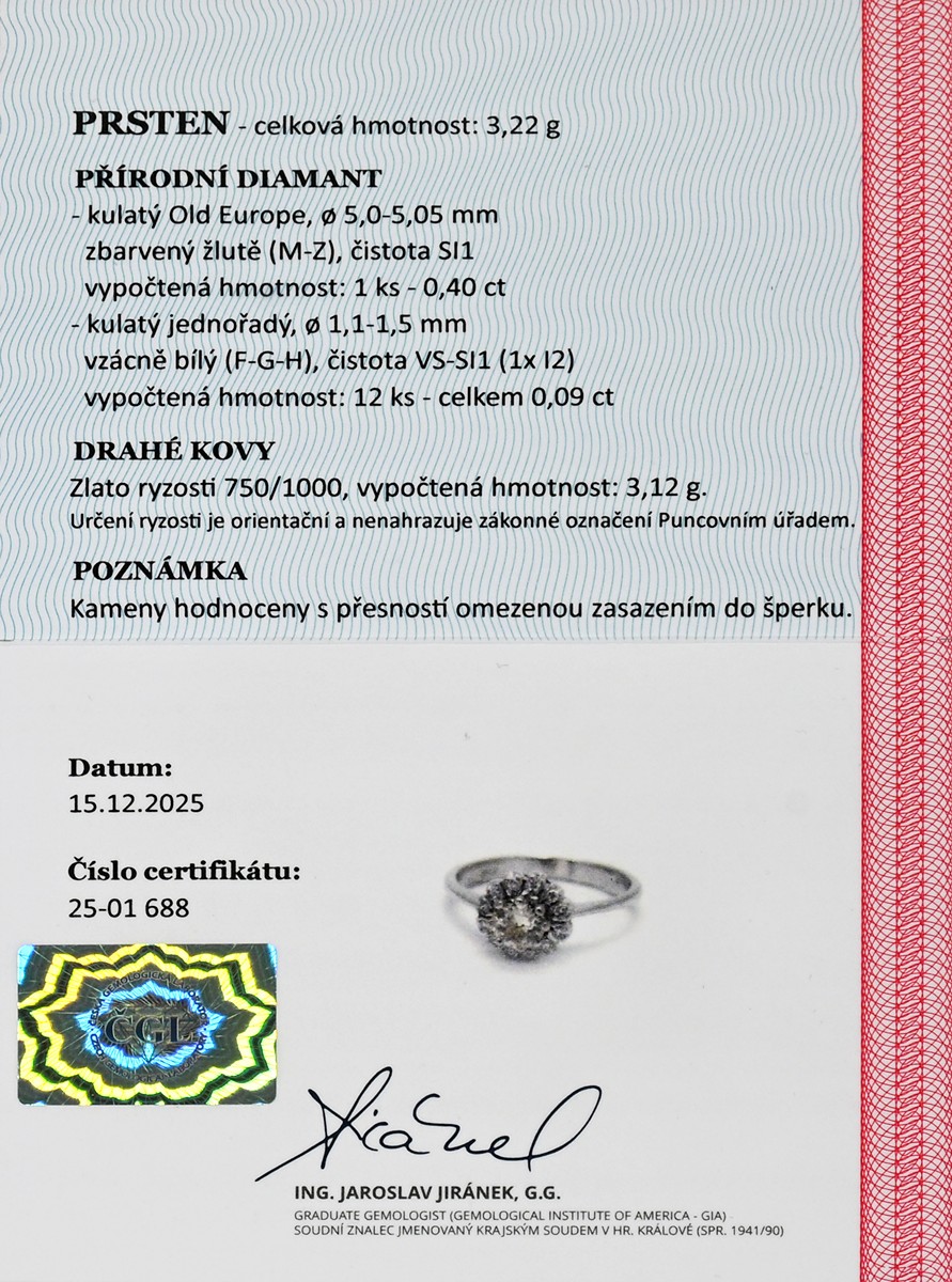– 1 ks přírodního diamantu Old Europe, hmotnost 0,40 ct, zbarvení žluté (M–Z), čistota SI1, průměr 5,0–5,5 mm,