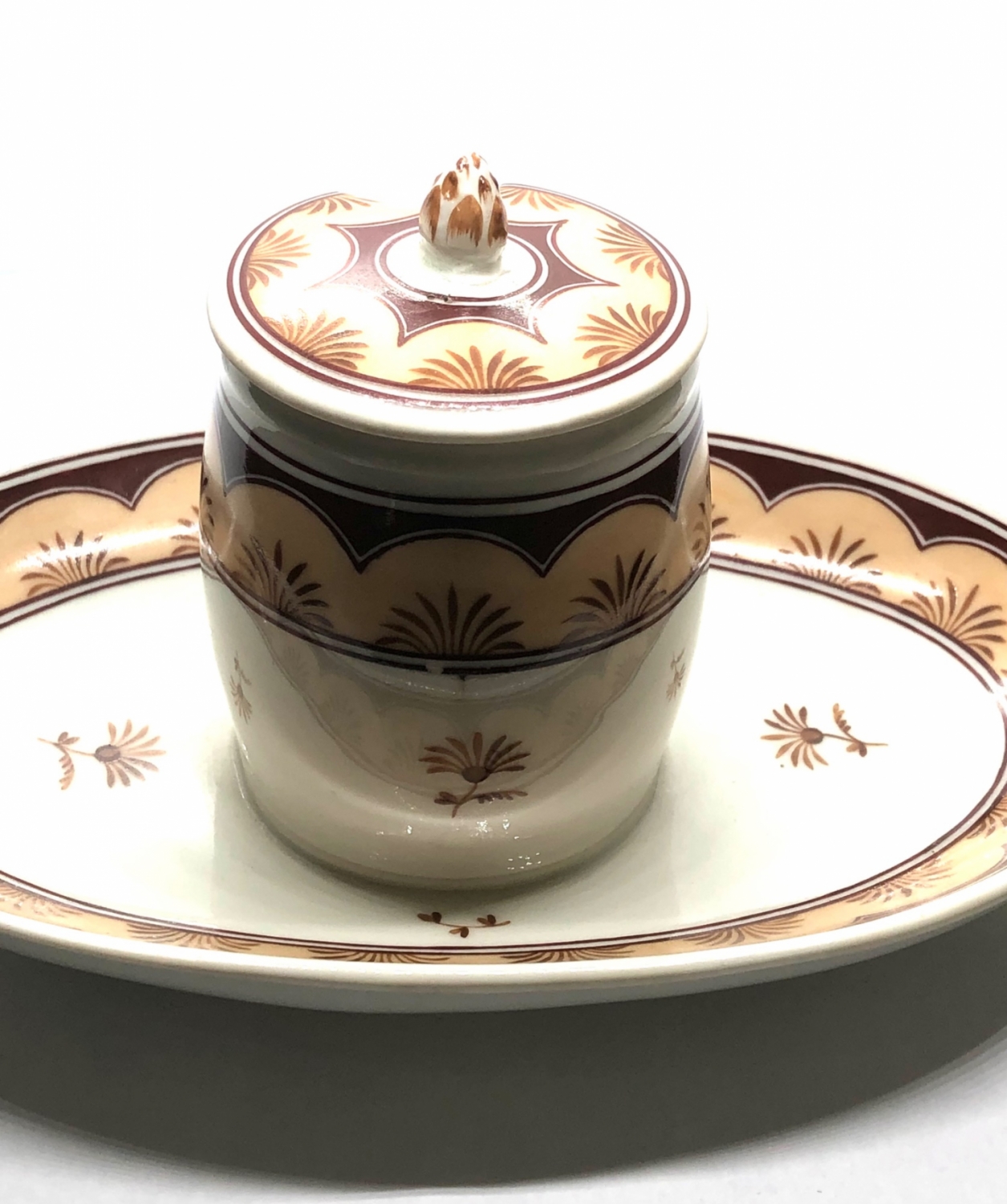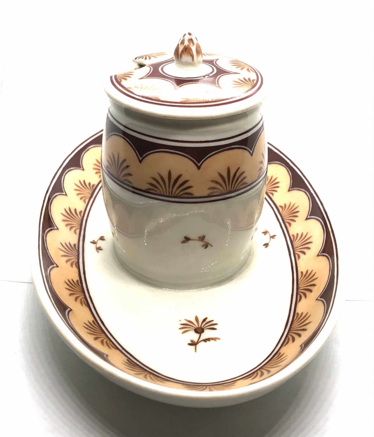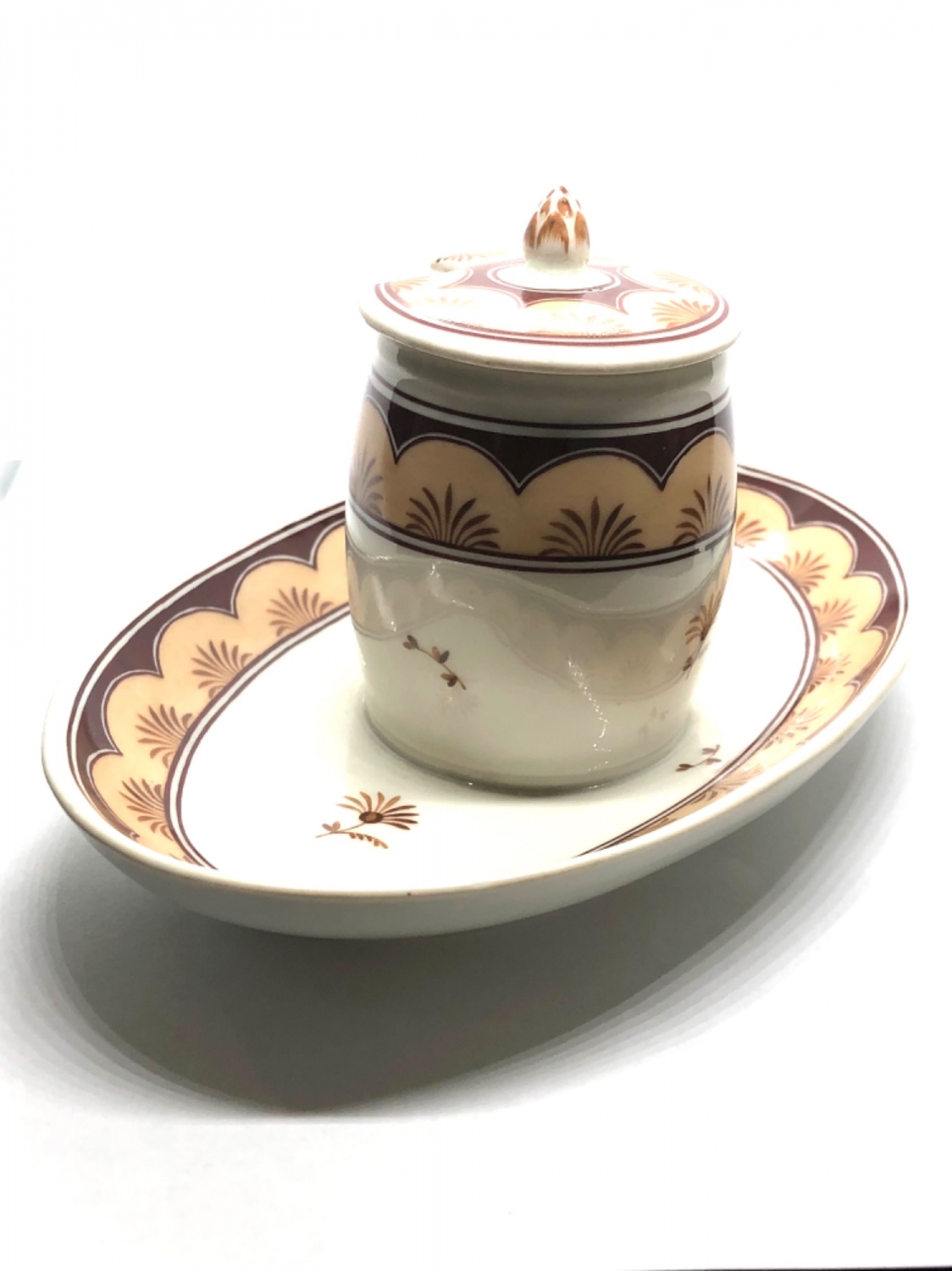 Porcelánová dóza (možno jako cukřenka) s pokličkou a napevno připojeným podšálkem, Vídeň, 1852; výška 10,5 cm, šíře 19 cm, délka 12 cm, průměr 5,5 cm.