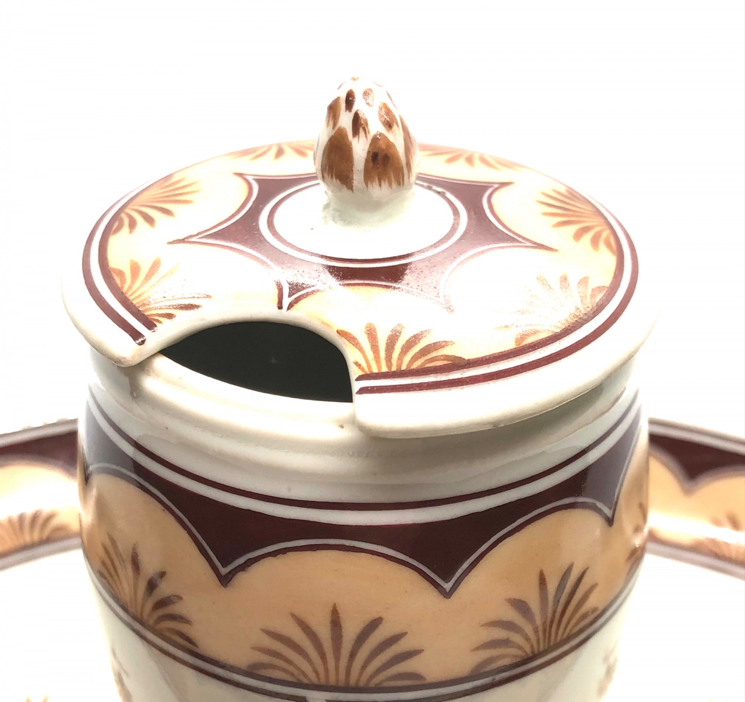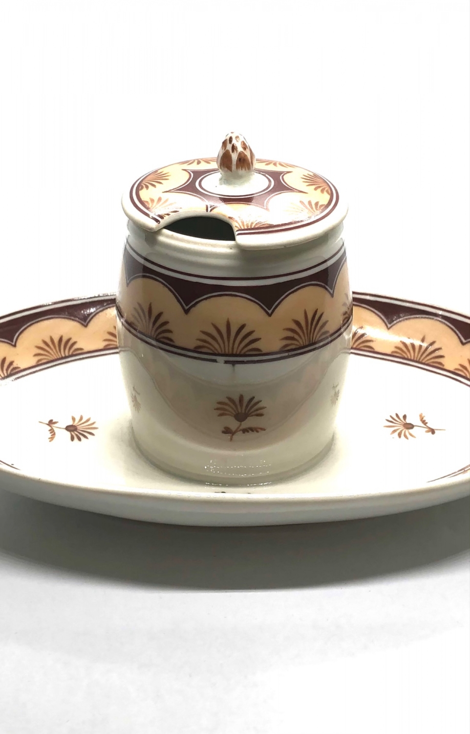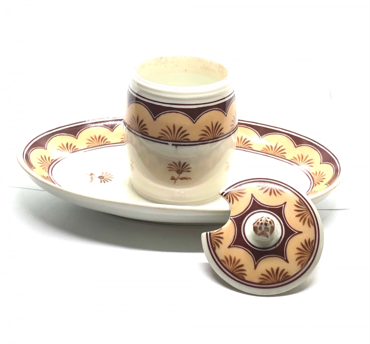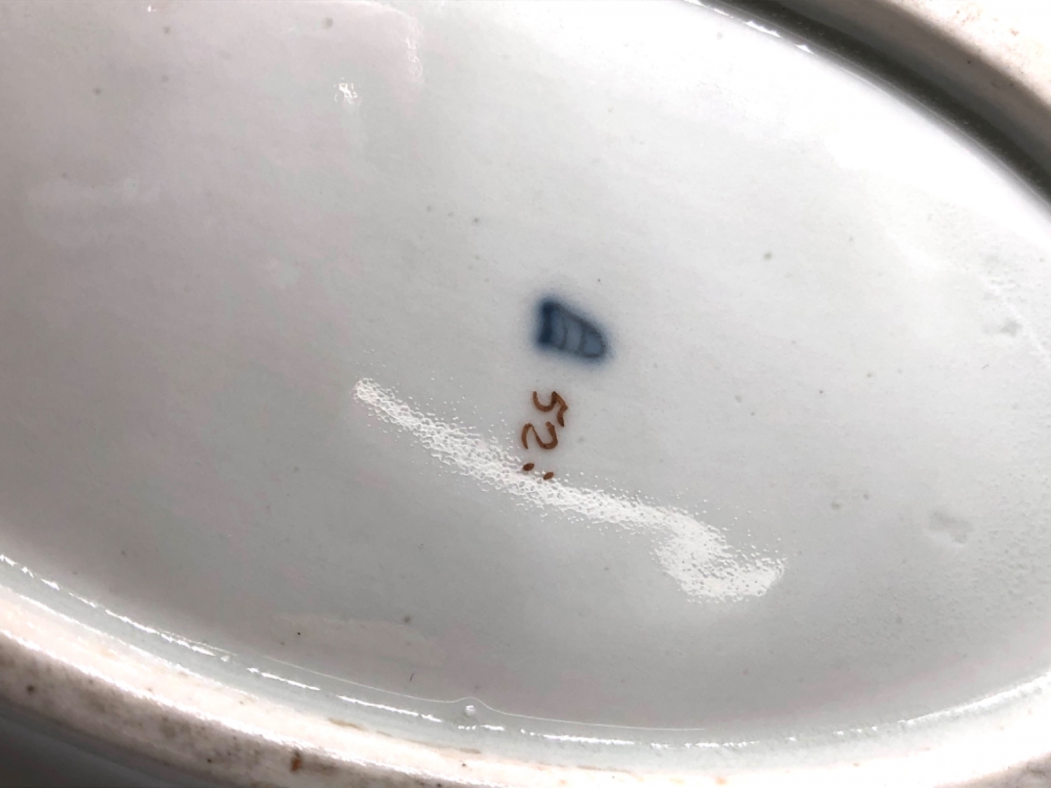 Porcelánová dóza (možno jako cukřenka) s pokličkou a napevno připojeným podšálkem, Vídeň, 1852; výška 10,5 cm, šíře 19 cm, délka 12 cm, průměr 5,5 cm.