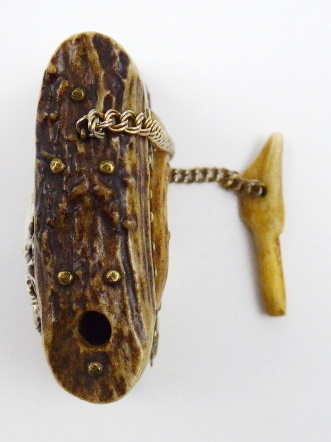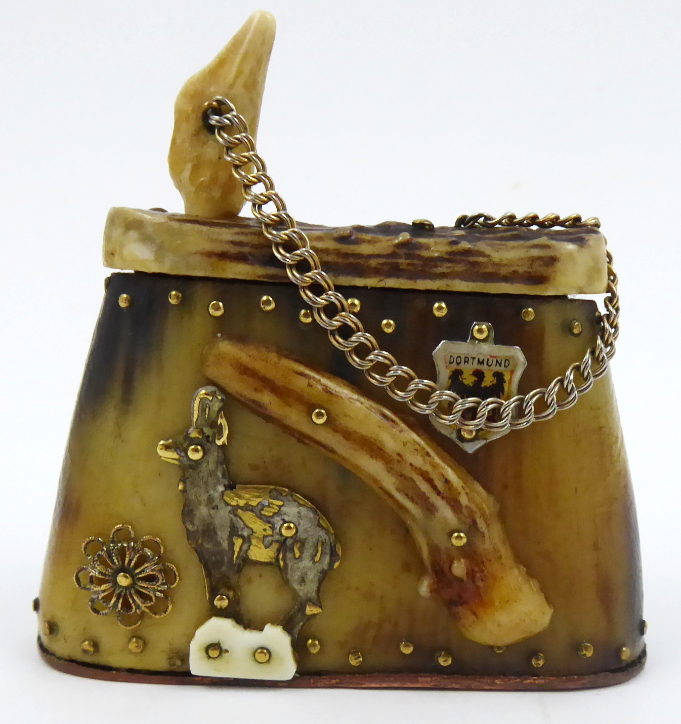 Rohovina, paroží, mosaz, bílý kov a email. Dózička na šňupavý tabák s reliéfními loveckými atributy. Na jedné straně je zachycen kamzík na skalním výběžku, na druhé pak srnčí hlava s loveckou puškou, brašnou a dalekohledem ve věnečku složeném z ratolestí. Dekoraci obohacují jednotlivé znaky německých měst a obcí s honitbou či mysliveckými spolky vybarvené emailovými barvami. K dózičce připojen kovový řetízek na zavěšení. Německo, minulé století. Rozměr bez řetízku na zavěšení: 8 cm x 7,5 cm.