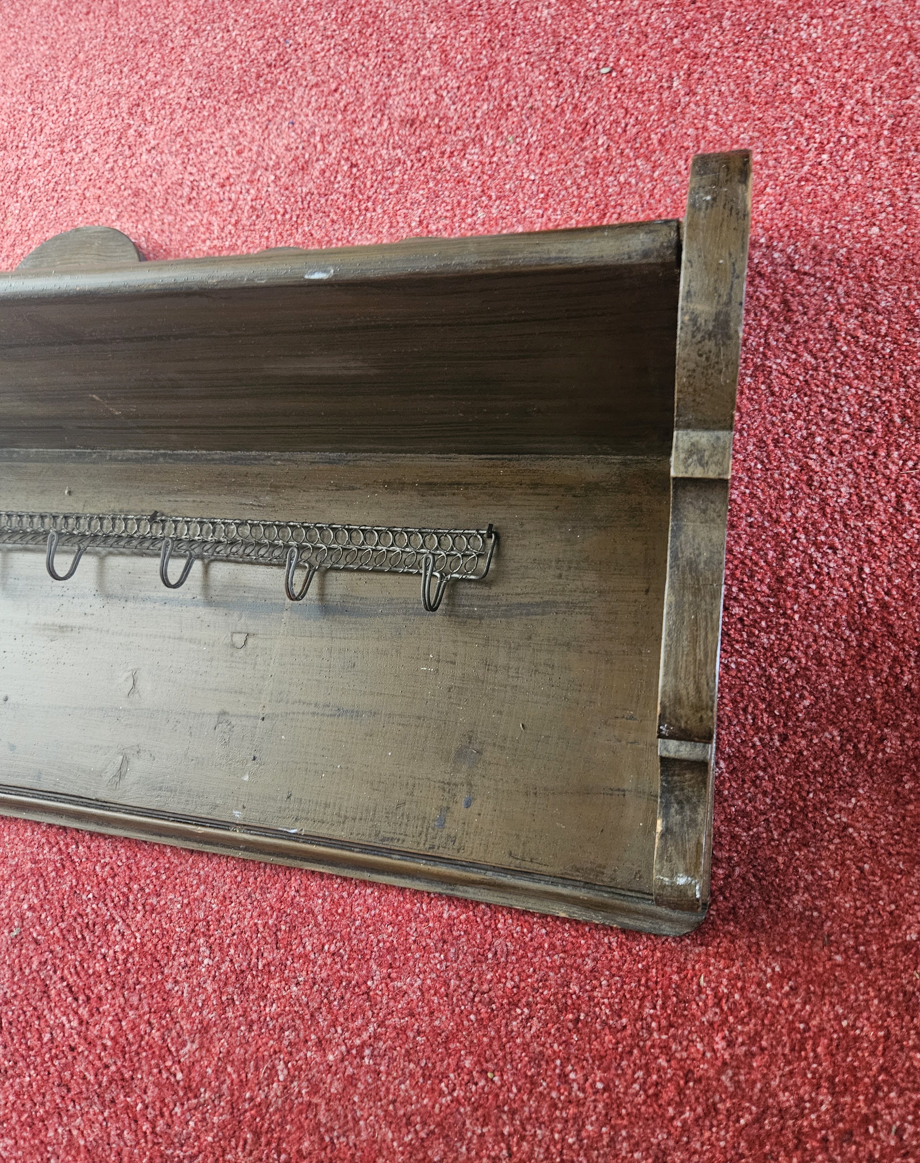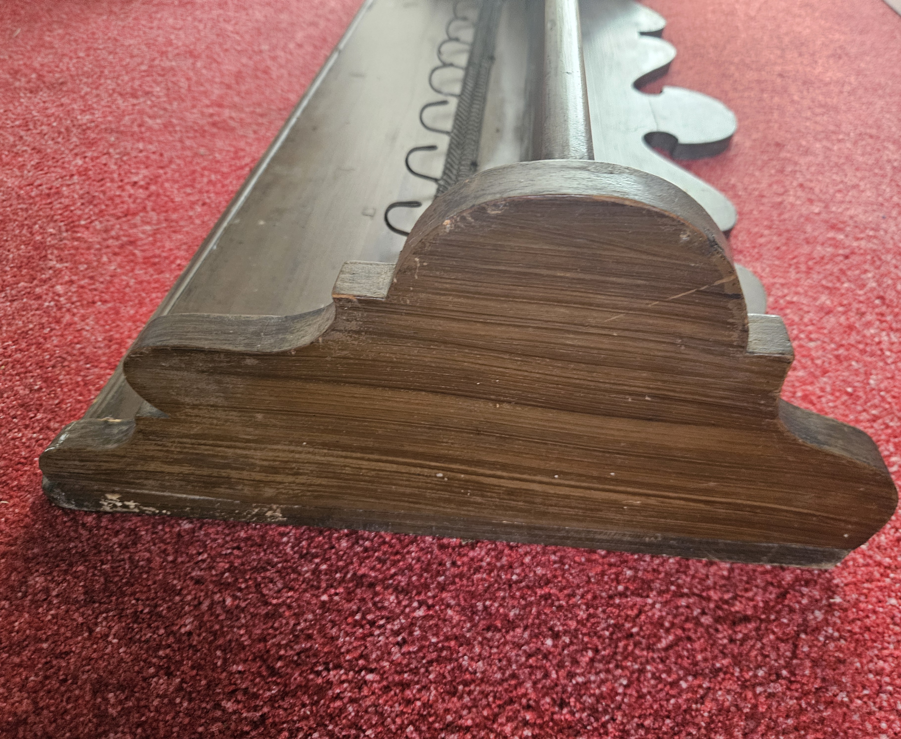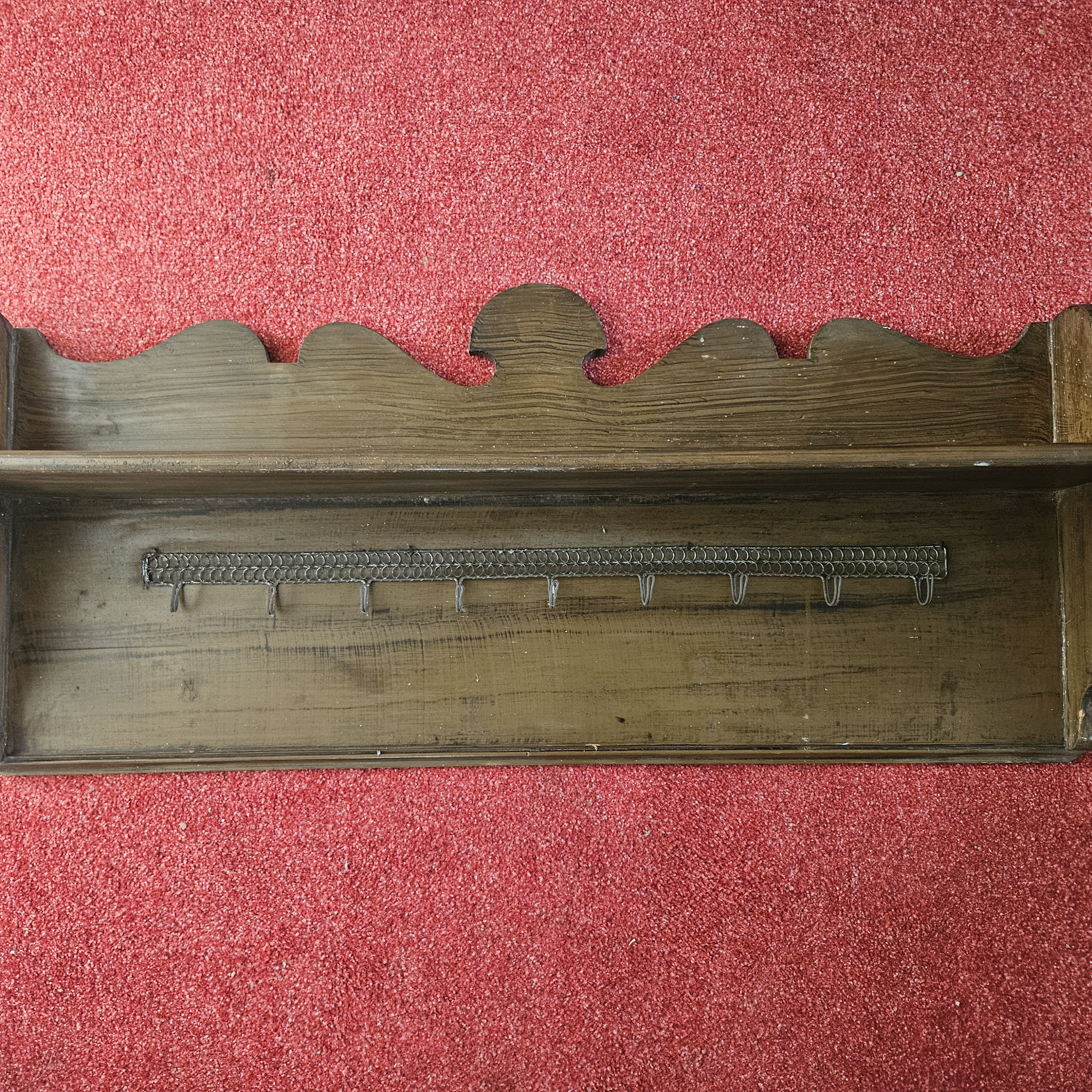 Starožitná dřevěná police z masivního dřeva, fládrovaný vzhled, horní středová ozdoba již historicky podlepena viz foto, z přední strany není úprava vidět. Police v původním stavu, nyní nerestaurováno.
