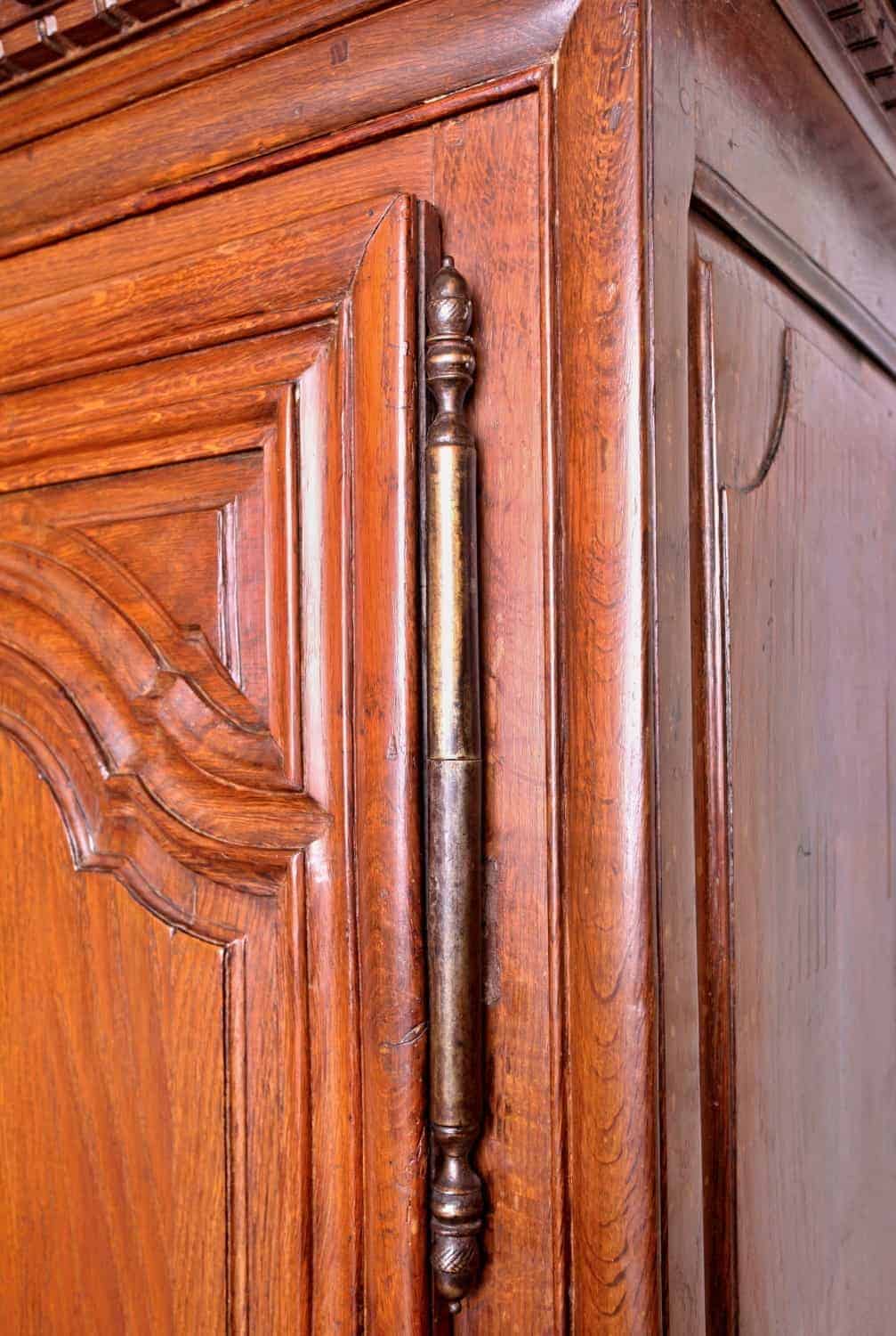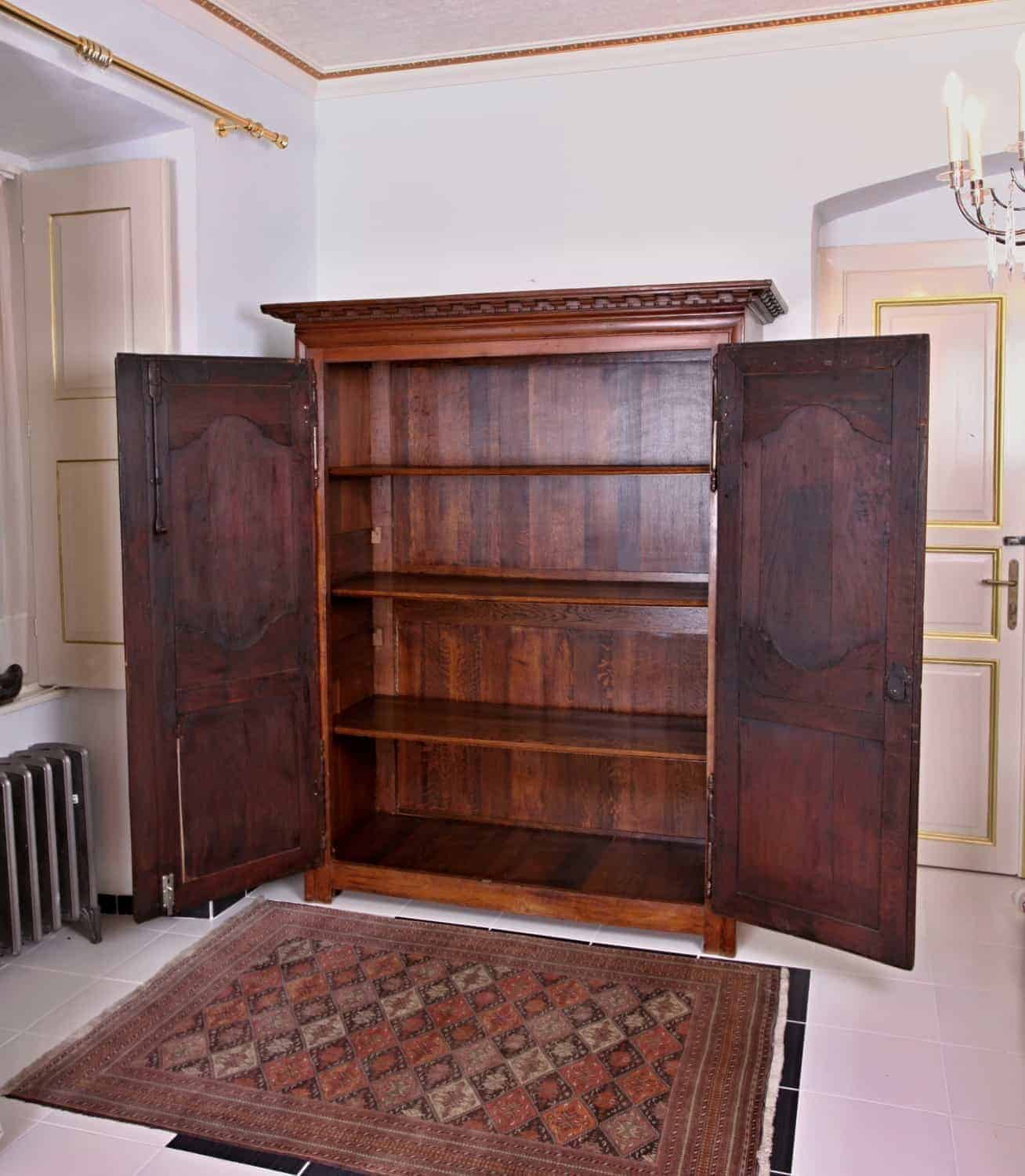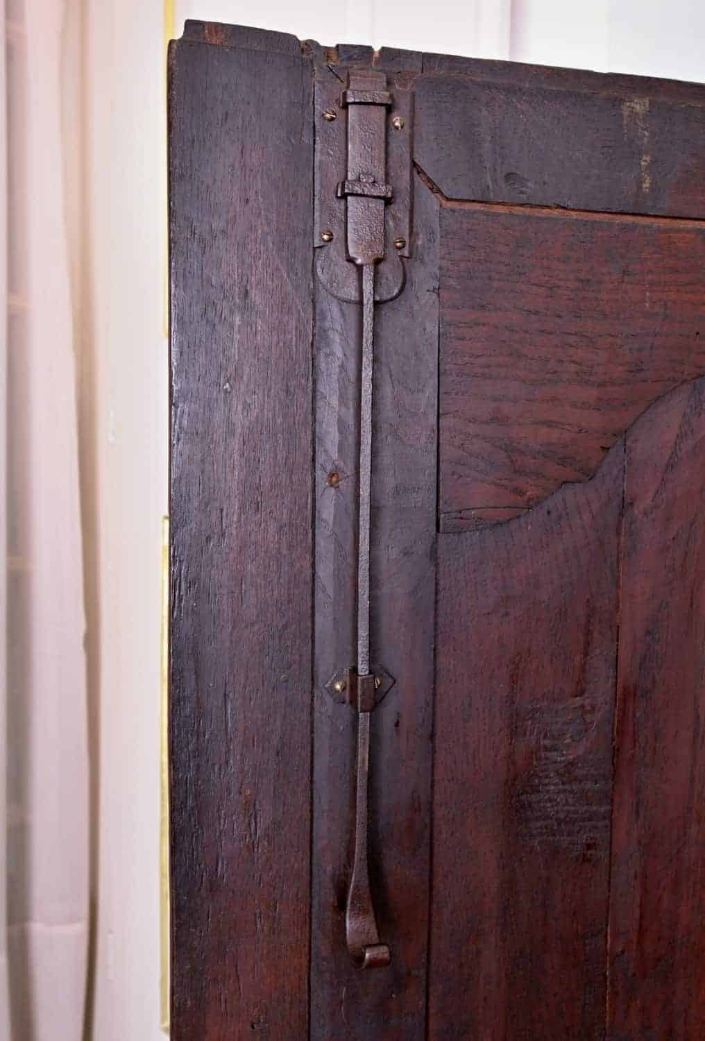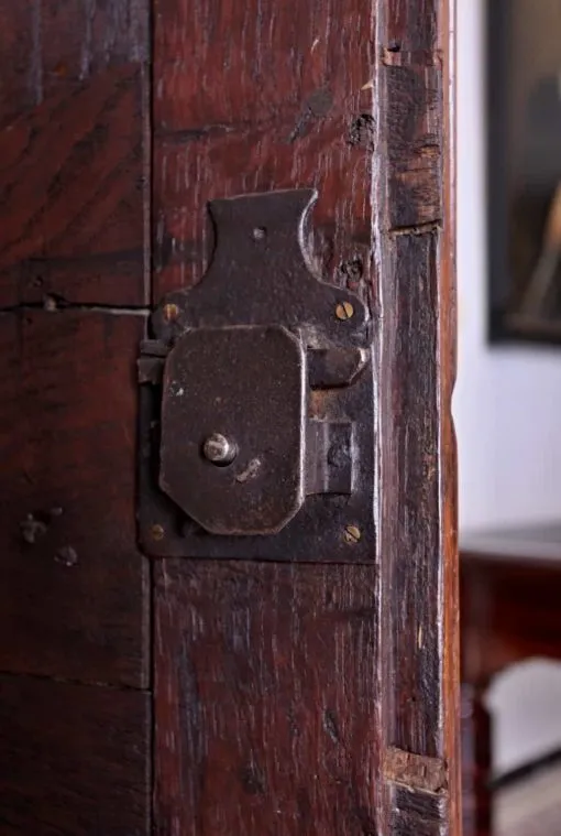 Skříň z dubového masivu. Po kompletním zrestaurování v odborné truhlářské dílně. Originální kování. Zámek funkční a klíč součástí. Bez červotoče. Skříň byla vyrobena v druhé polovině 18. století.