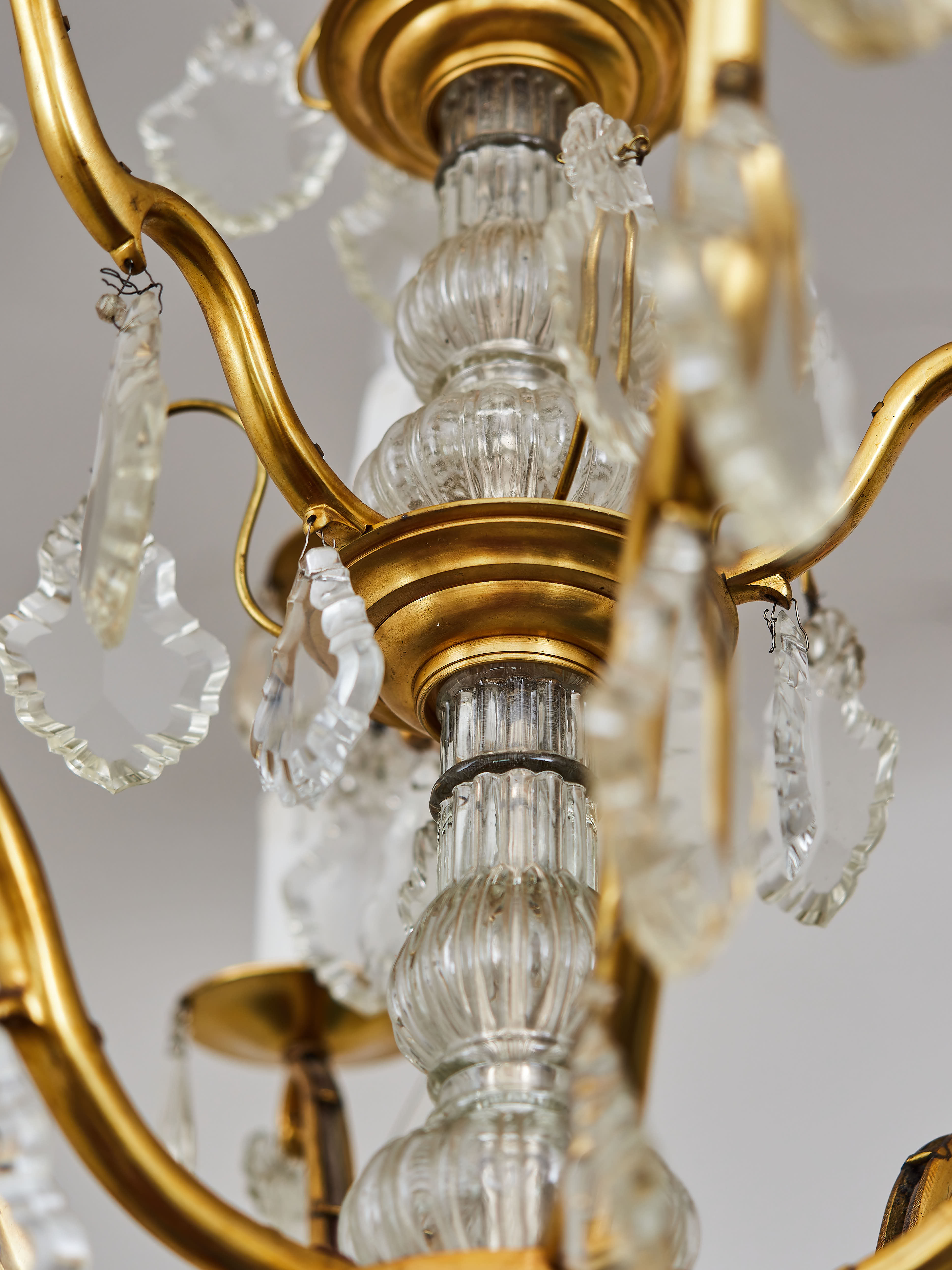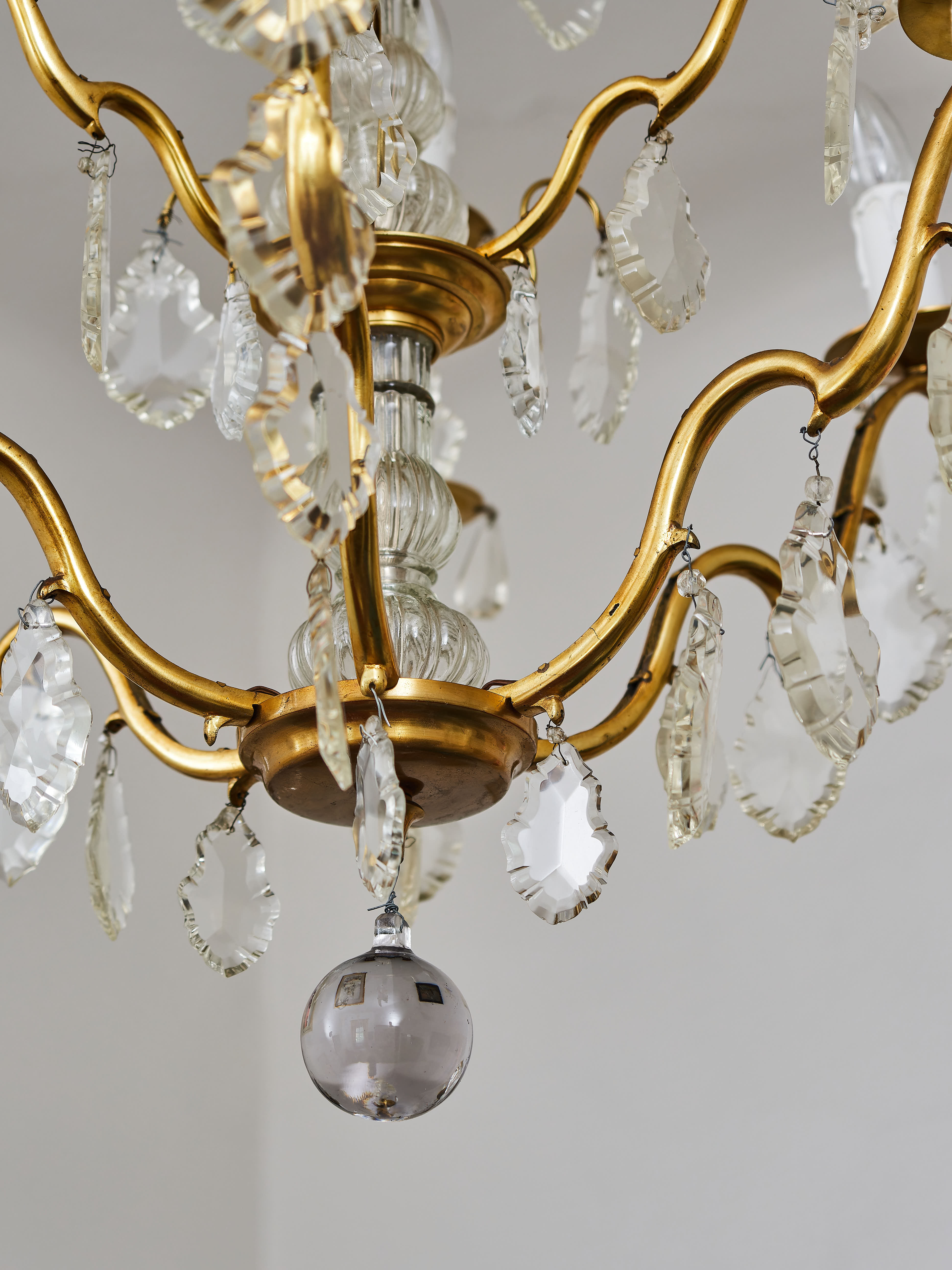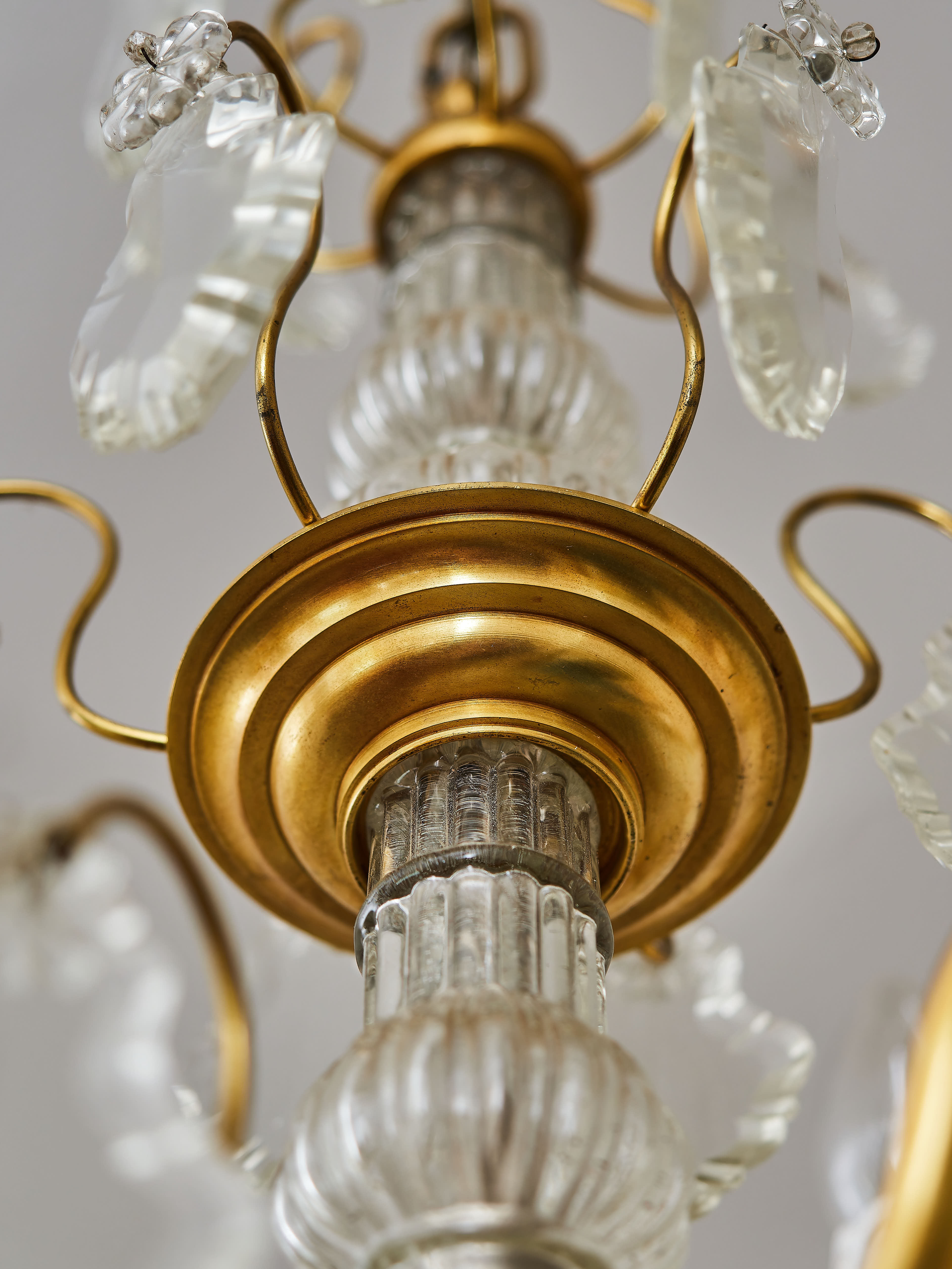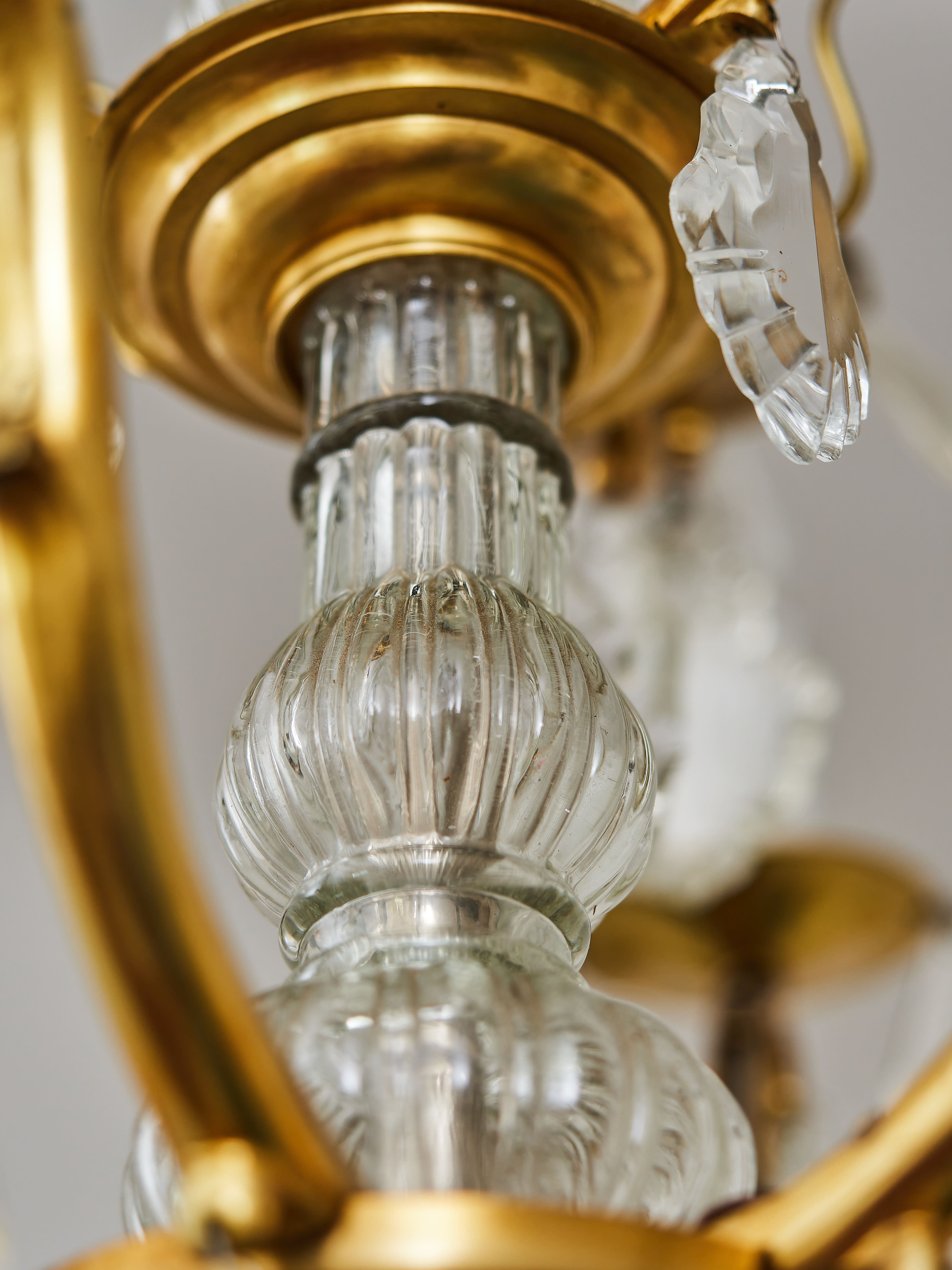 Nádherný lustr v decentním rokokovém stylu Ludvíka XV. Tělo lustru je vyrobeno z leštěné mosazi a zdobené ručně broušenými a leštěnými ověsy z olovnatého křišťálu. Lustr má 6 ramen ve spodní části a 4 ramena ve vrchní části, celkem 10 ramen umožňuje použití i ve větší místnosti. Ramena jsou na klasické svíčkové žárovky s paticí E14 do 40W – vhodné jsou normální, halogenové i led žárovky. Šešule (krytky objímek) imitují stékající vosk na svíčkách.