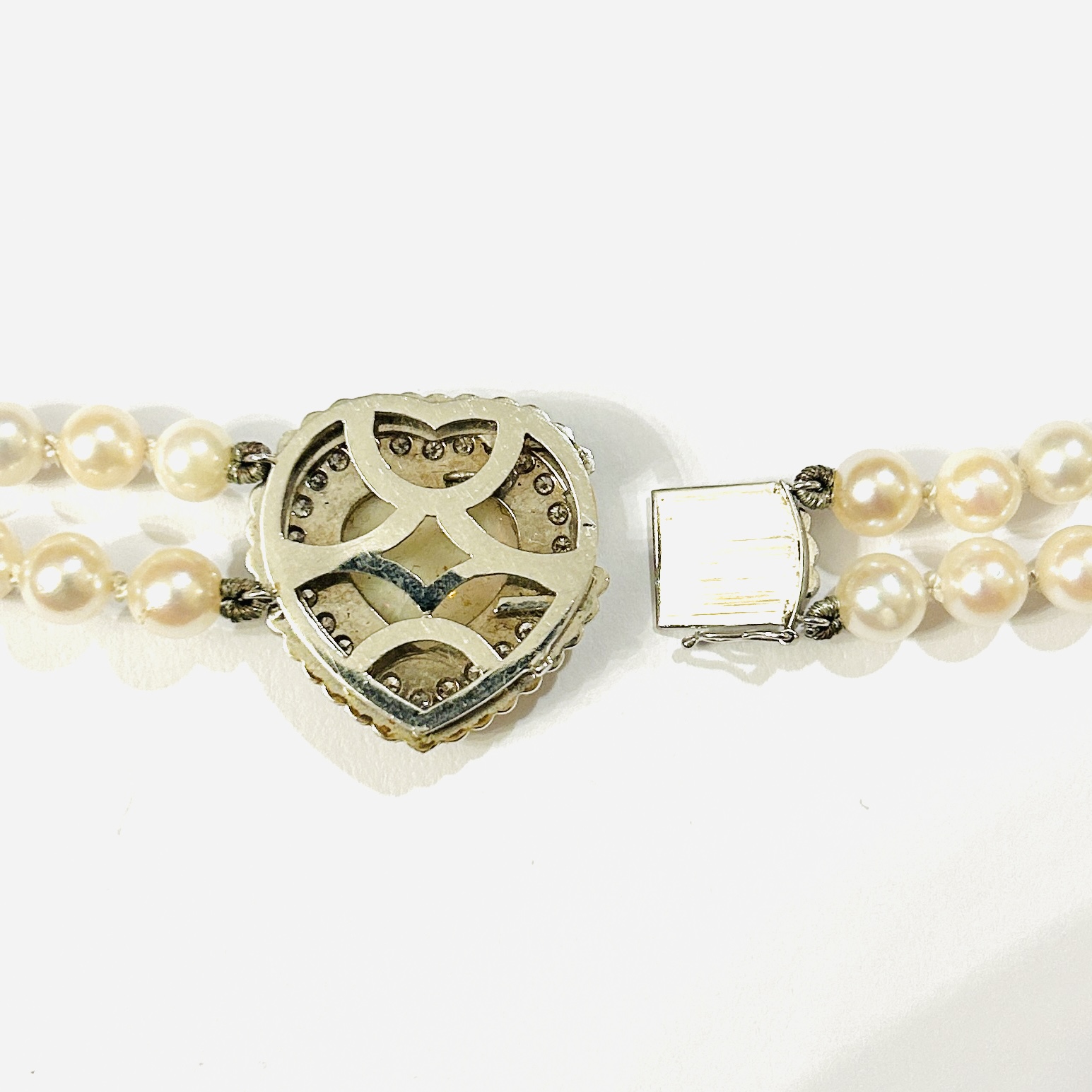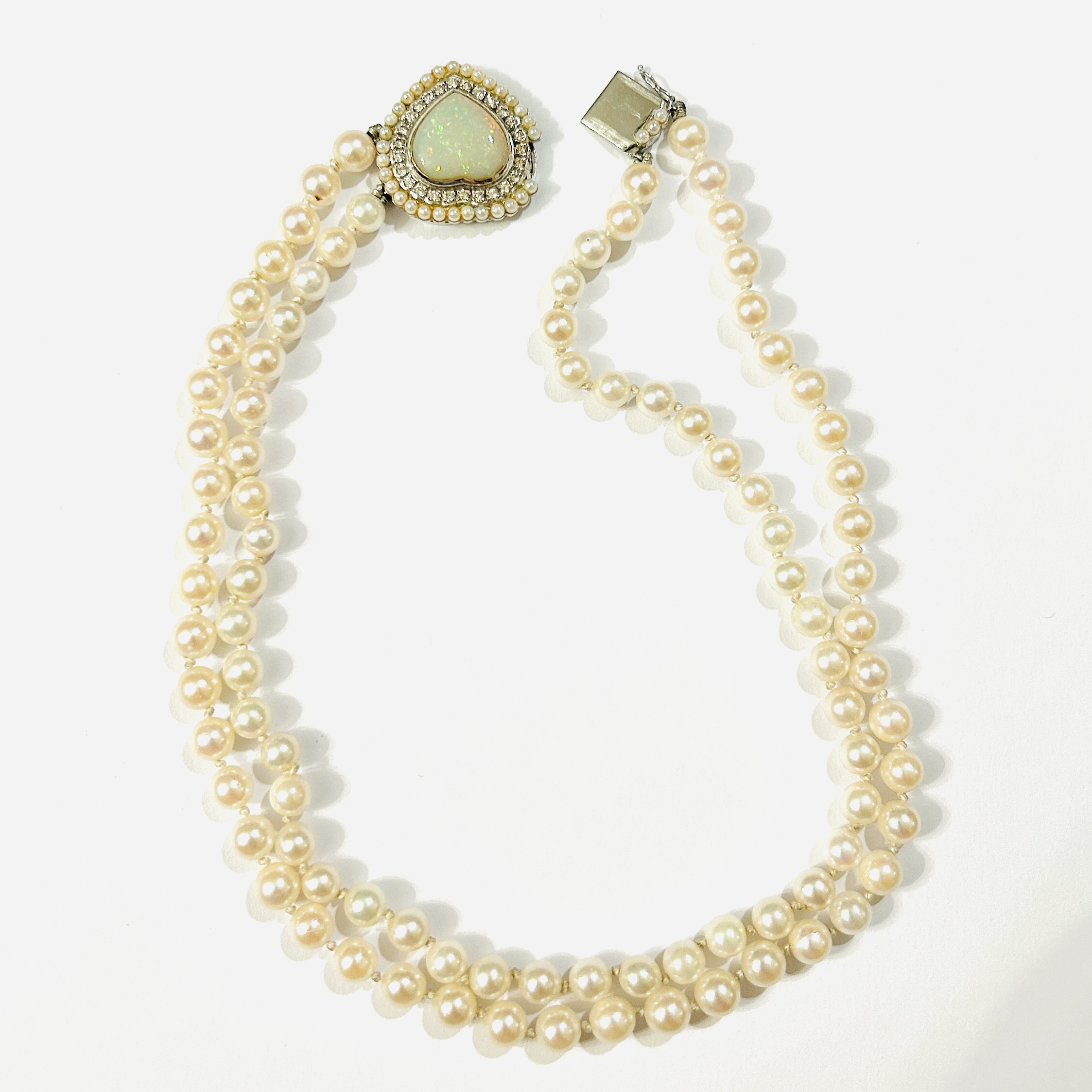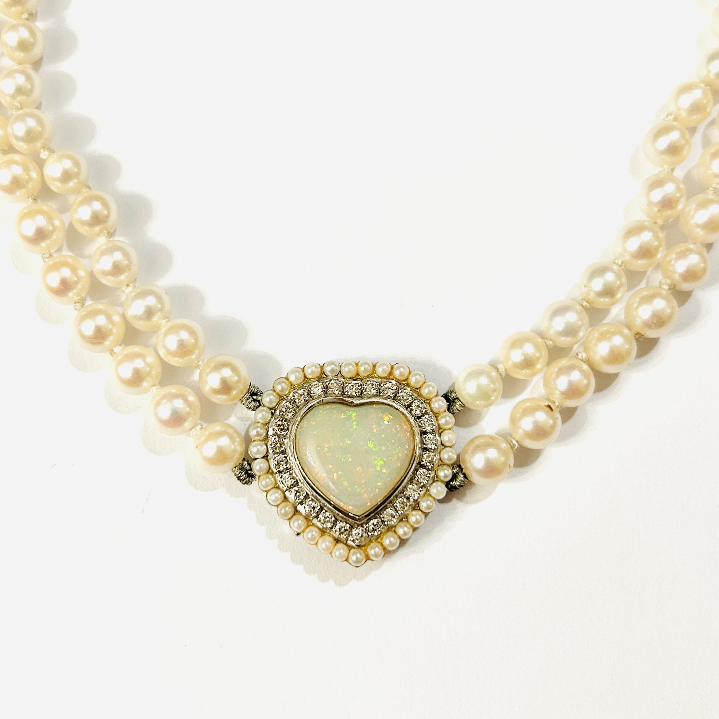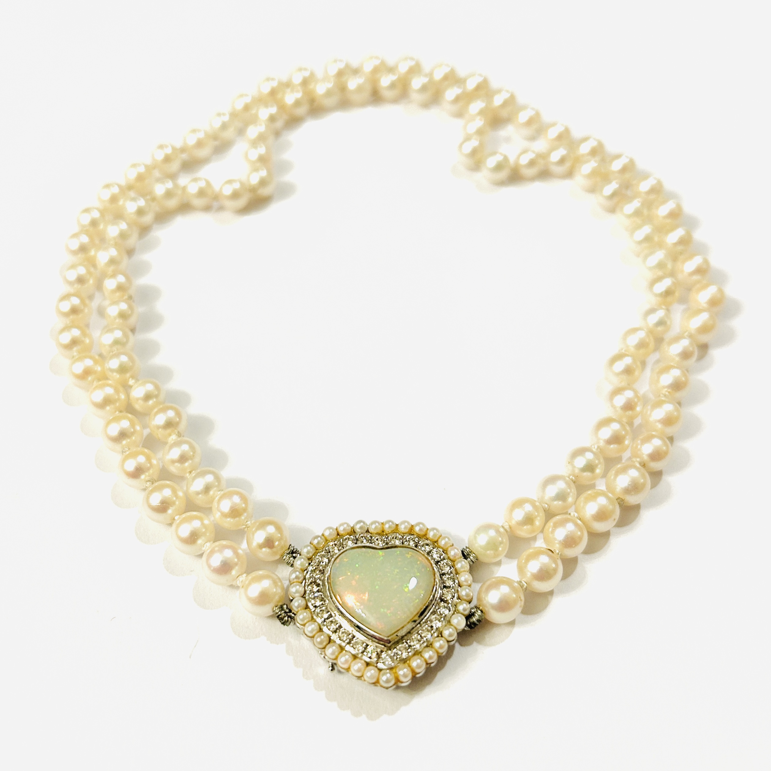 Reprezentativní, luxusní náhrdelník ze dvou šňůr přírodních kultivovaných mořských narůžovělých bílých perel (pravděpodobně typu Akoya), průměrem od 5,8 až 6,4 mm a vynikající kvalitou. Důmyslně schované zapínání v podobě srdce osazeno muglí stejného tvaru z přírodního modro-zeleného opálu o váze 3,60 ct, původem pravděpodobně z Austrálie, rámováno přírodními diamanty kulatého briliantového brusu o celkové váze 044 ct (0,016 ct – 24 ks), jež jsou velmi dobré kvality a precizně fasovány v lůžkách, okraj osazen přírodními kultivovanými bílými perlami o průměru 2 mm a vynikající kvality. Precizní, patrně západoevropská klenotnická práce z poslední třetiny 20. století.