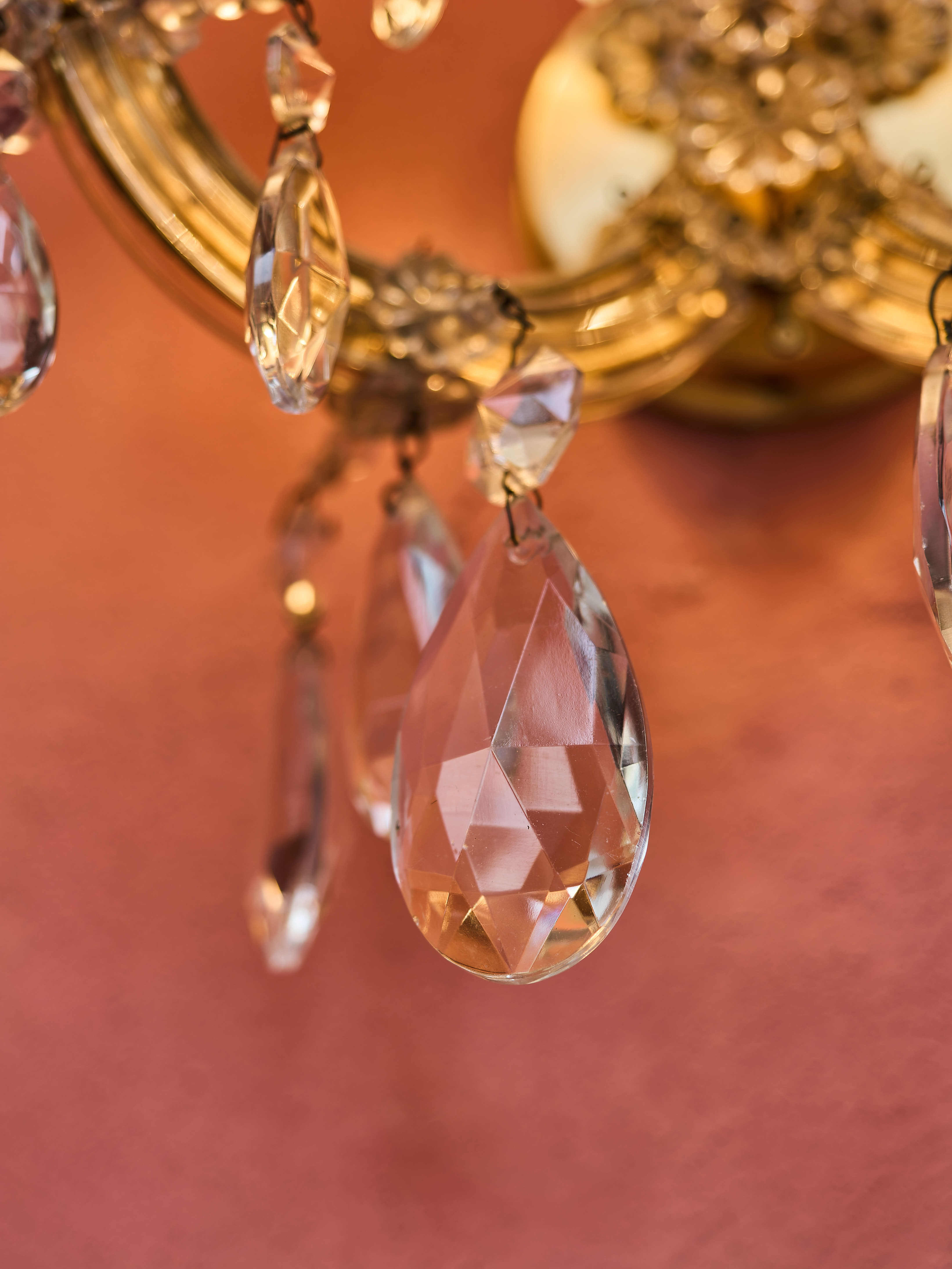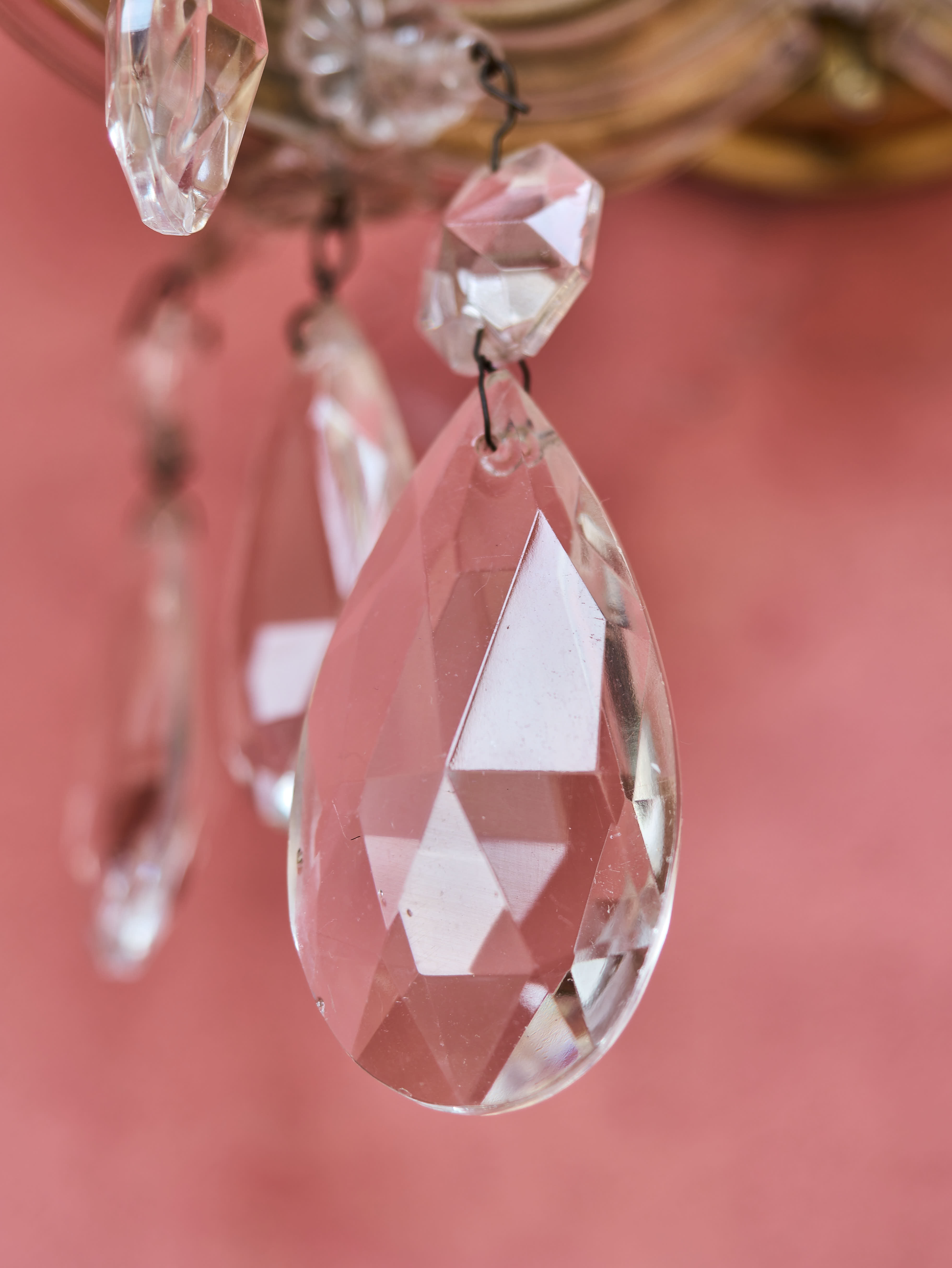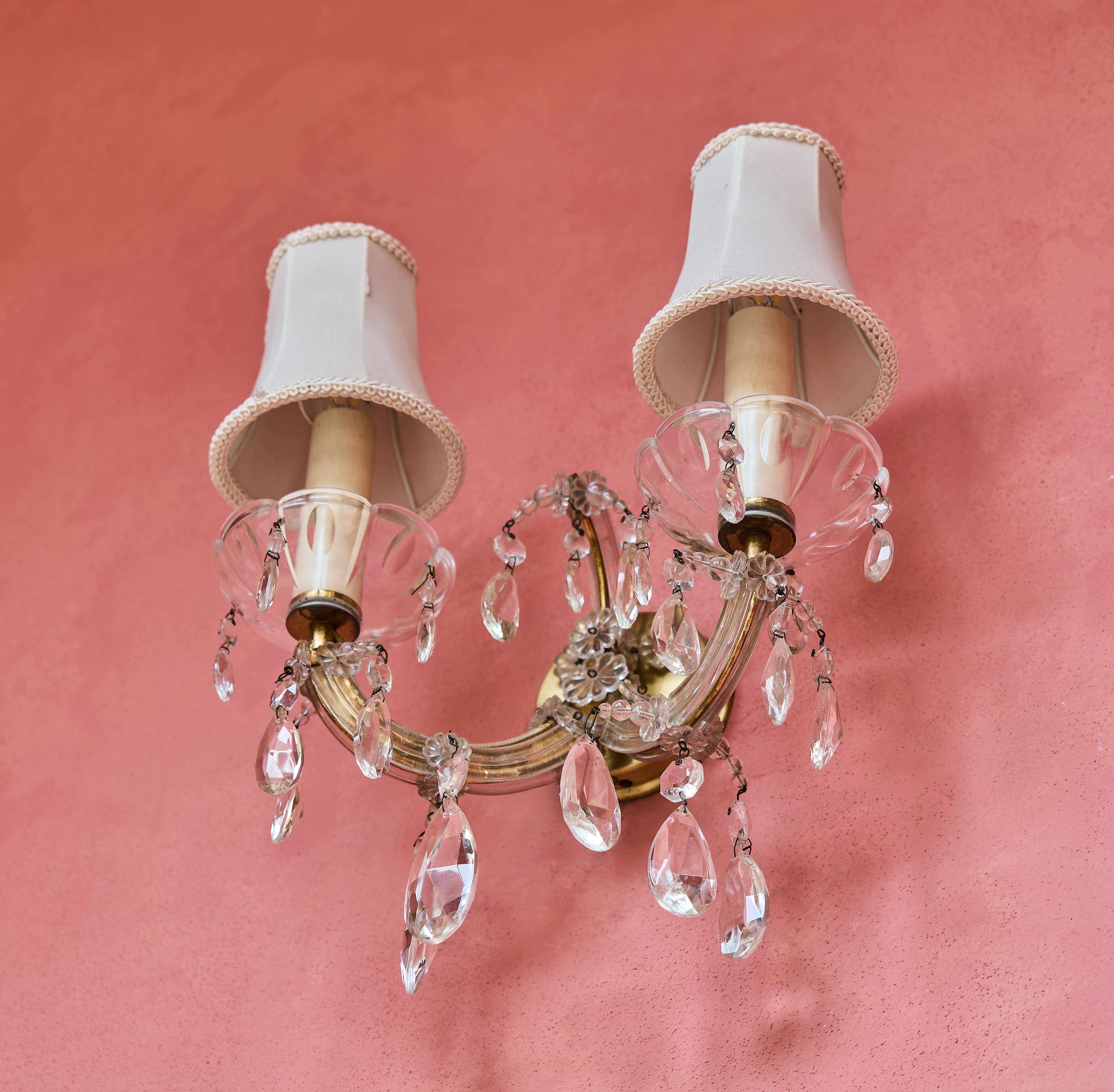 Nástěnná lampa s ručně broušenými a leštěnými křišťálovými ověsy. Typické misky s „olivkami”, které se používají na tereziánských lustrech. Nástěnná lampa je na dvě žárovky s klasickým závitem E14 do 30W. Na žárovky se nasazují ještě stínítka. Elektroinstalace je zkontrolovaná a lampa je ihned k užívání.
