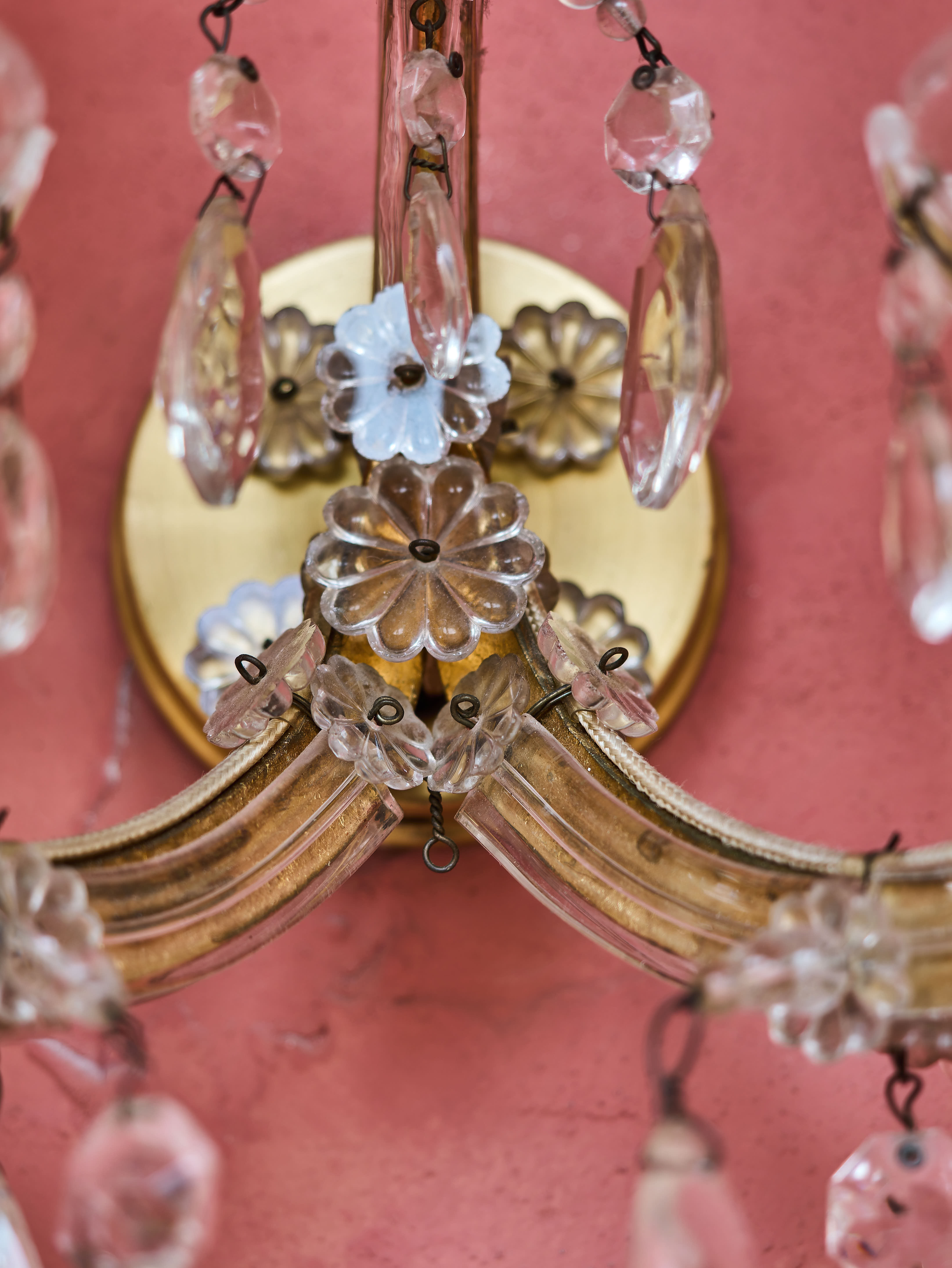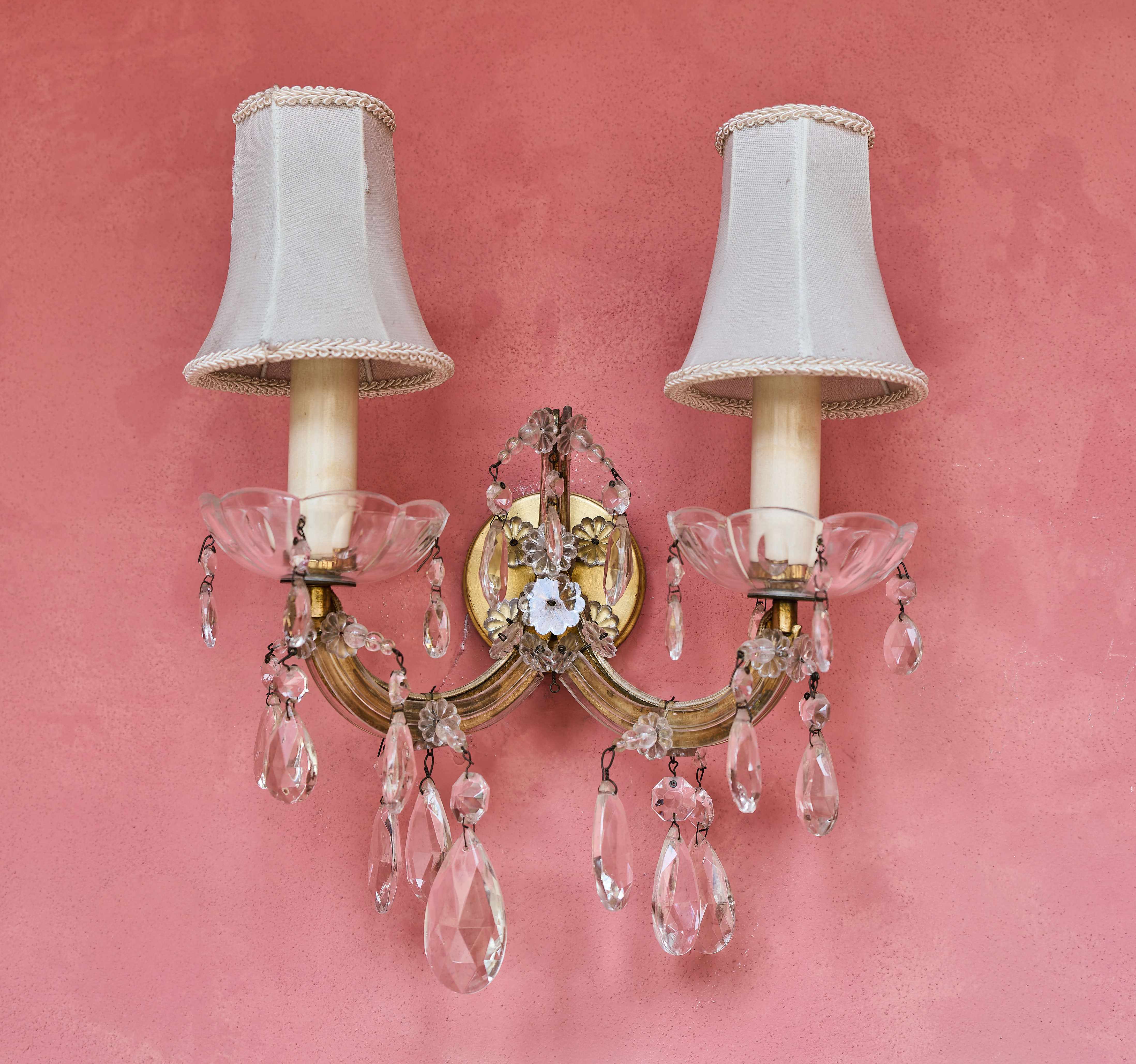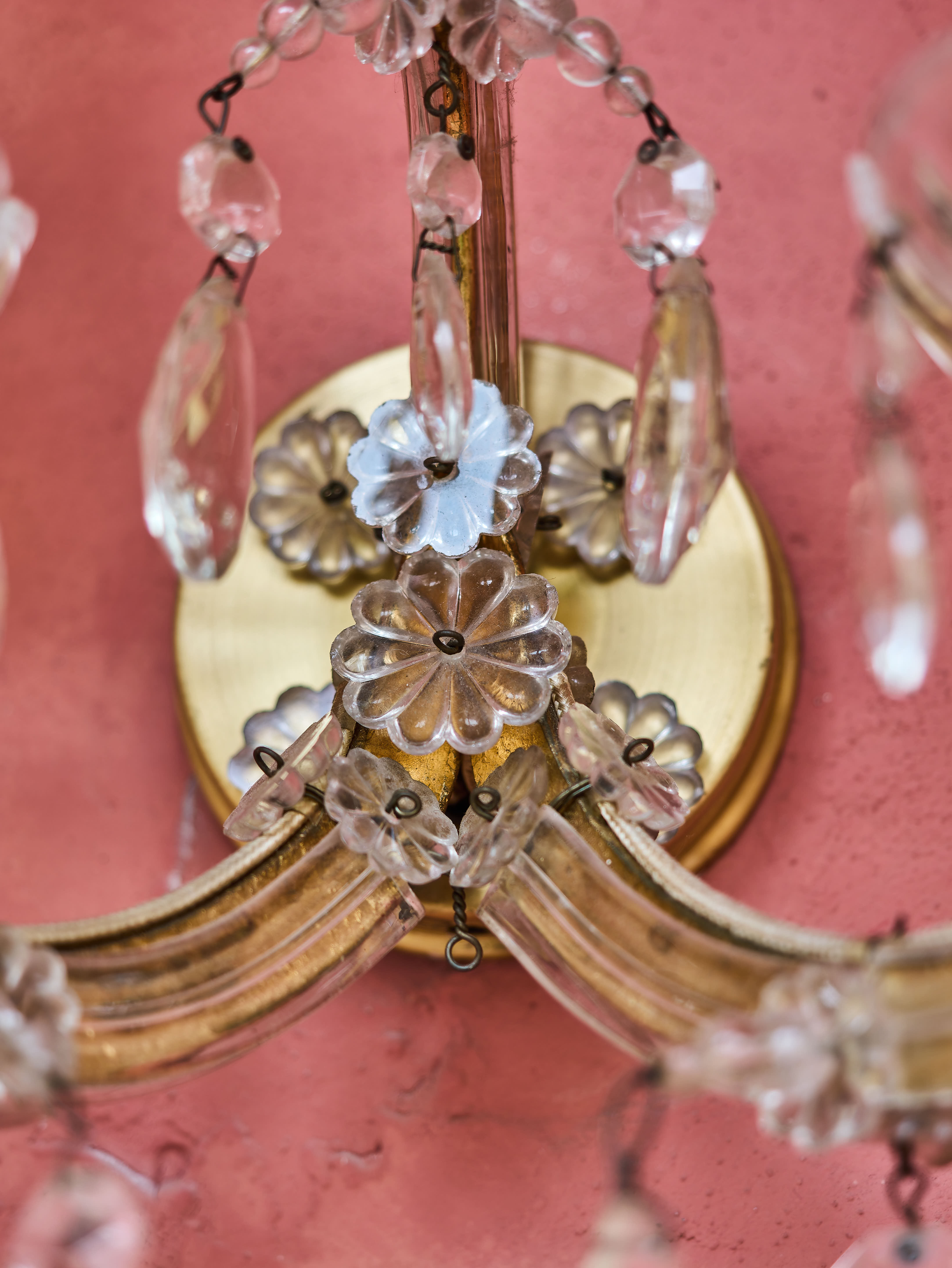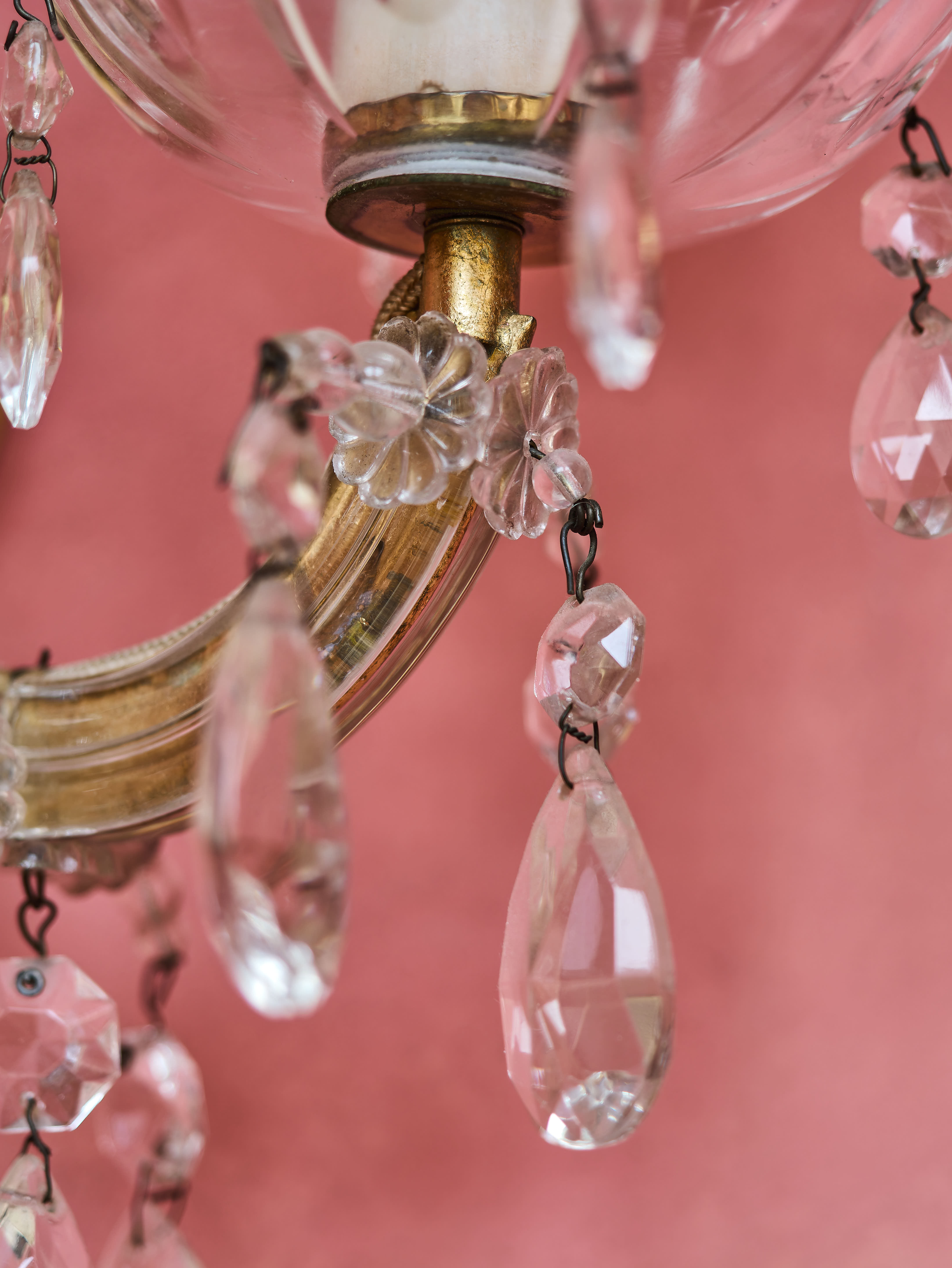 Nástěnná lampa s ručně broušenými a leštěnými křišťálovými ověsy. Typické misky s „olivkami”, které se používají na tereziánských lustrech. Nástěnná lampa je na dvě žárovky s klasickým závitem E14 do 30W. Na žárovky se nasazují ještě stínítka. Elektroinstalace je zkontrolovaná a lampa je ihned k užívání.