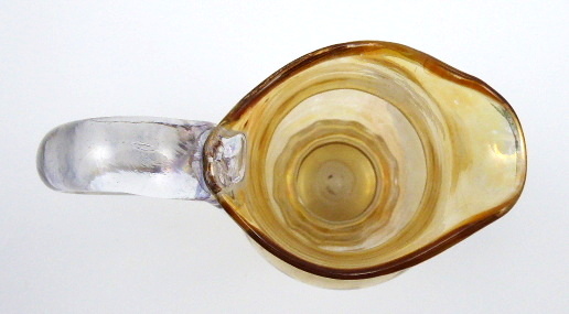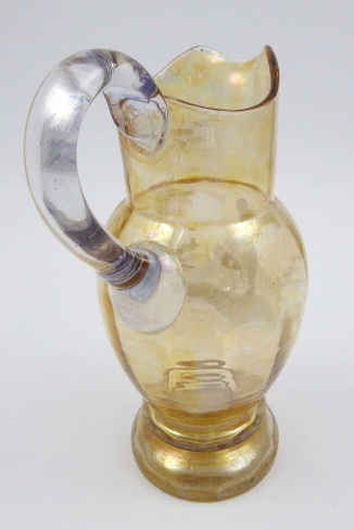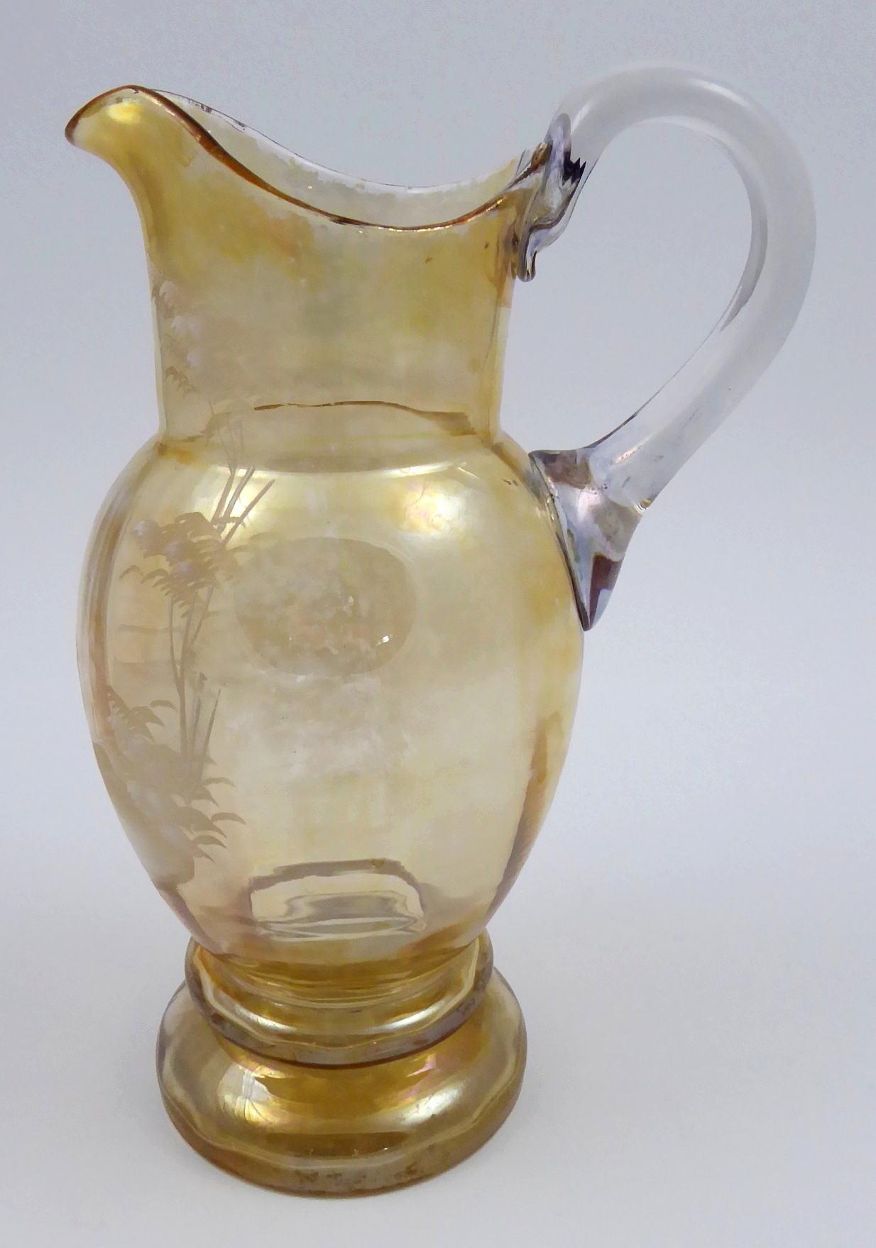 Bezbarvé sklo se žlutým perleťovým listrem, ručně malované. Ve stylu Mary Gregory. Velmi zajímavý vyšší skleněný džbán z bezbarvého skla se žlutým perleťovým listrem. Centrálním motivem je ruční malba takzvané sněžné dívky s kytičkou v ruce stojící na lávce uprostřed romantické krajiny. Úchyt džbánu z bezbarvého skla. Čechy 1890 – 1930. Výška 25,5 cm.