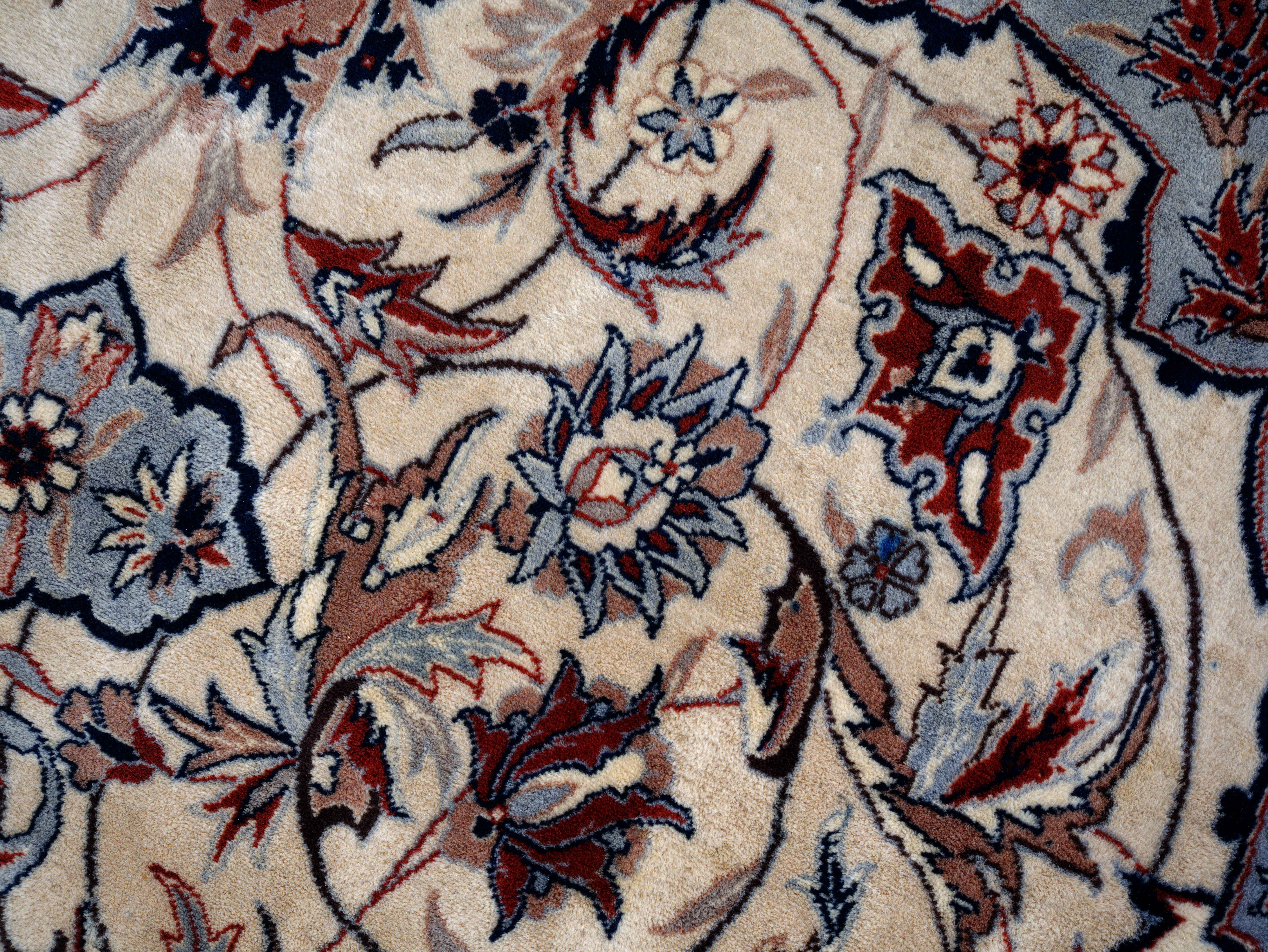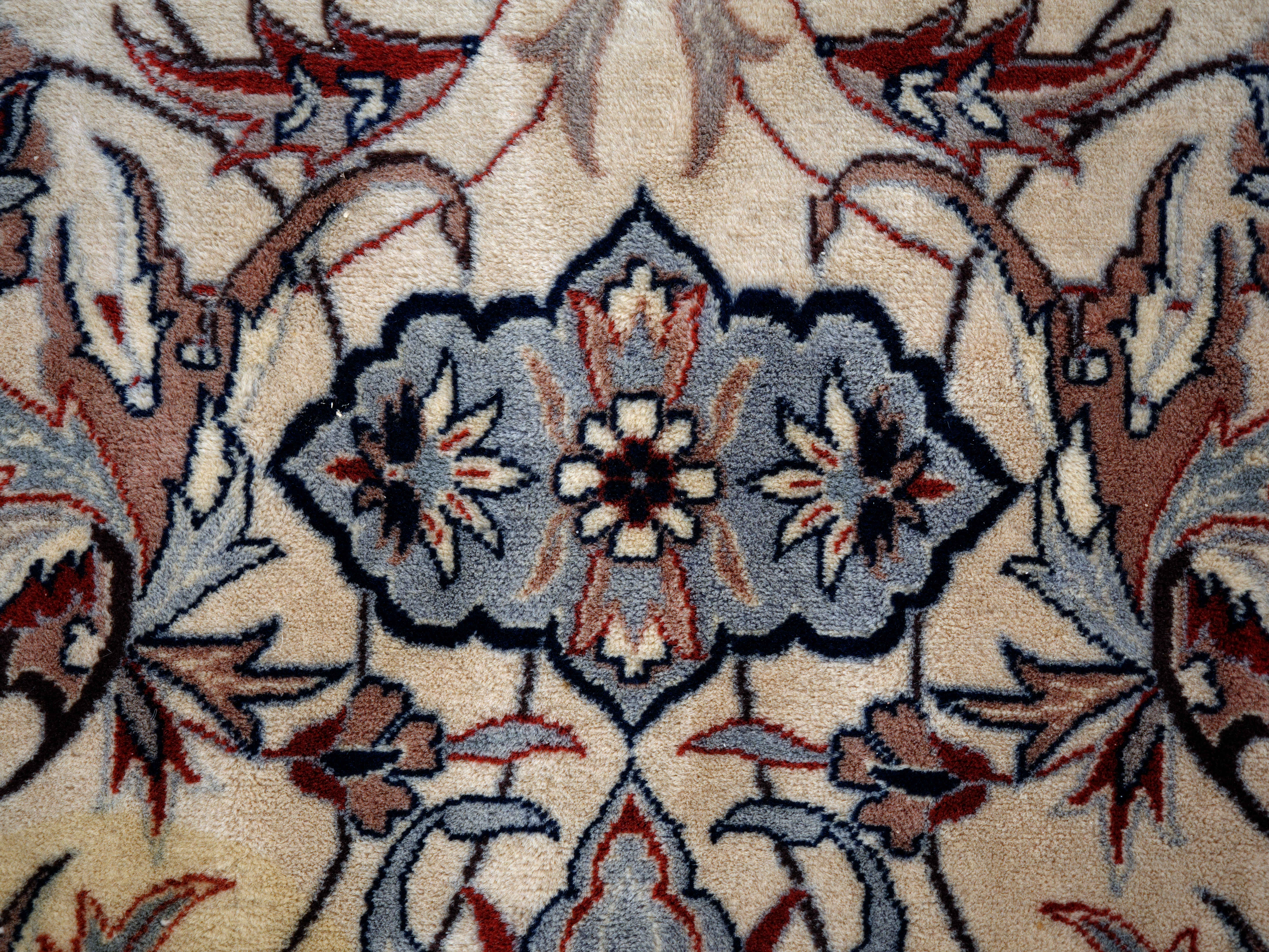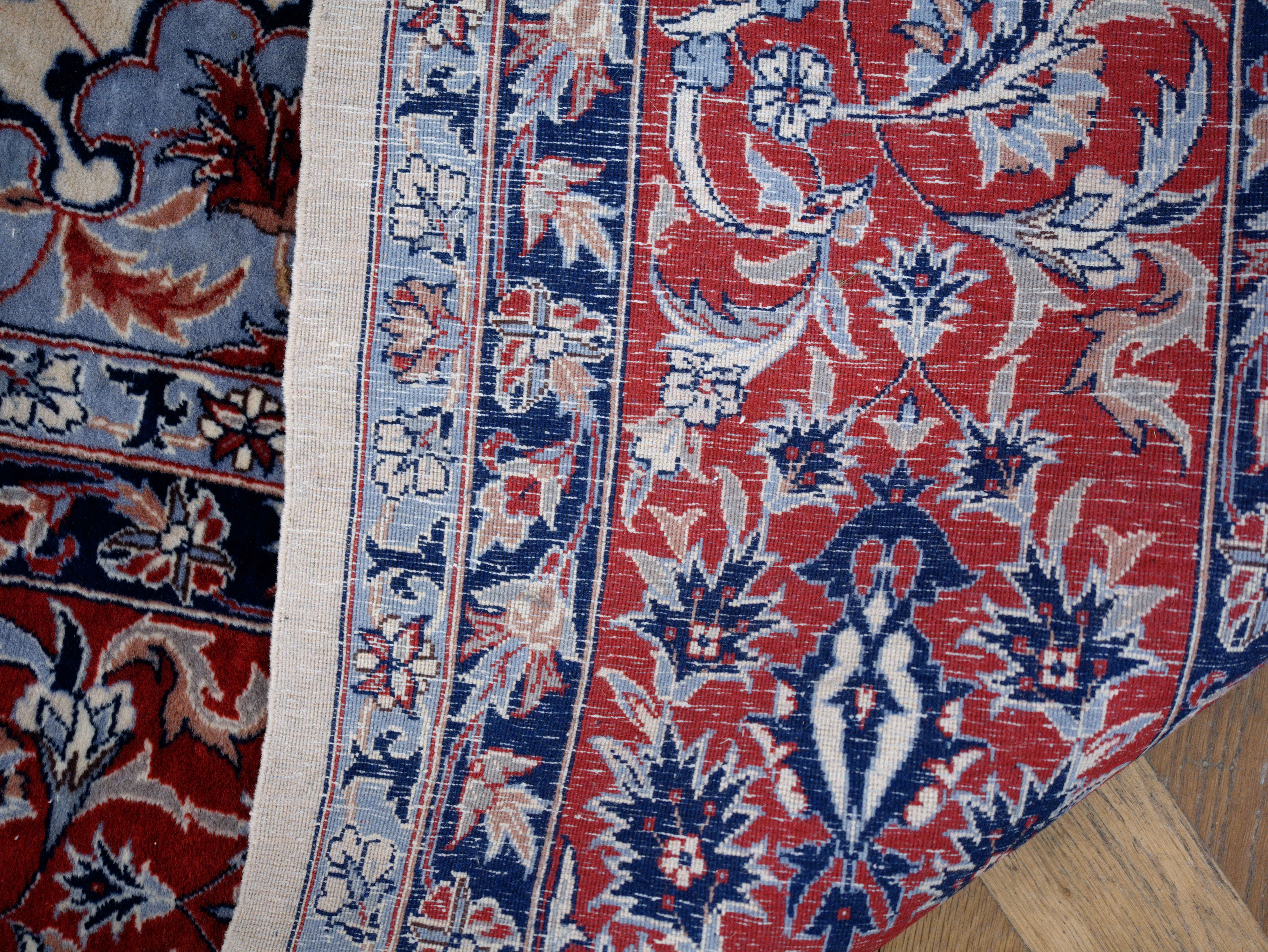 Excelentní kvalita tohoto perského koberce je viditelná na první pohled. Nejjemnější kork vlna na bavlněné osnově. Hustota vazby 360.000 uzlíků na m2. Nádherný florální vzor s centrálním medailonem. Bohatá florální bordura. Koberec je jemný na dotek a měkký na došlap. Koberec byl uvázán asi před 30 lety v městských dílnách Tabrizu v severozápadním Íránu. Jeden z nejkvalitnějších koberců vůbec. Stav: dobrý, bez prošlapaných míst, třásně už nejsou perfektní, ale je možné je zastřihnout nebo ohnout pod koberec.