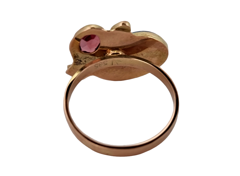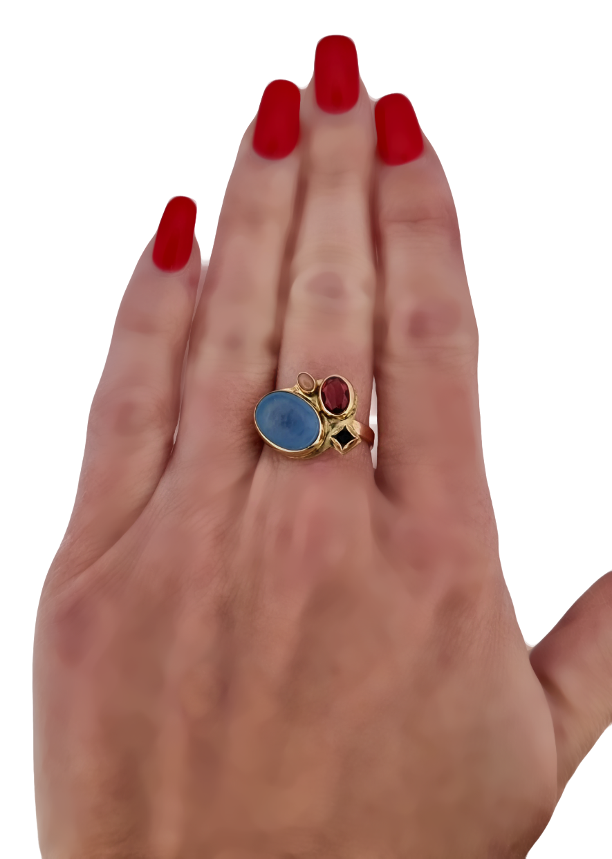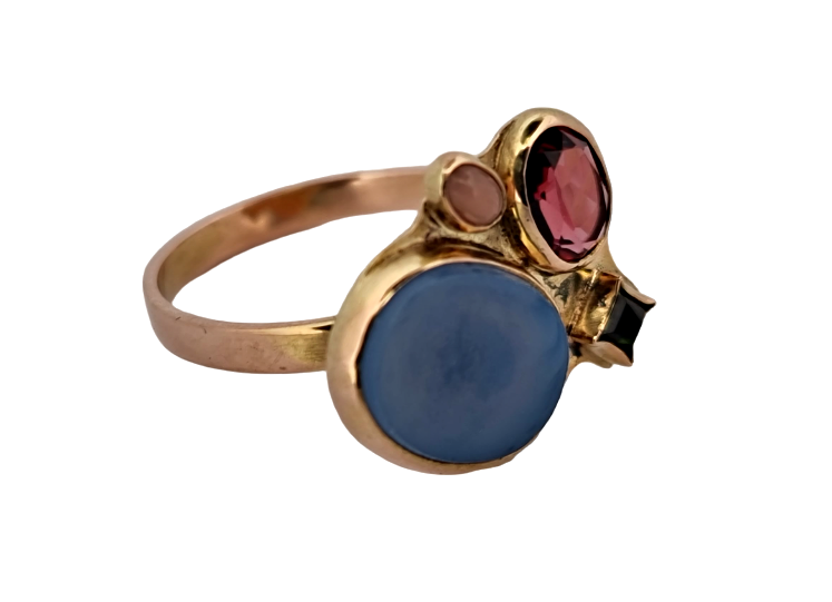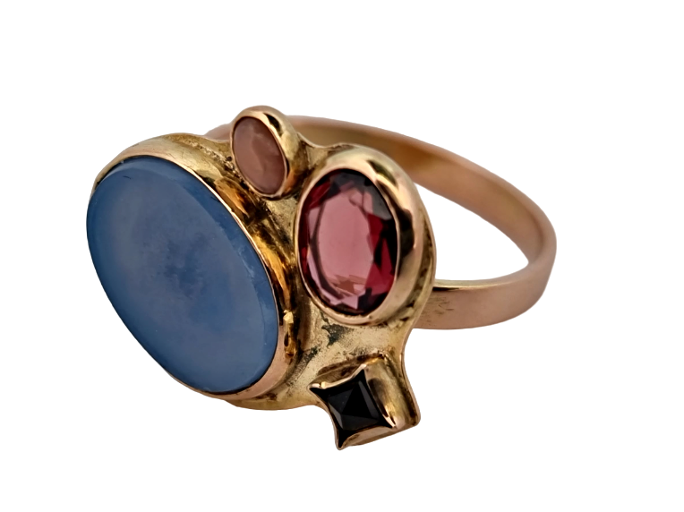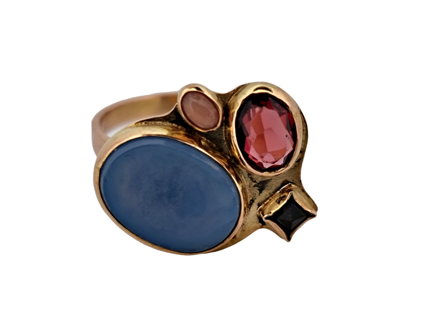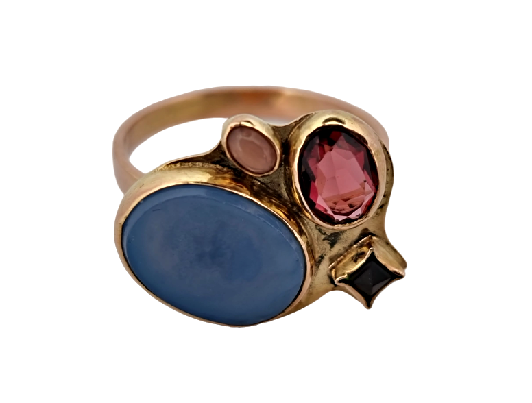 Popis: Extravagantní autorský zlatý prsten s přírodními drahými kameny. Zajímavý design.