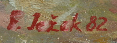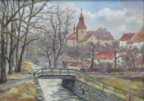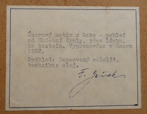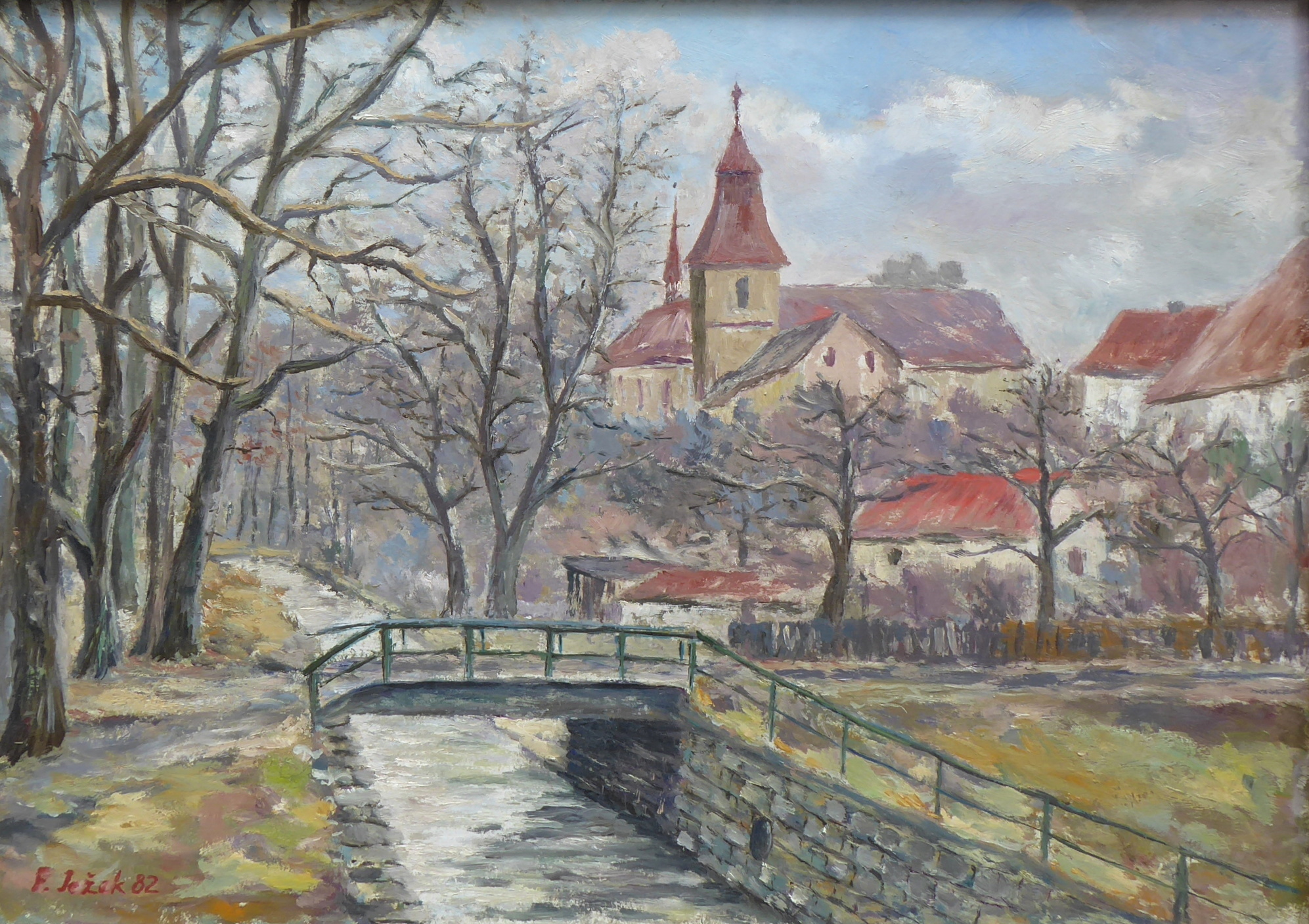 Olej na sololitu 40,5 cm x 56 cm. Signováno vlevo dole s datací 1982. Vzadu strojově čitelný štítek. Autor: F. Ježek. Pohled na architekturu Doks s kamennou lávkou přes říční koryto v popředí. Pohled od Hudební školy směrem ke kostelu. V originálním dobovém rámu. Československo, Doksy, rok 1982. Celkový rozměr s rámem 55 cm x 71 cm.