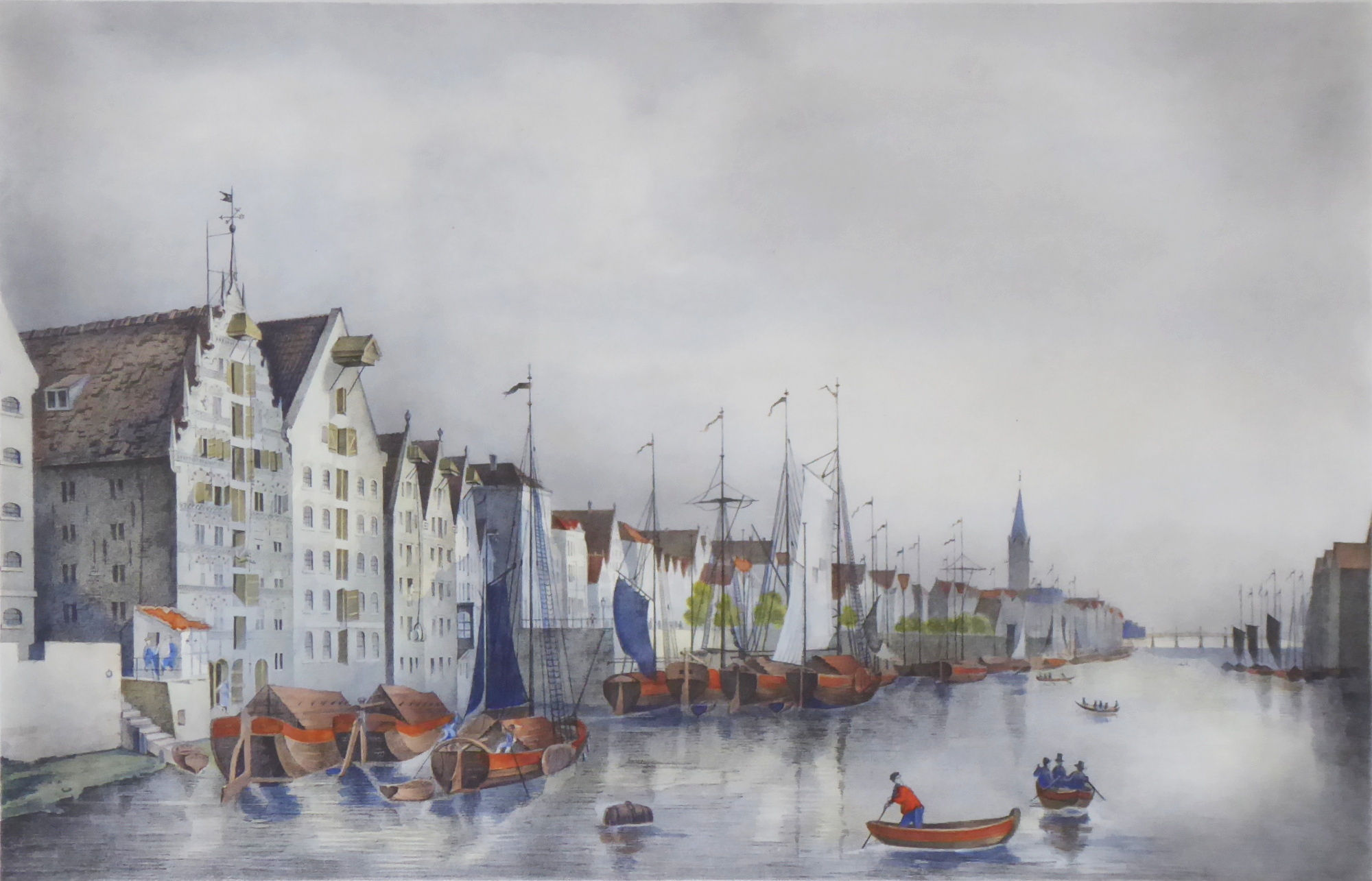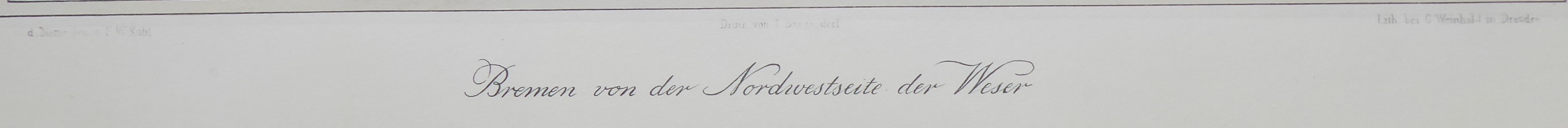 Ručně barevně kolorovaná litografie 22,5 cm x 35 cm. Podle kresby od: Friedrich Wilhelm Kohl (1811-1864), německý malíř. Pro litografický list nakreslil Georg Weinhold (1813-1880). Prvotně vytiskla firma J. Braunsdorf činná v Drážďanech v letech 1839 – 1873. Značeno pod paspartou – v tisku vlevo dole: d. Naturgez. v. F.W. KOHL. Uprostřed v dolní části: Druck von J. Braunsdorf a uprostřed dole název grafického listu: Bremen von der Nordwestseite der Weser. Vpravo dole: Lith. bei G. Weinhold in Dresden. Působivý pohled na přístav v Brémách ze severní strany řeky Weser (Vezera) s domy, plachetnicemi a malými loďkami. V originálním rámu s dekorem lakované ořechové dýhy s paspartou a sklem. Německo, Drážďany, kolem poloviny 19. století nebo první třetina minulého století. Celkový rozměr s rámem 44,5 cm x 55 cm.