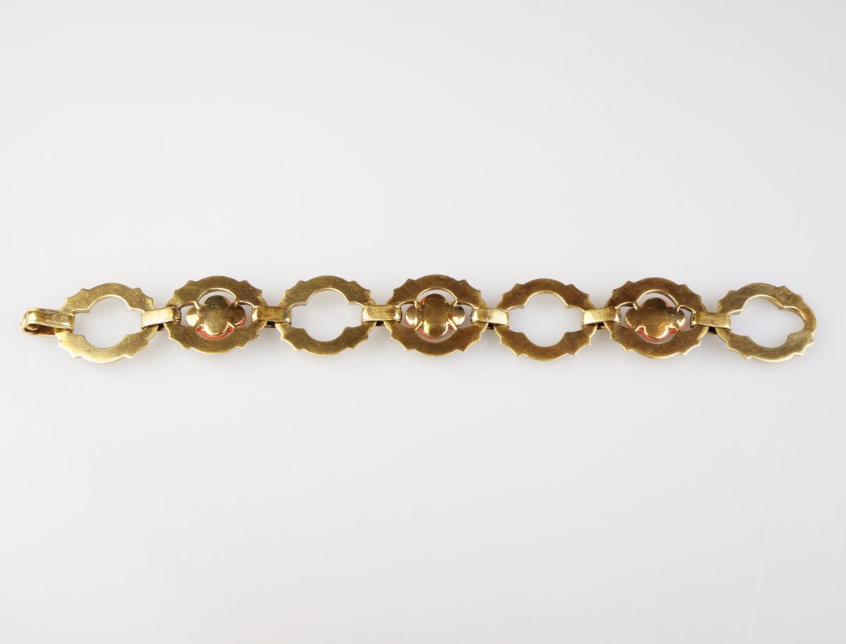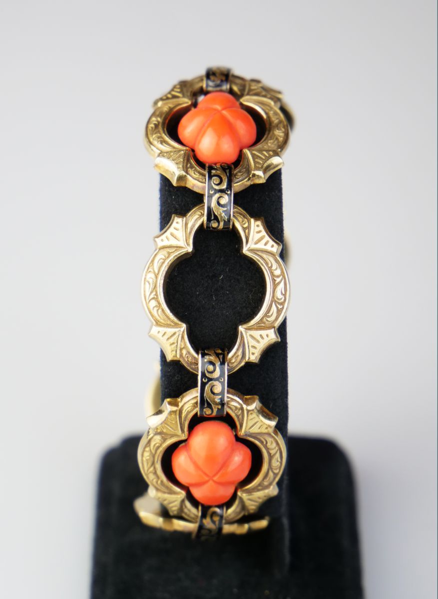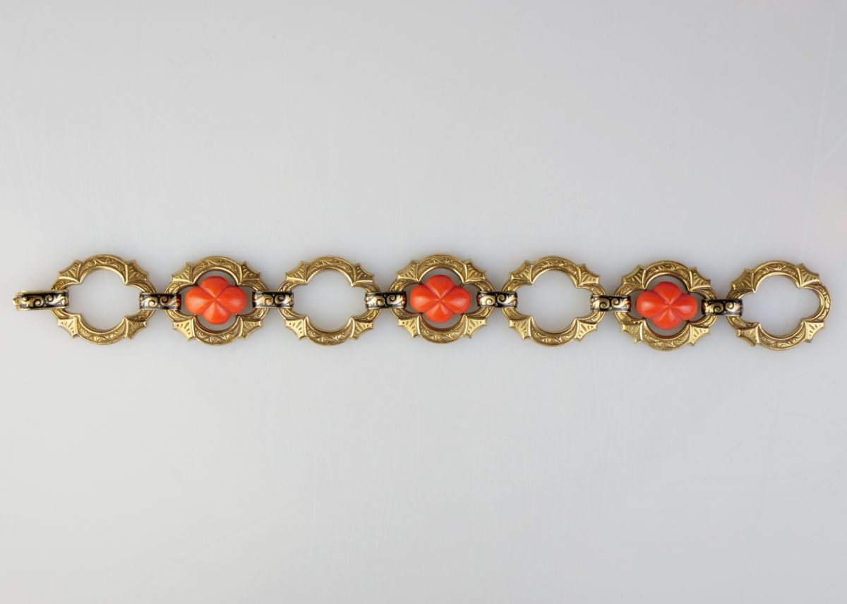 Zlatý článkový náramek s netradičně řezanými velkými přírodními korály a černým emailem. Celková hmotnost Au 30,38 g/585/1000, dovozový punc lyra (Z-34). Západní Evropa, první třetina 20. století, délka 19,5 cm, šířka 2,2 cm.