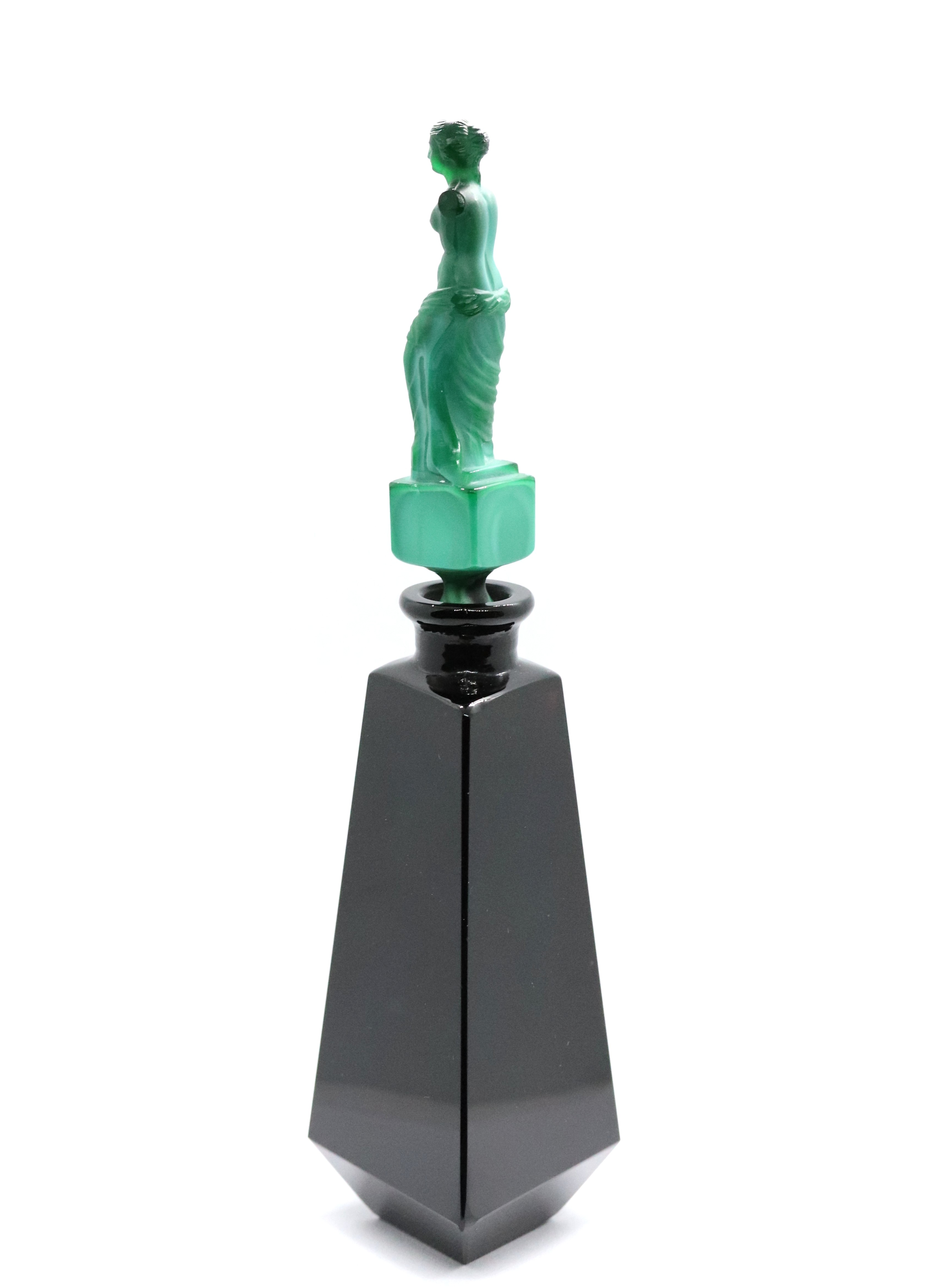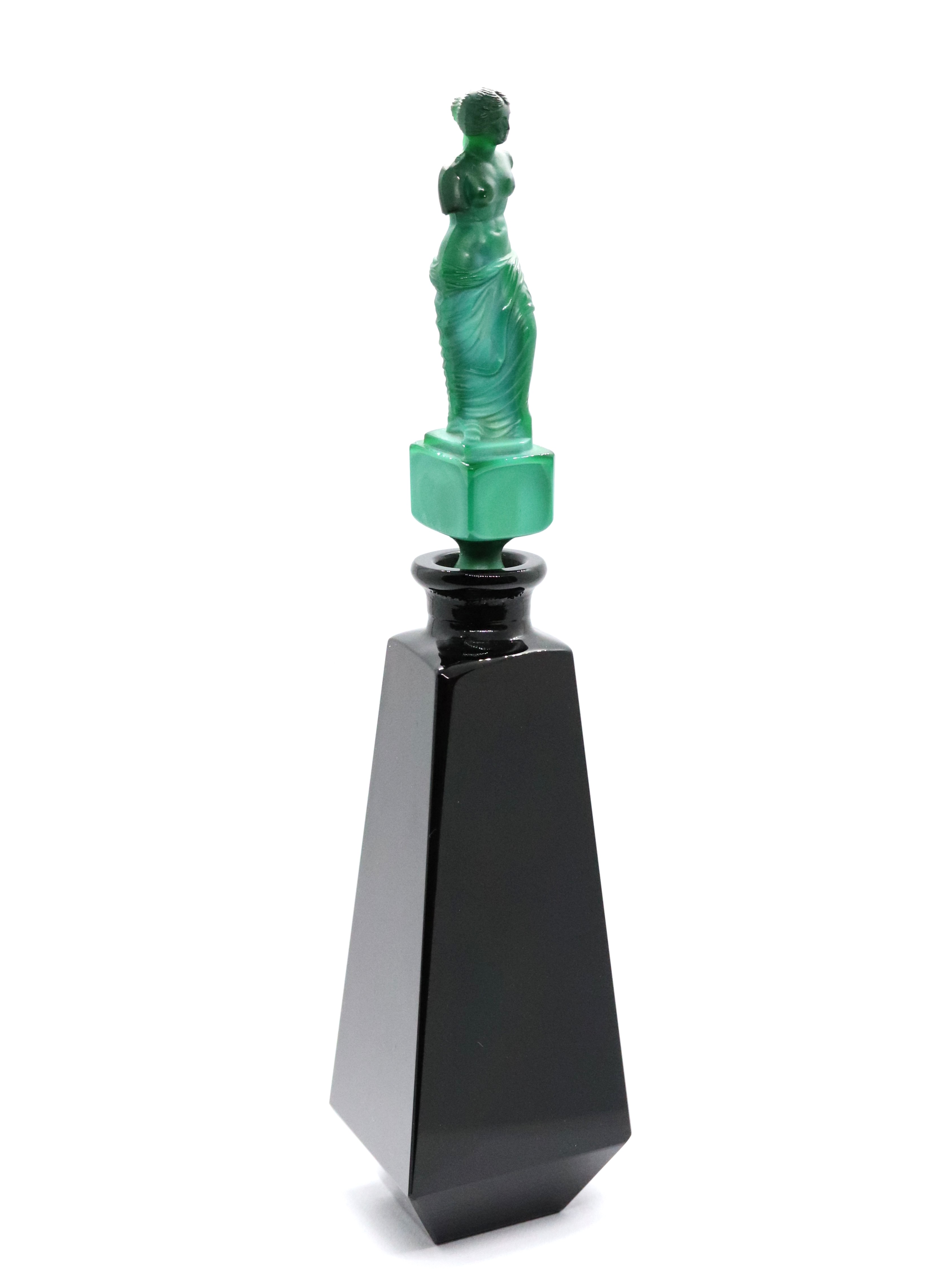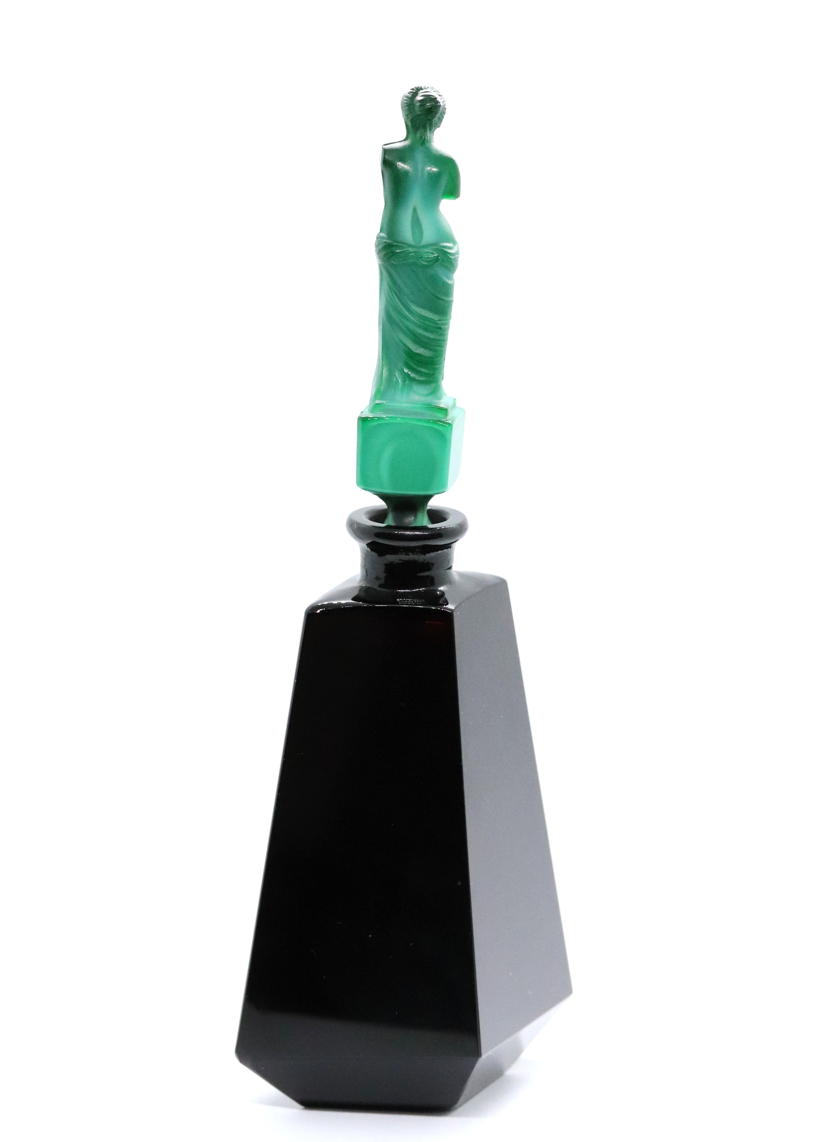 Luxusní art deco flakón z temně fialového skla, zátka v podobě torza ženy z malachitového skla, s pipetou, podle návrhu Heinricha Hoffmanna, Československo, 30. léta 20. století; výška bez zátky 11 cm, se zátkou 19 cm