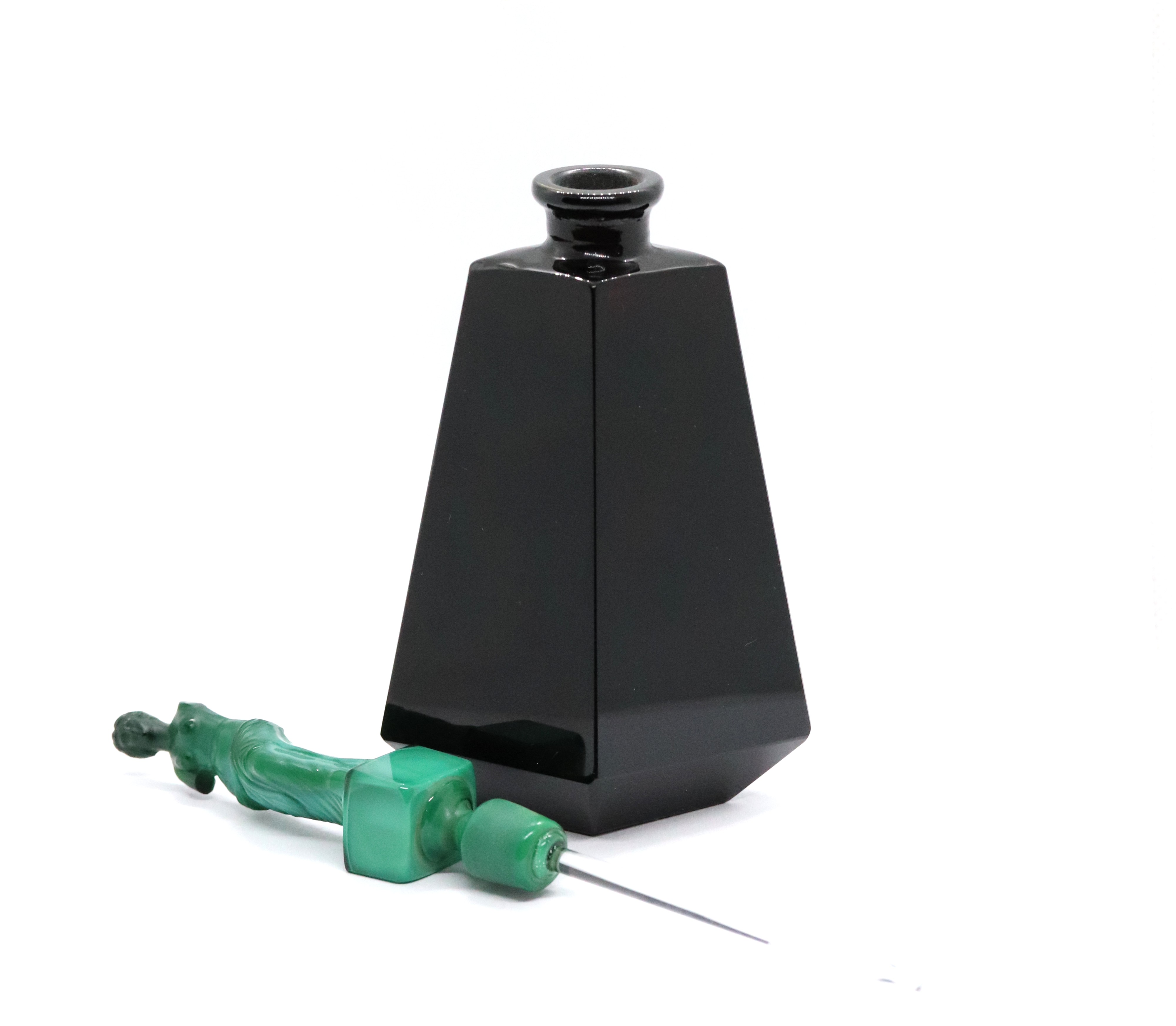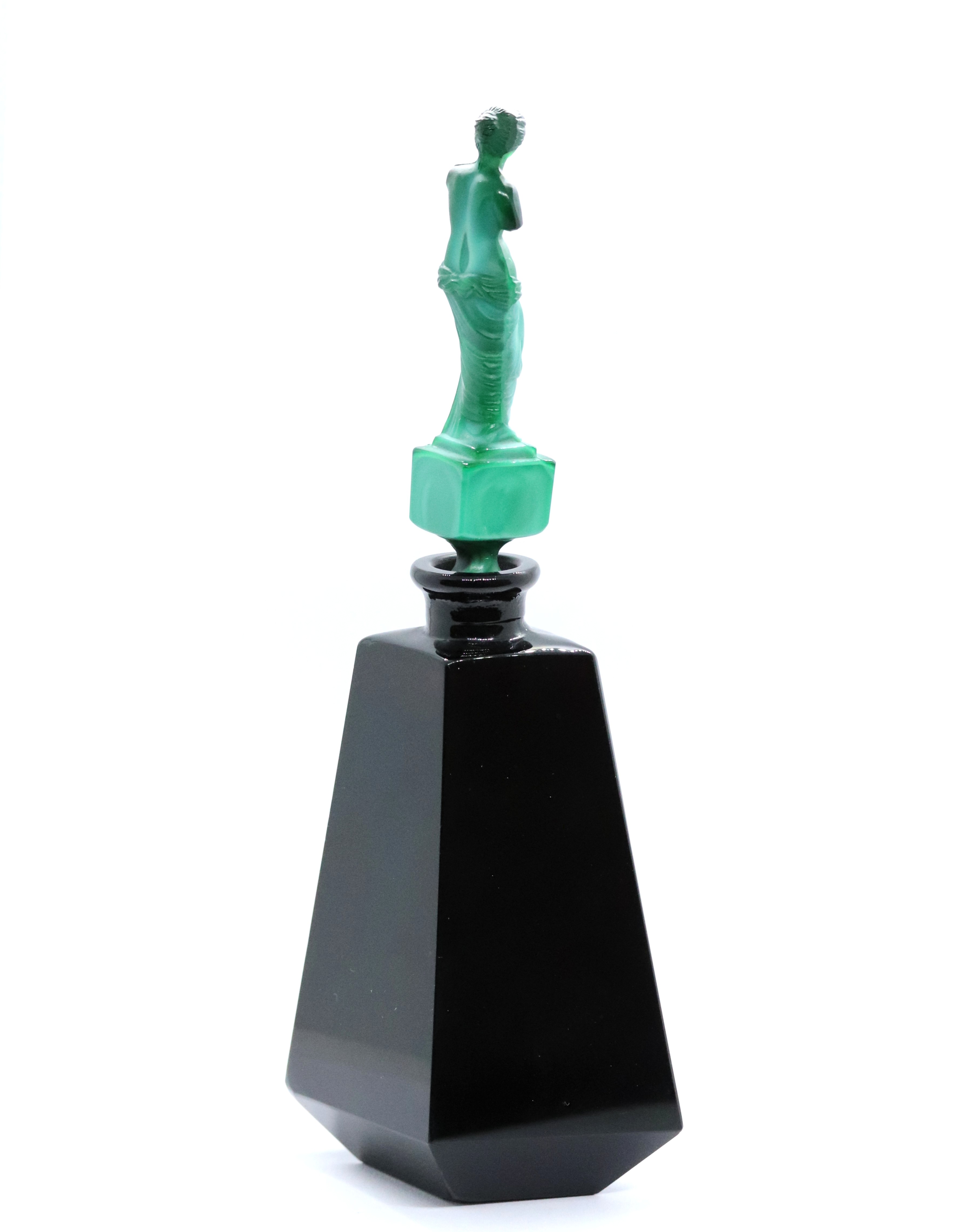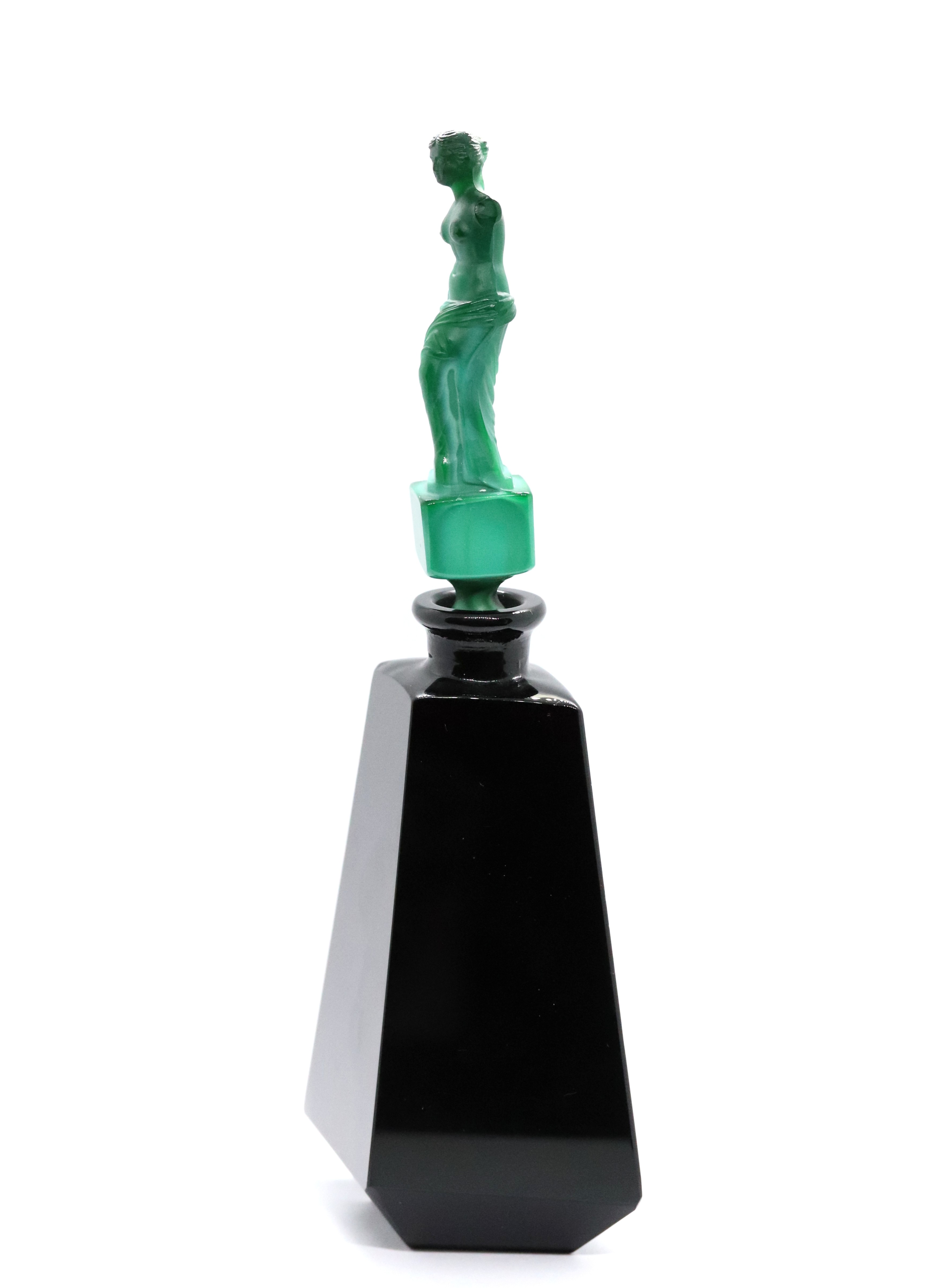Luxusní art deco flakón z temně fialového skla, zátka v podobě torza ženy z malachitového skla, s pipetou, podle návrhu Heinricha Hoffmanna, Československo, 30. léta 20. století; výška bez zátky 11 cm, se zátkou 19 cm