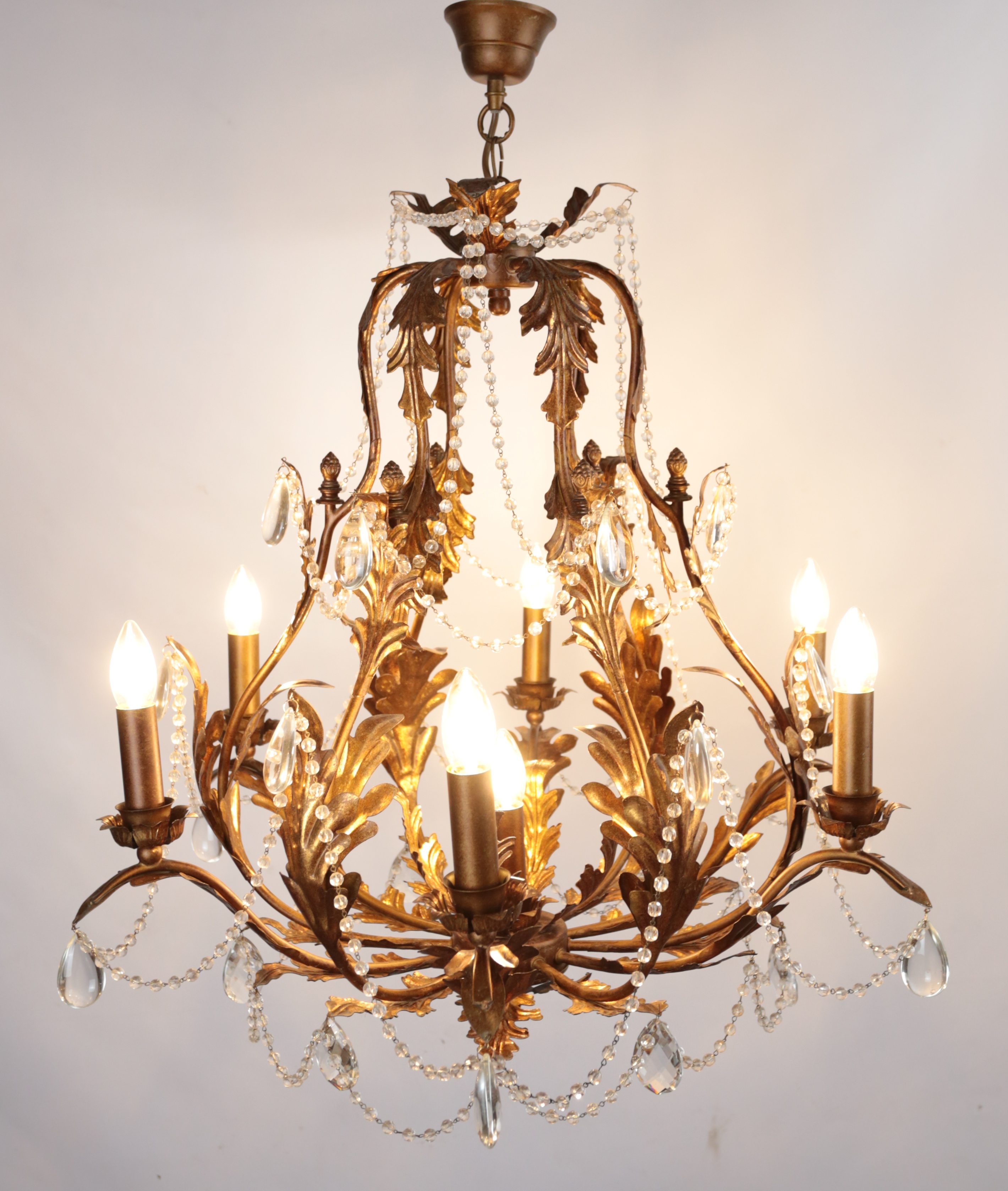 Větší kovový lustr ve florentském stylu s ověsy z ručně broušeného olovnatého křišťálu. Lustr je na sedm žárovek s klasickým svíčkovým závitem E14 – vhodné jsou normální, halogenové i led žárovky do 40W. Stav: restaurovaný: nová elektroinstalace, plně funkční, ihned k užívání. Datace: kolem roku 1960. Provenience: Itálie.