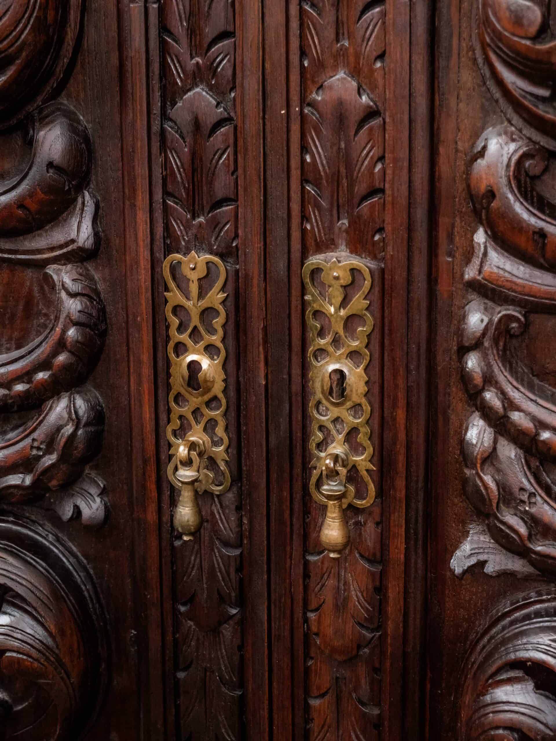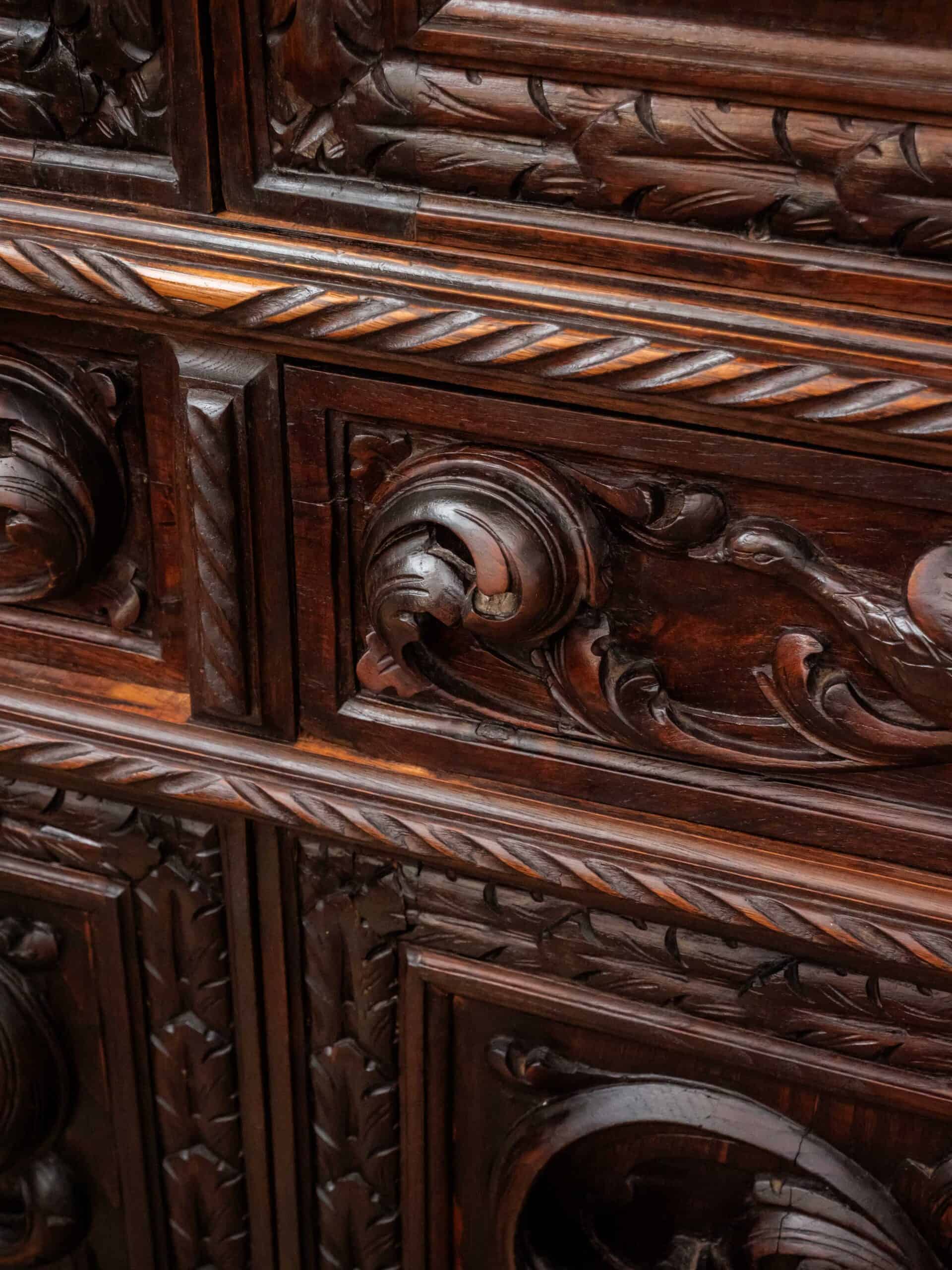 Umělec s velkou precizností variuje různé ornamentální motivy: palmové listy, vejcovce, vavřínové listy, růže, svitky… Každý profil a každá tvář je individualizována a má různé rysy, což svědčí o vysoké úrovni řemeslníkových dovedností. Talent umělce je nepopiratelný a skříň ukazuje mistrovské provedení jak v celkovém designu, tak v jednotlivých panelech.