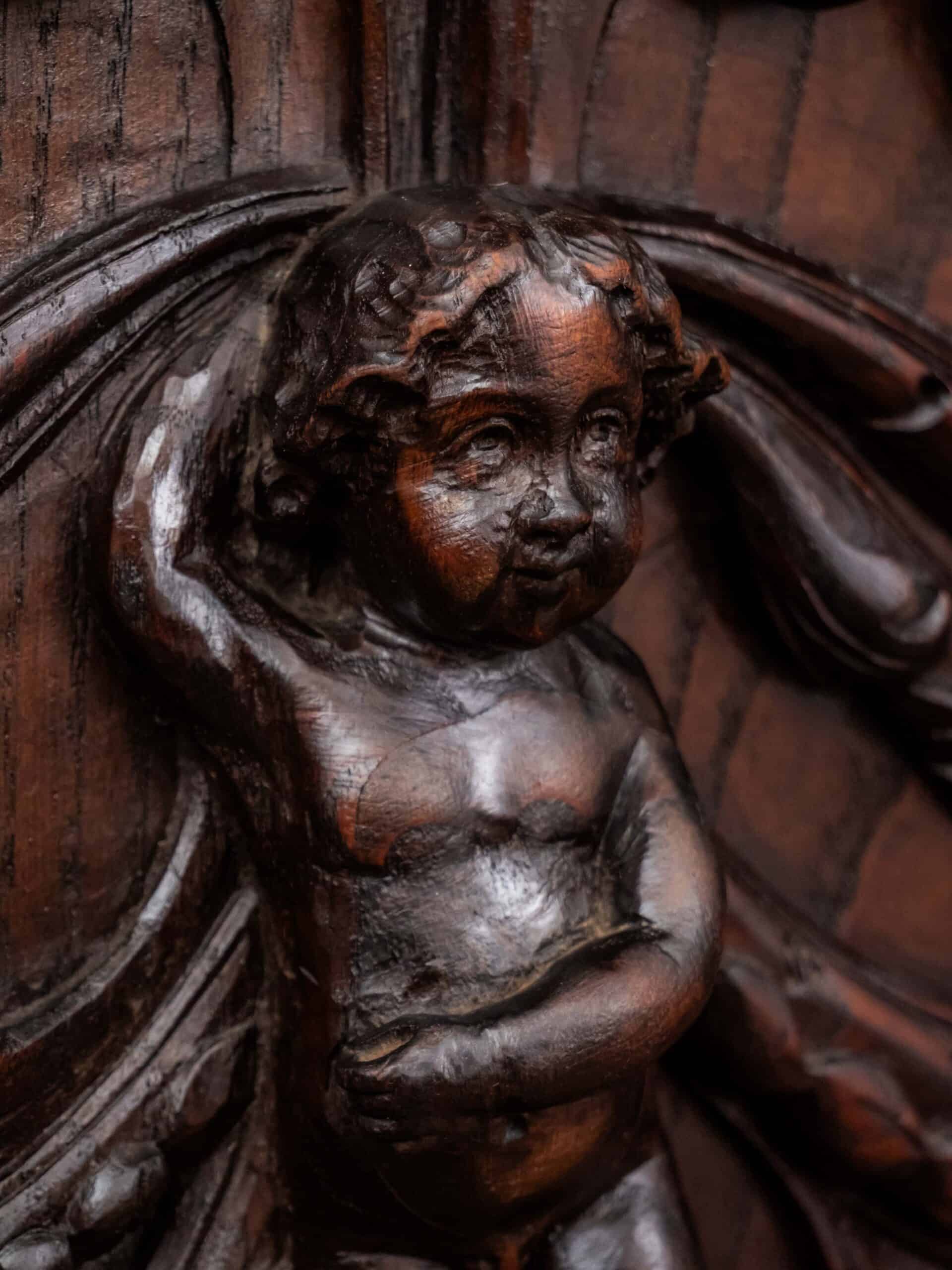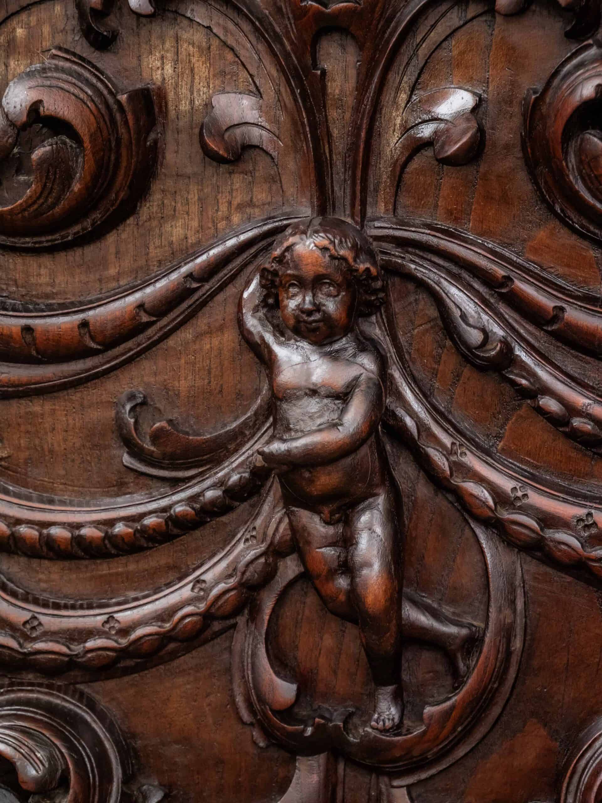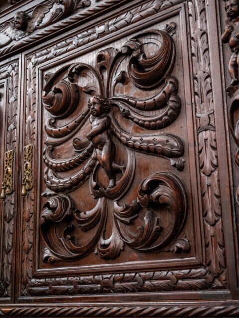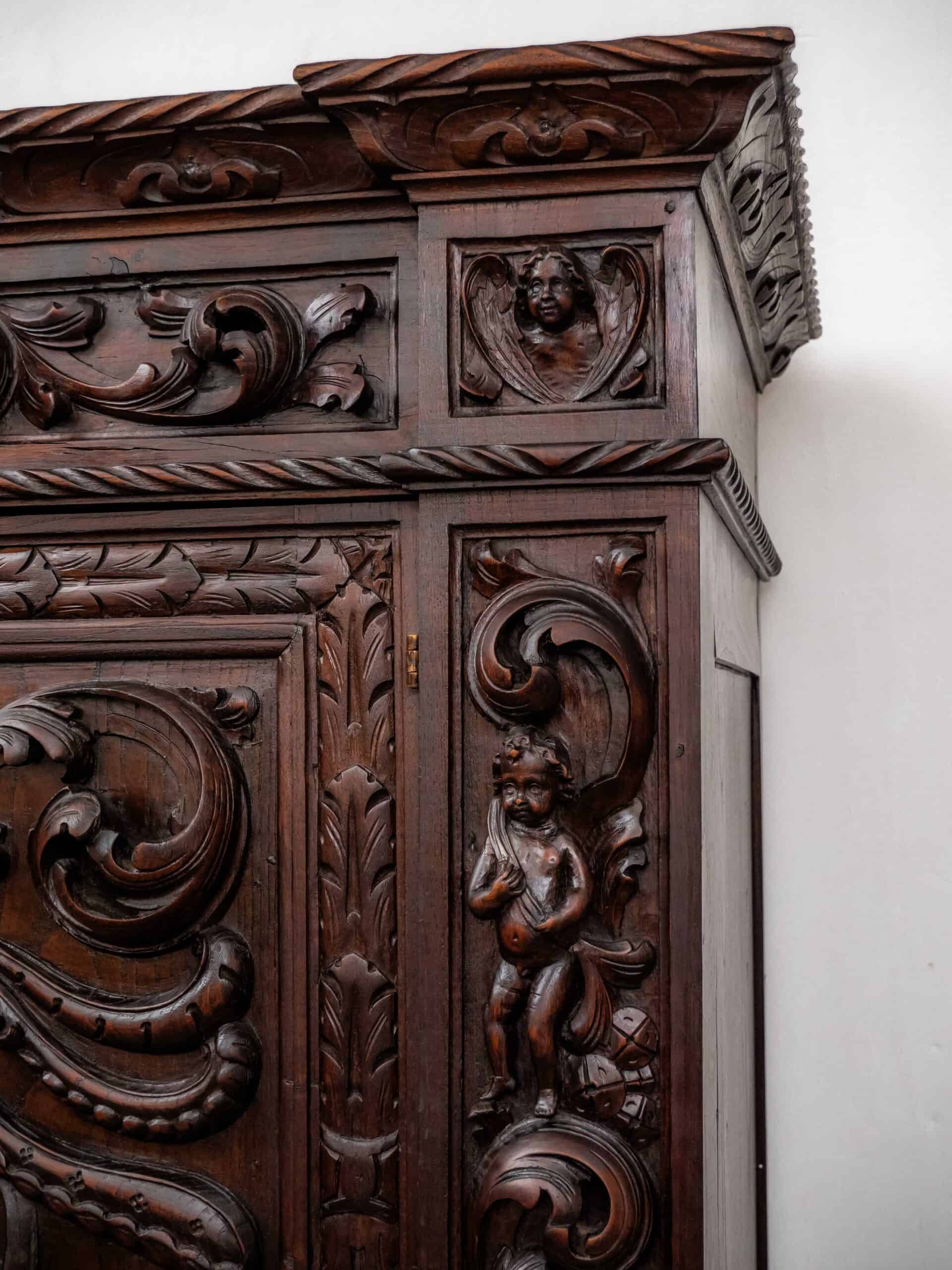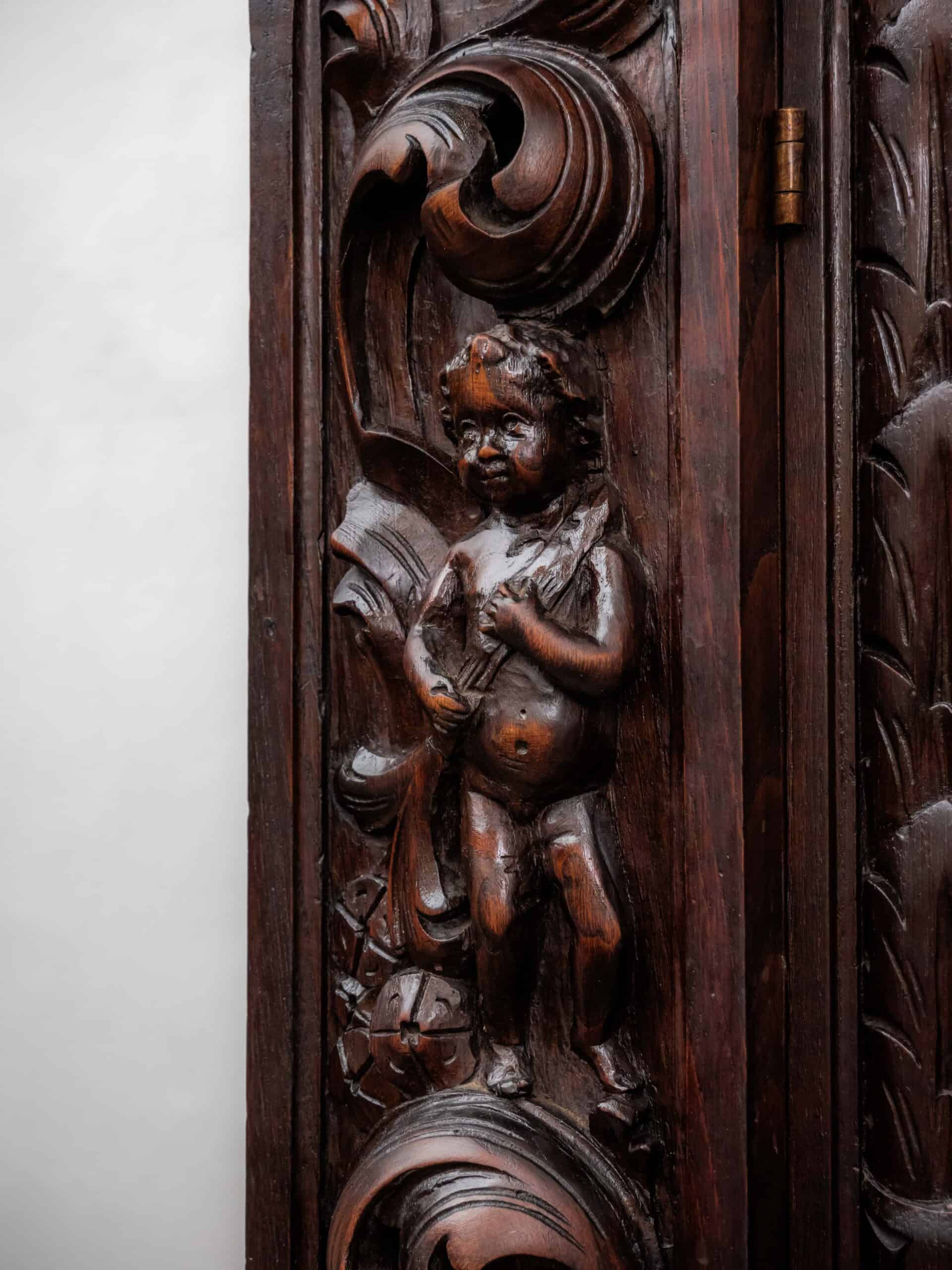 Horní část skříně obsahuje také dvě dvířka, každé zdobené centrální postavou putti, která je obklopena složitými vyřezávanými ornamenty a akantovými listy. Postavičky jsou umístěny v dynamických pózách a dodávají skříni výraznou hloubku a detail. Nad dvířky je profilovaná římsa zdobená florálními motivy a maskami andělíčků.