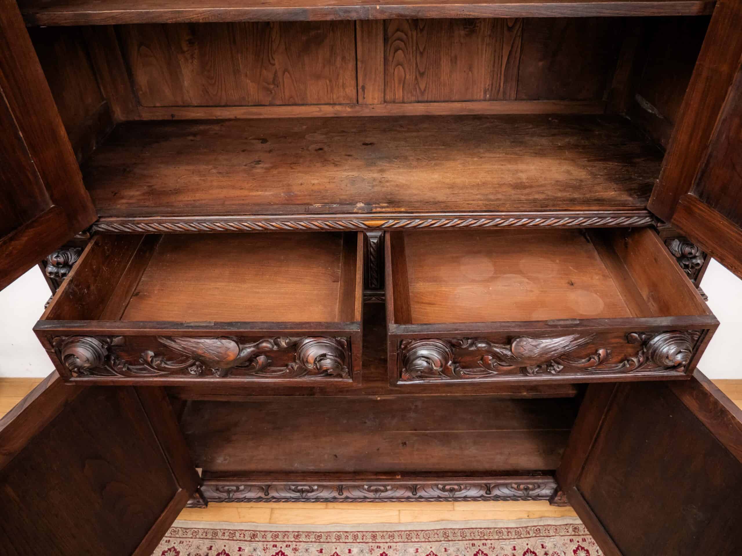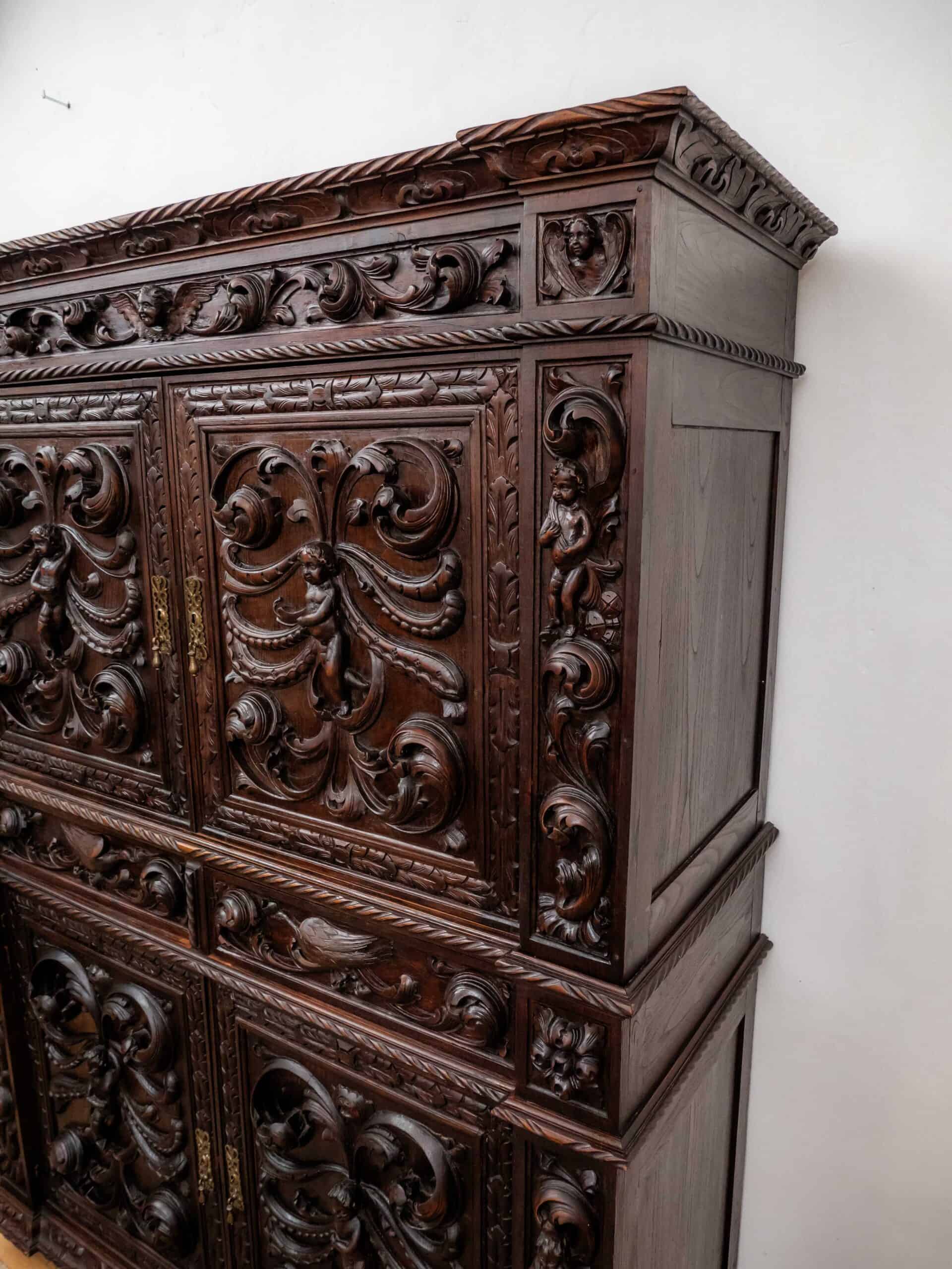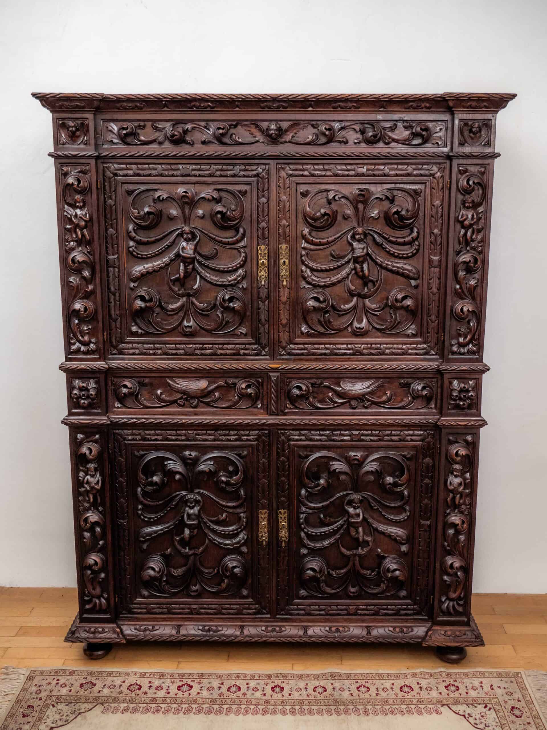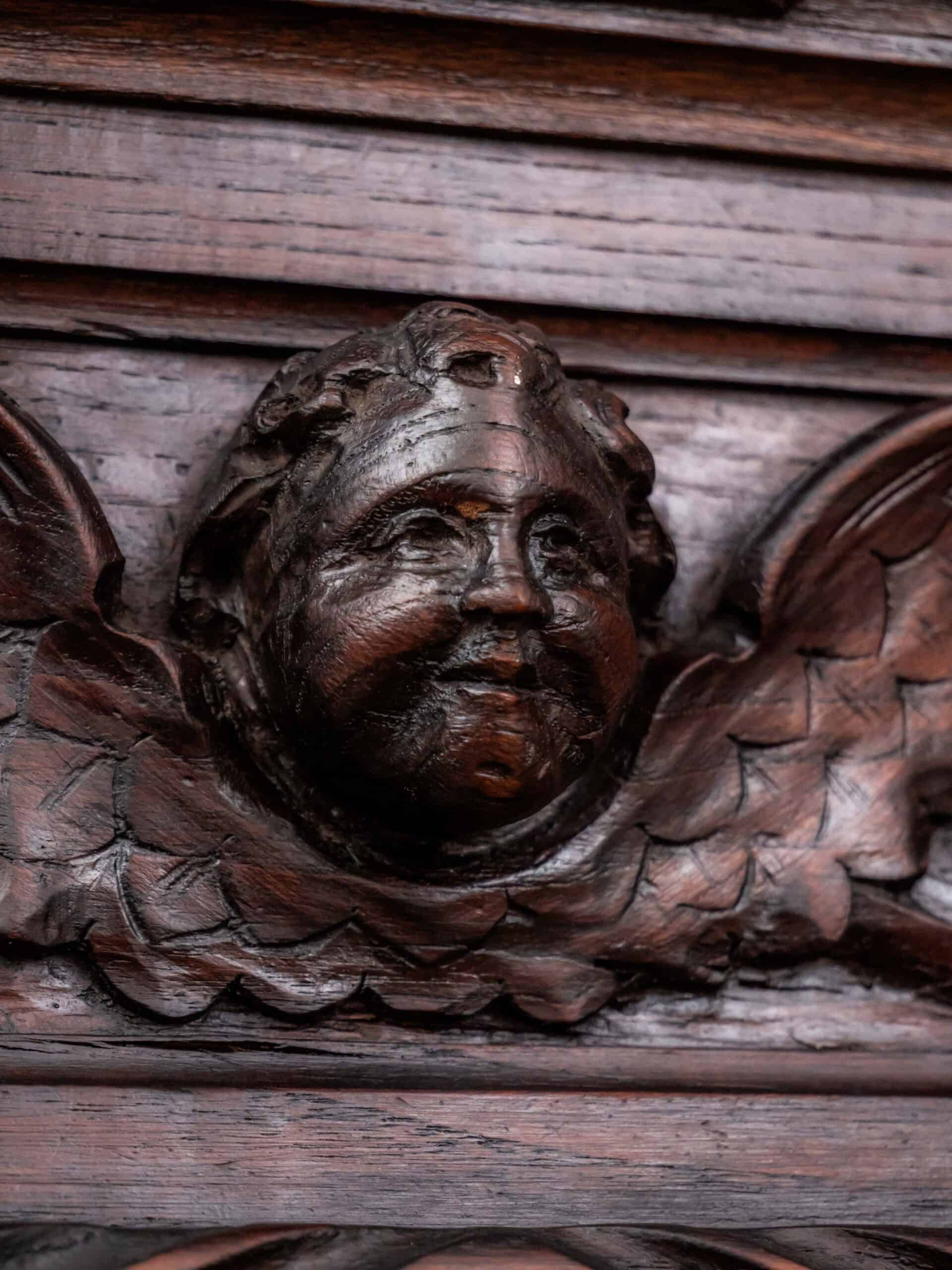 Horní část skříně obsahuje také dvě dvířka, každé zdobené centrální postavou putti, která je obklopena složitými vyřezávanými ornamenty a akantovými listy. Postavičky jsou umístěny v dynamických pózách a dodávají skříni výraznou hloubku a detail. Nad dvířky je profilovaná římsa zdobená florálními motivy a maskami andělíčků.