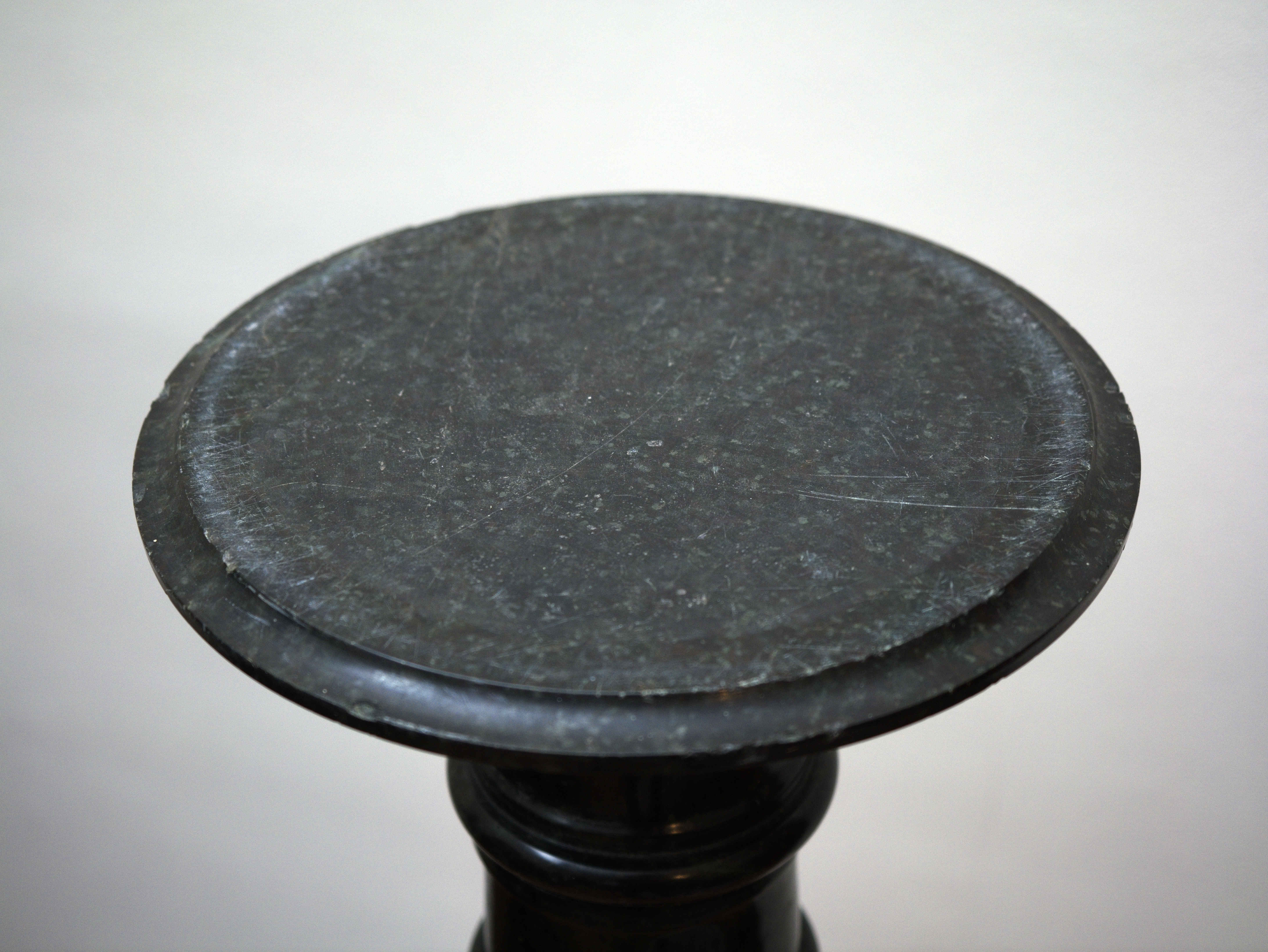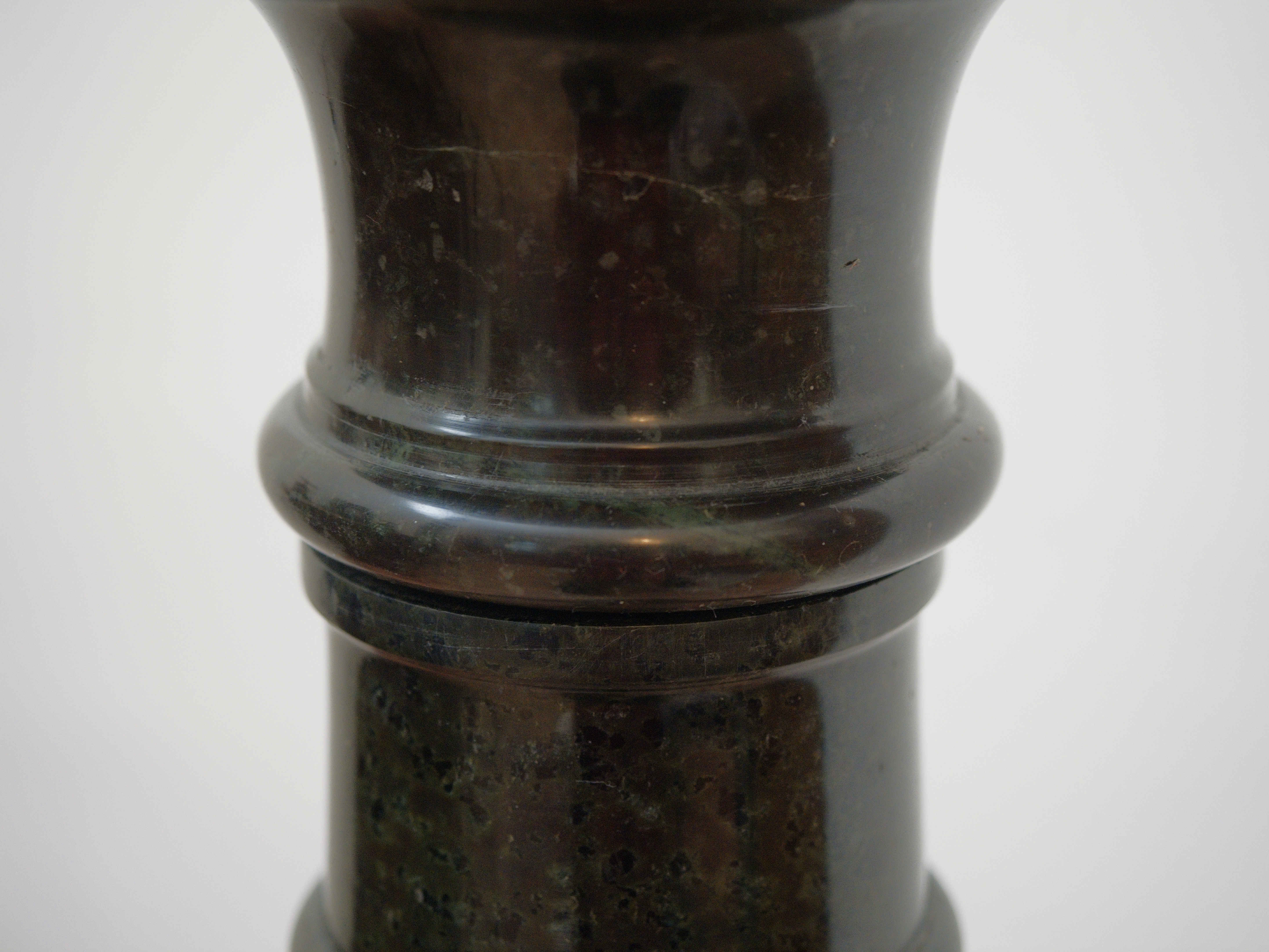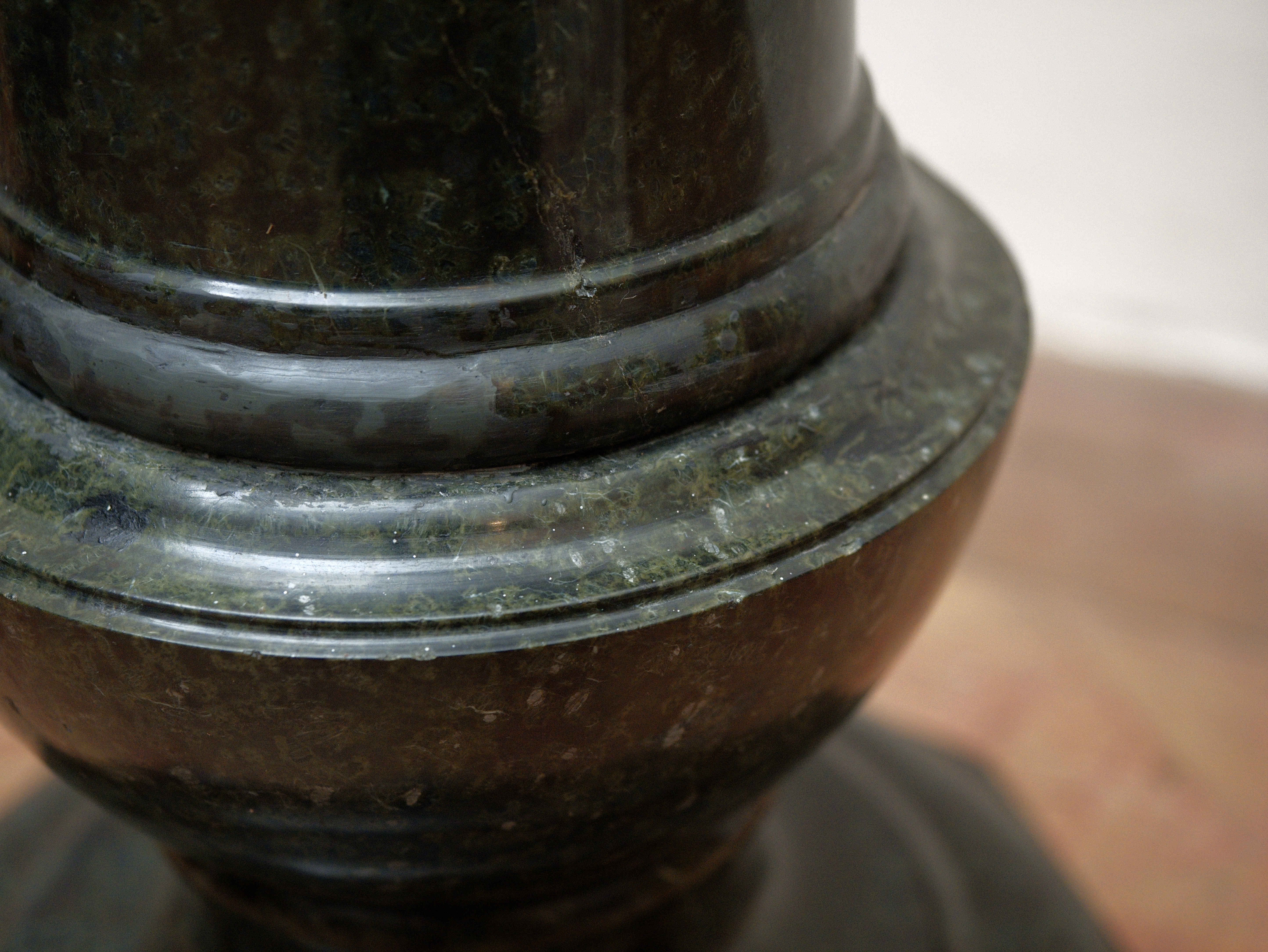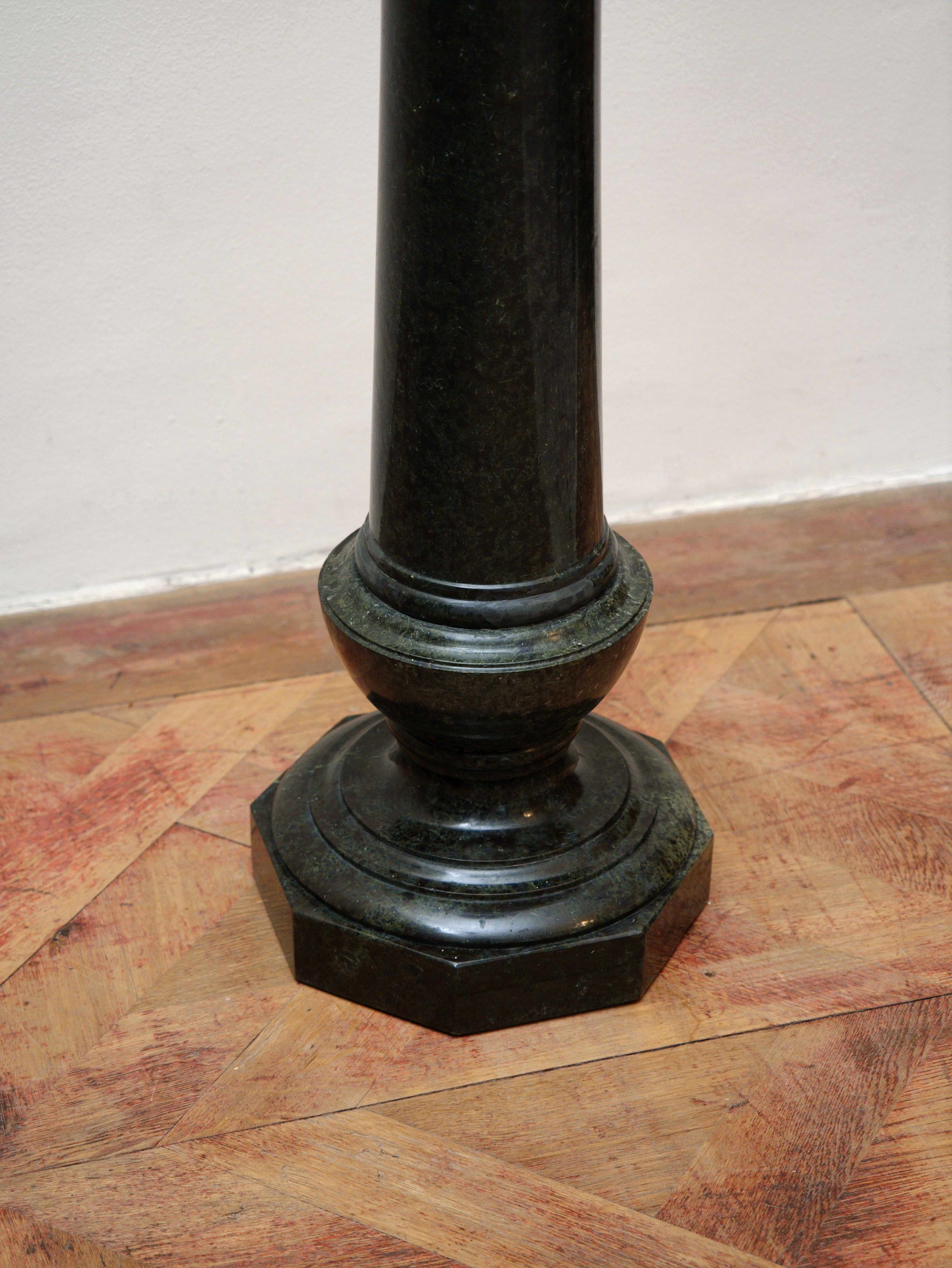 Celek působí velmi ušlechtile a reprezentativně. Díky výrazné kresbě zeleného mramoru a klasickému architektonickému tvaru je podstavec ideální pro vystavení sochy, porcelánu, bronzu nebo jiné sběratelské dekorace. Jedná se o autentickou ruční práci z období kolem roku 1830, nikoli o novodobou strojovou reprodukci. Stav je velmi dobrý.