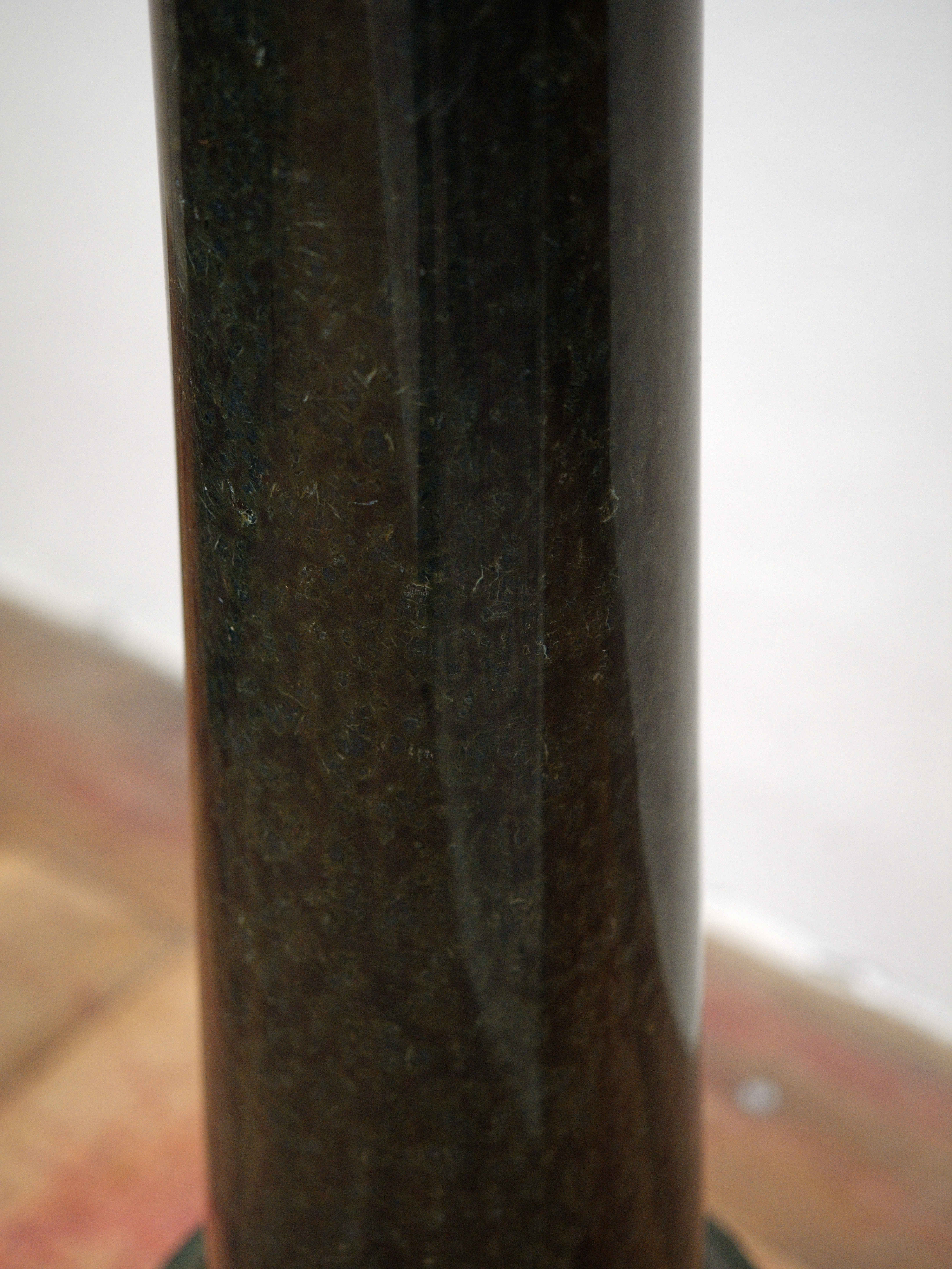 Sloup je soustružen a ručně opracován z jednoho druhu kamene, což je patrné na jemných nepravidelnostech povrchu i přirozené kresbě mramoru. Tvarování je elegantně členěno – od stabilní polygonální základny přechází do štíhlého dříku a končí kruhovou hlavicí určenou pro vystavení dekorativního objektu. Hlavice je odnímatelná a podstavec lze rozdělit na dvě části, což usnadňuje manipulaci i transport.