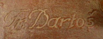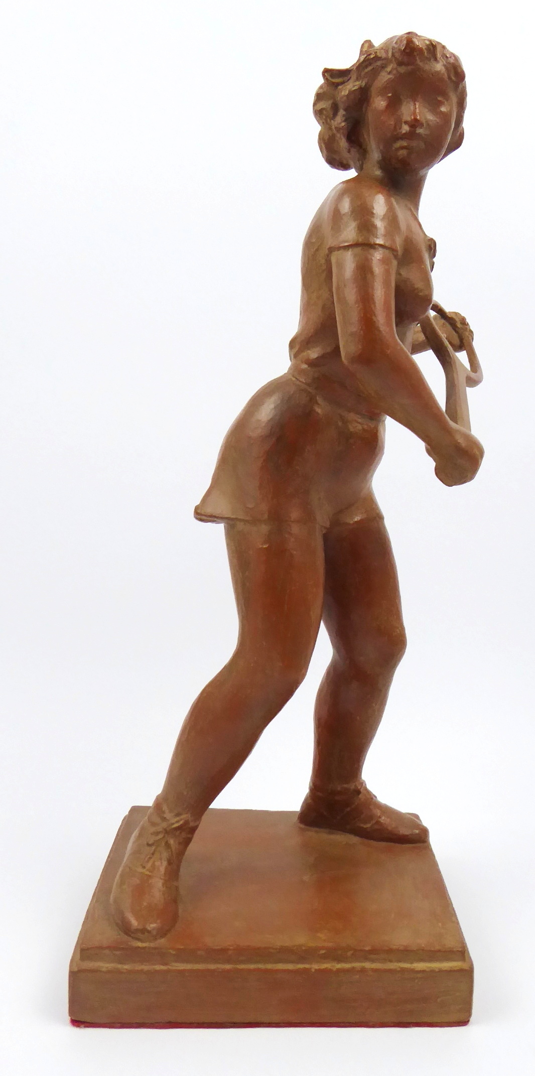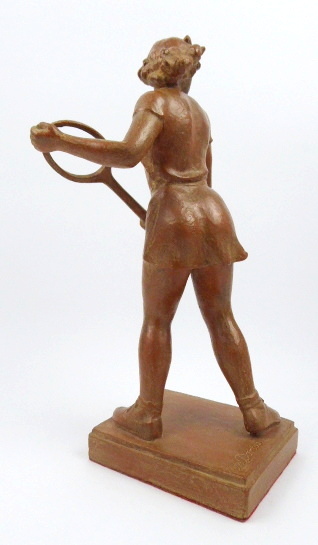Terakota. Autor: František Bartoš (1911-1981) akademický sochař vystudovaný na Akademii výtvarných umění v ateliéru slavného Josefa Gočára. Signováno na plintě na horní části: Fr. Bartoš. Terakotová socha velmi precizně ztvárněné anatomie tenistky zachycené při bekhendu, jednom ze základních tenisových úderů, kdy se míč zasahuje raketou podél levé části těla. Na obdélném nižším podstavci. Československo, 40. až 50. léta minulého století. Výška 39 cm, rozměr podstavce 15 cm x 13 cm.