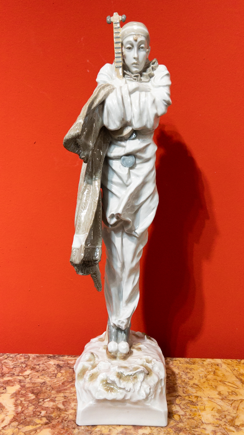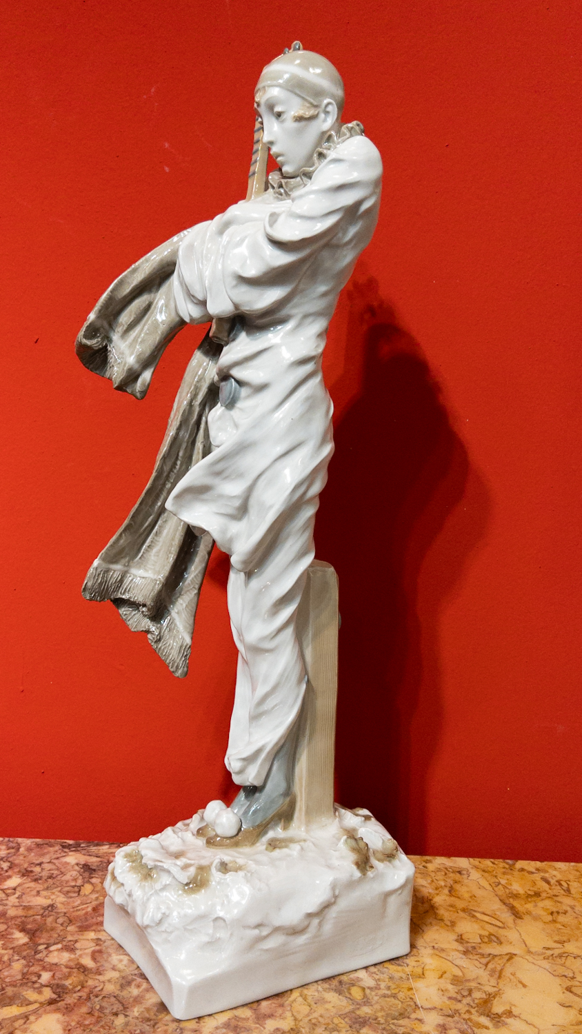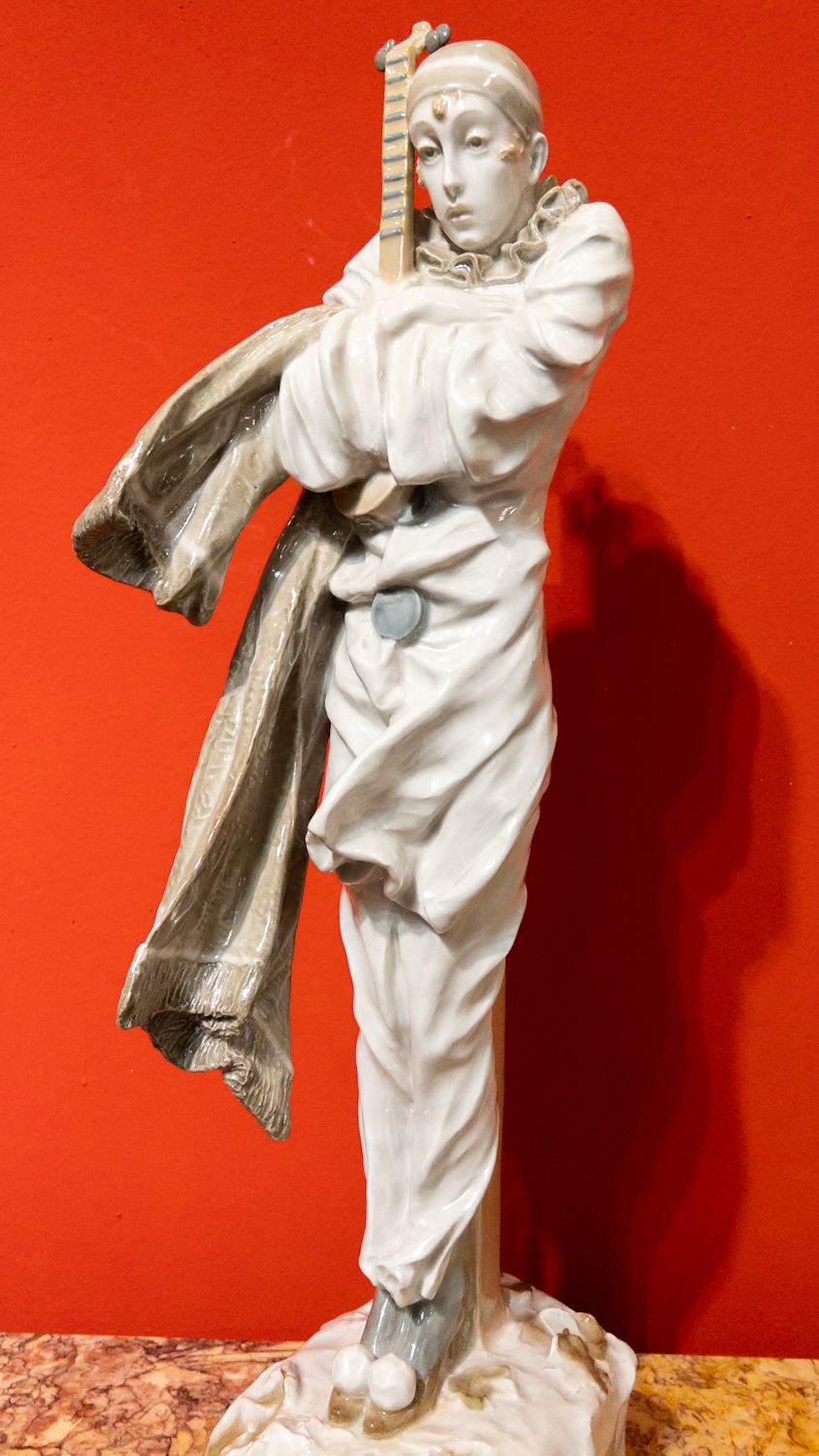 nádherná, detailně provedená keramická plastika vysokého pierota s loutnou, byla navržena významným českým sochařem první třetiny 20. století, Františkem Rousem