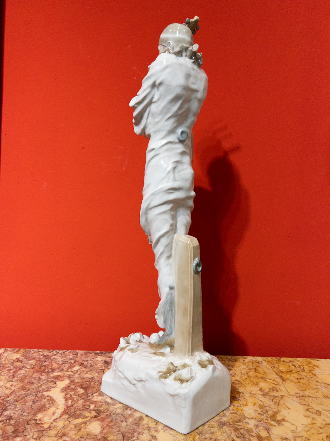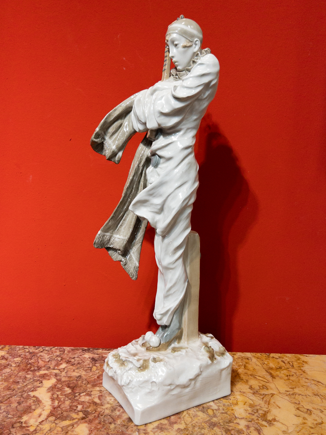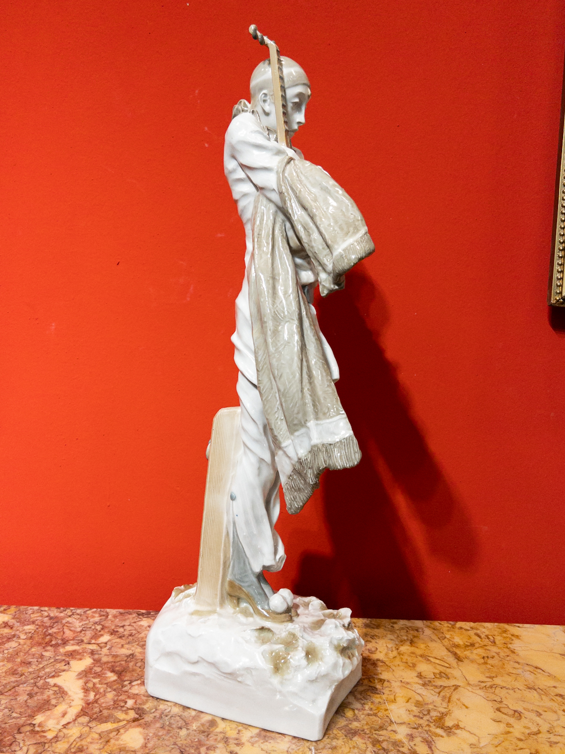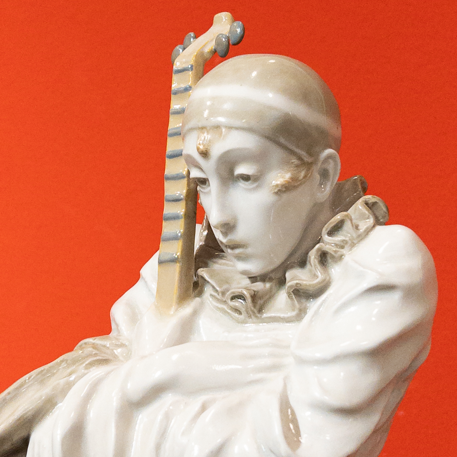 nádherná, detailně provedená keramická plastika vysokého pierota s loutnou, byla navržena významným českým sochařem první třetiny 20. století, Františkem Rousem