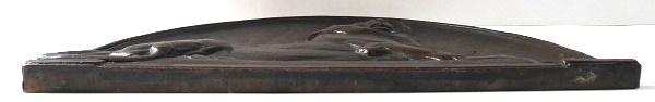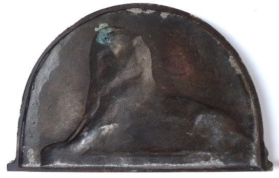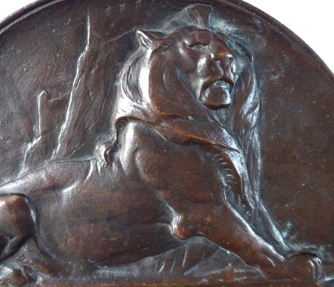 Patinovaný bronz. Autor reliéfu: Frédéric Auguste Bartholdi ( 1834 – 1904 ) tvůrce slavné Sochy Svobody v New Yorku. Bronzový reliéf ve tvaru lunety s reliéfní postavou ležícího lva na vzpřímených předních tlapách a zdviženou hlavou. Slavná socha Belfortského lva vznikla jako oslava a poděkování francouzským vojákům, kteří v roce 1870 statečně bránili po dobu 103 dnů obležené město Belfort proti pruské přesile. Francie 1875 – 1895. Výška 14,5 cm, šířka 23 cm.