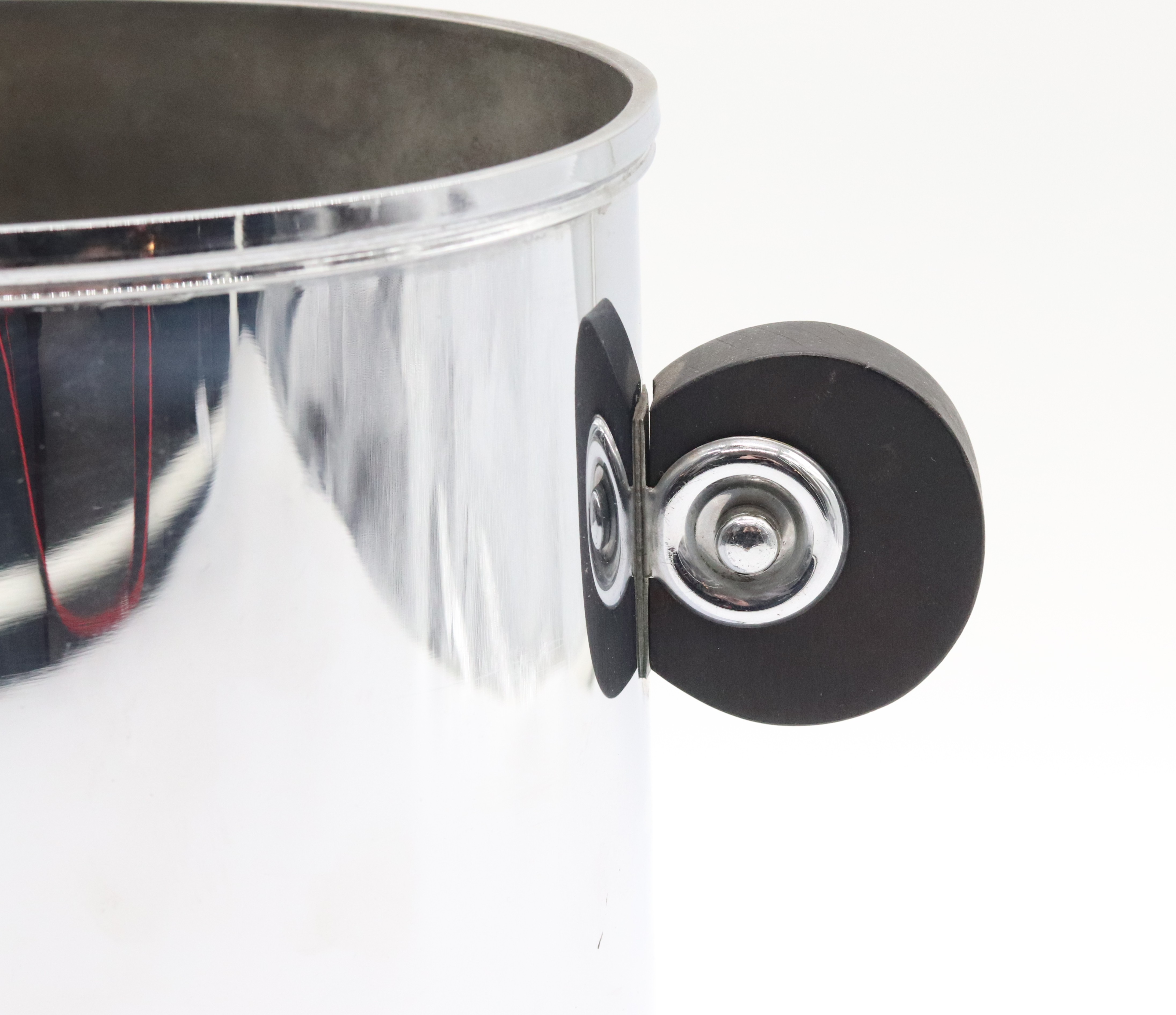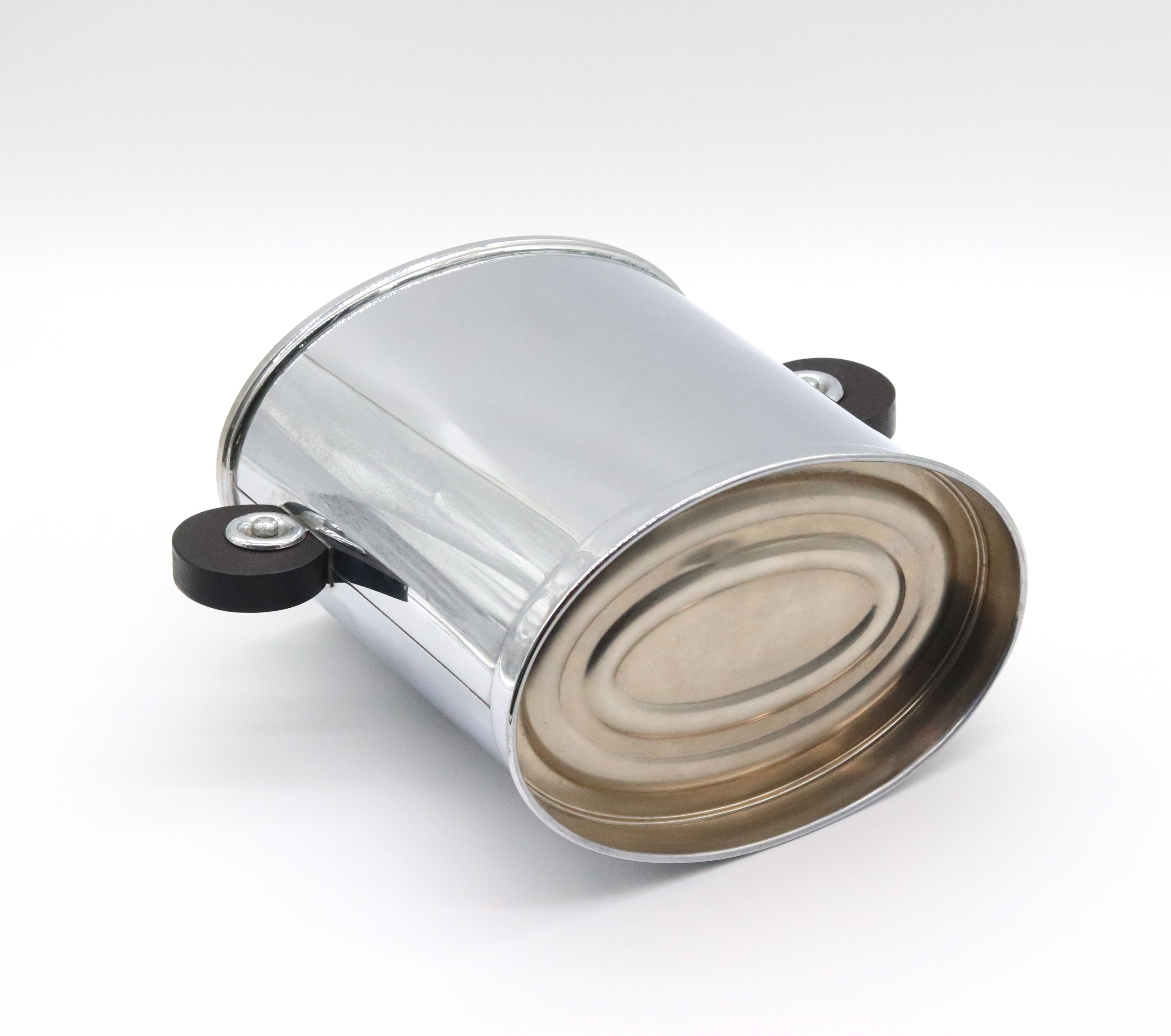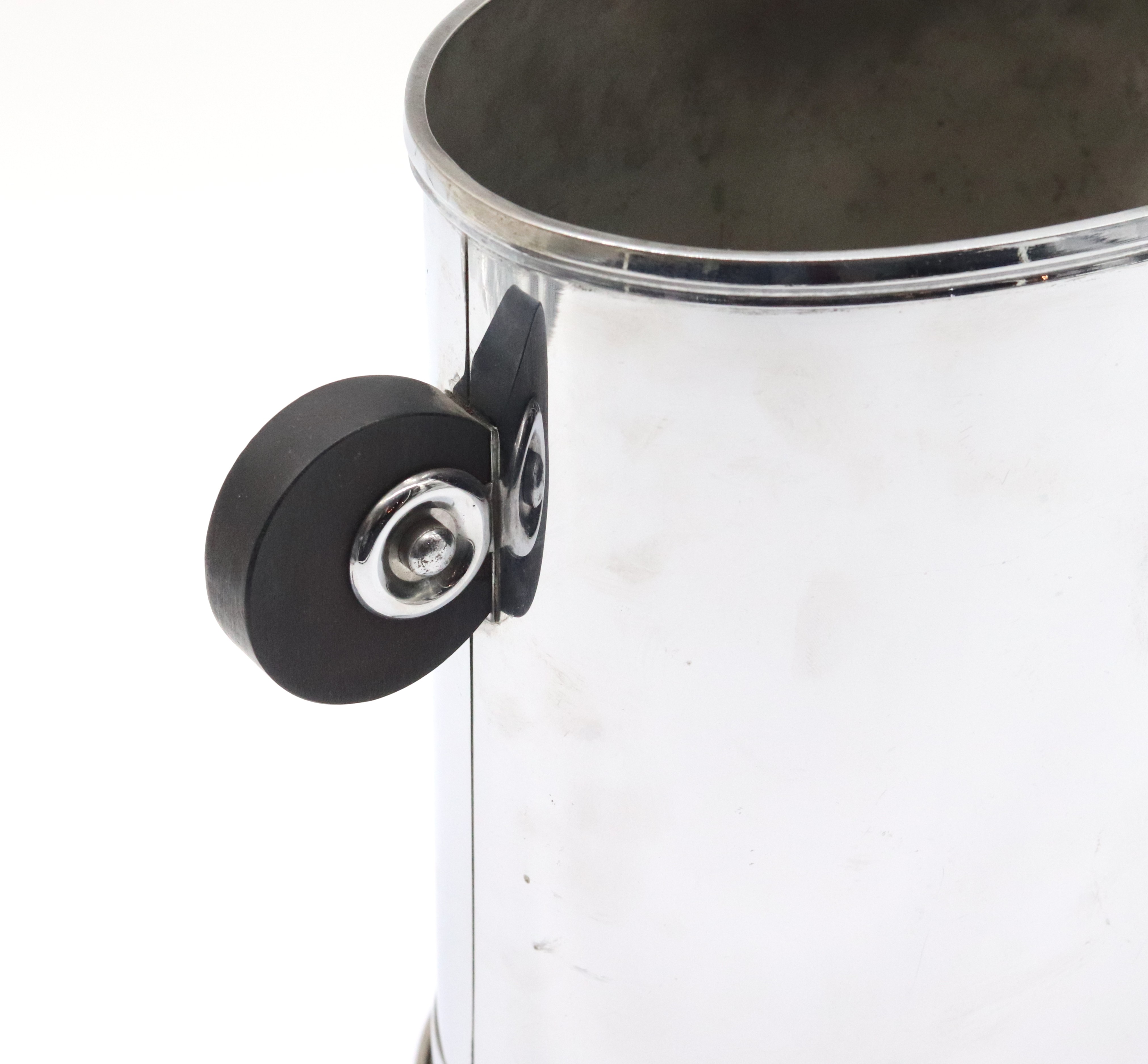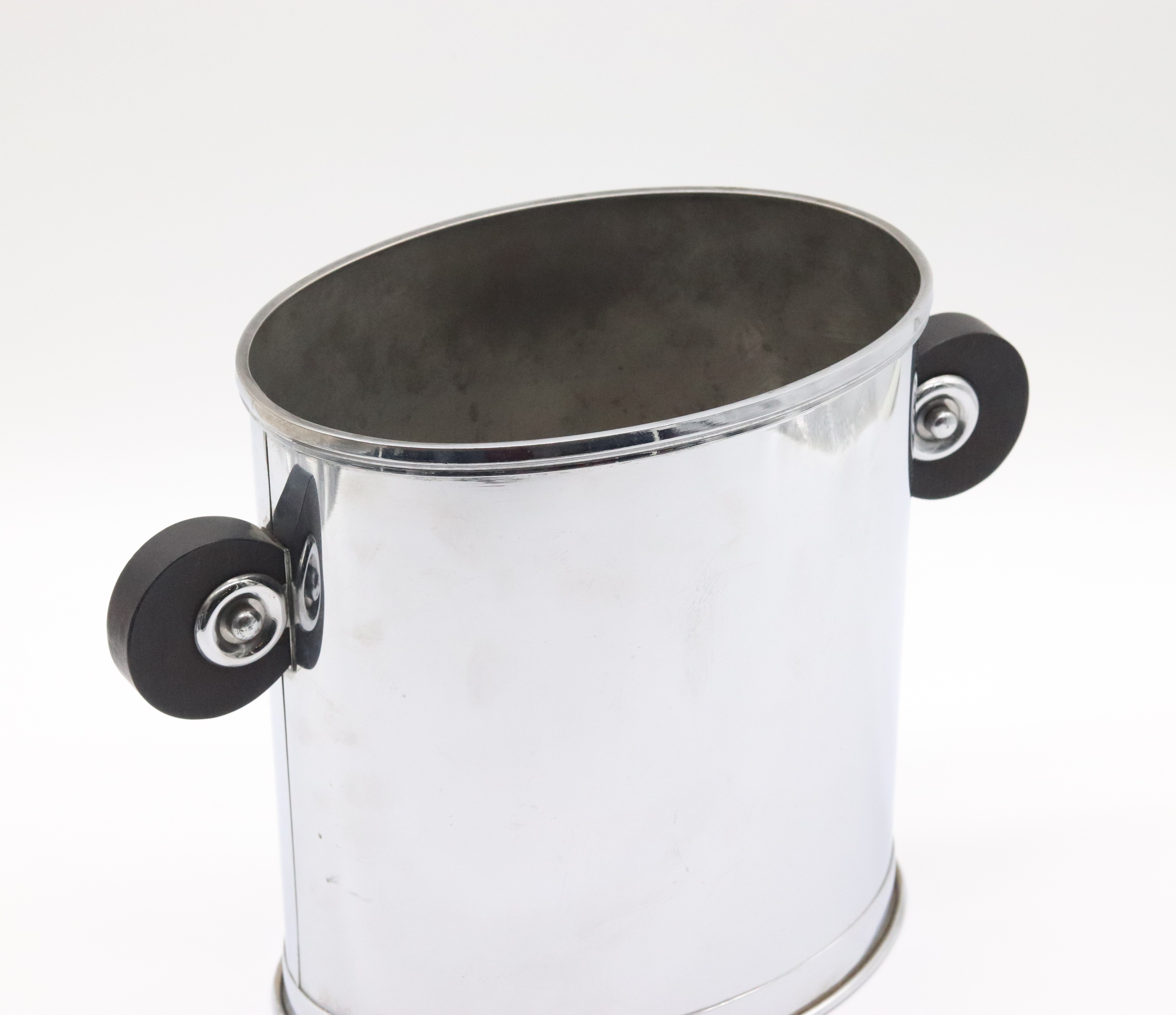 Funkcionalistický oválný chladič na víno, ice kýbl, pochromovaný obecný kov se dřevěnými kruhovými uchy, tvarově, západní Evropa, 30. léta 20. století; výška 23,5 cm, délka 21,5 cm, šířka 14,5 cm