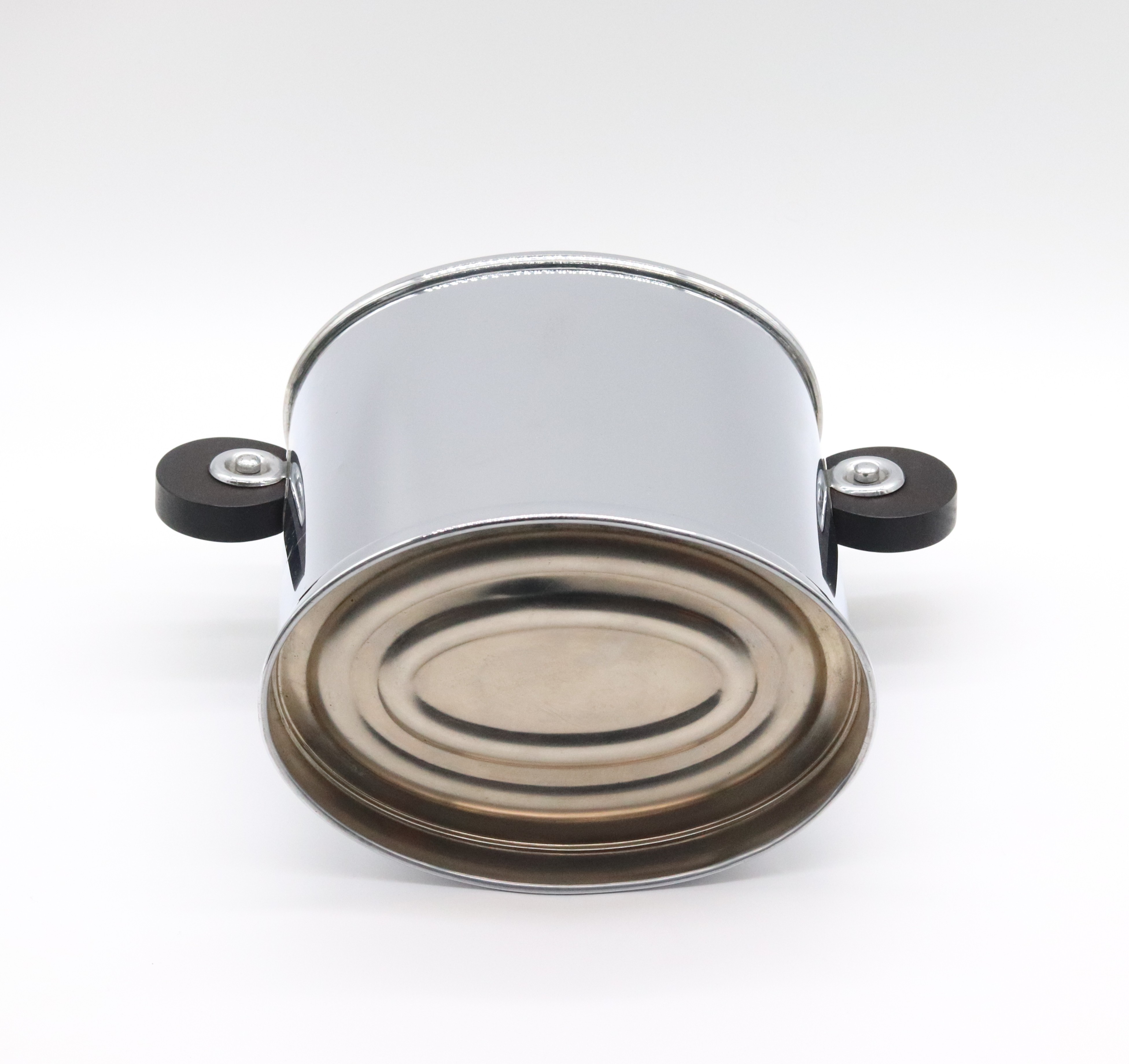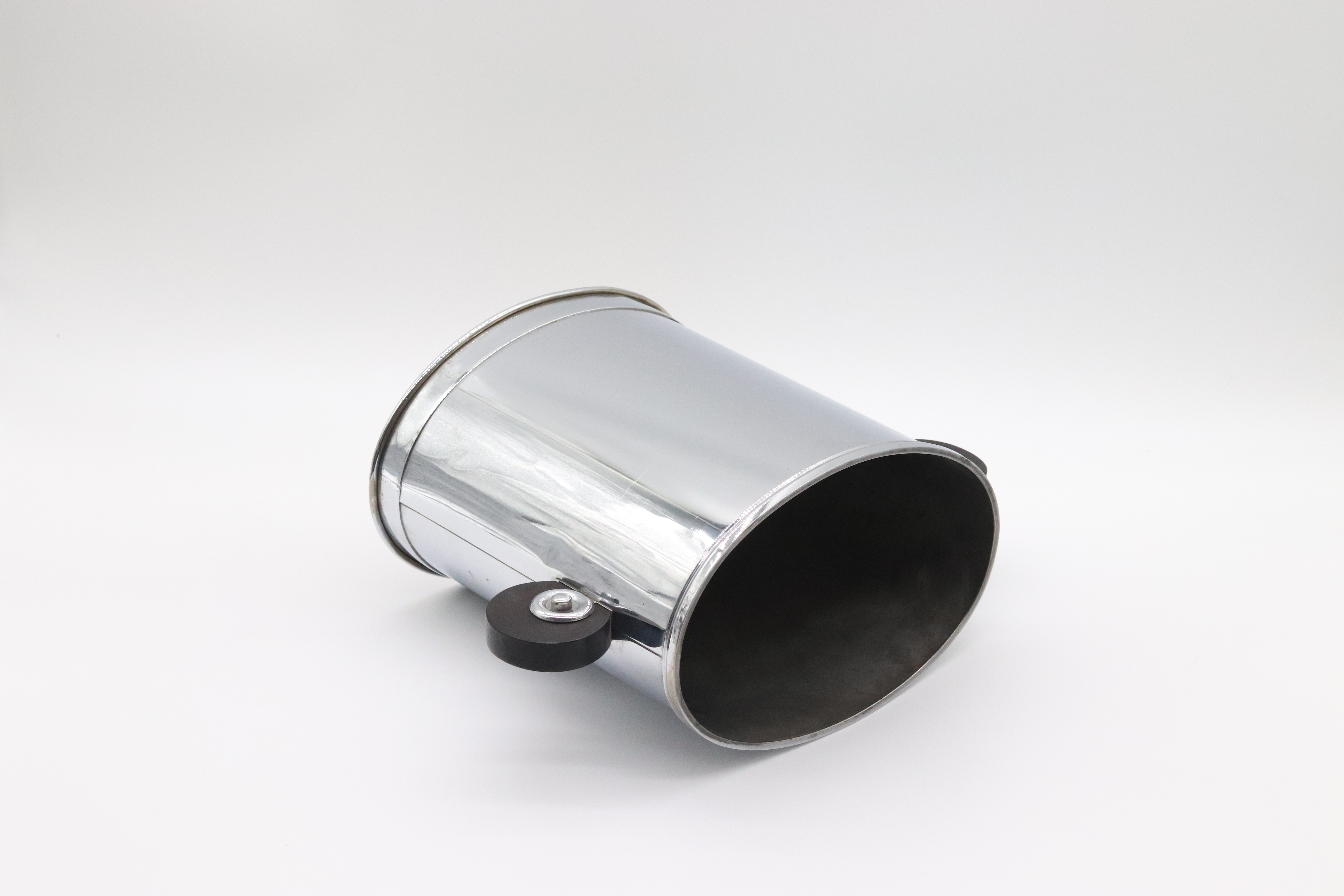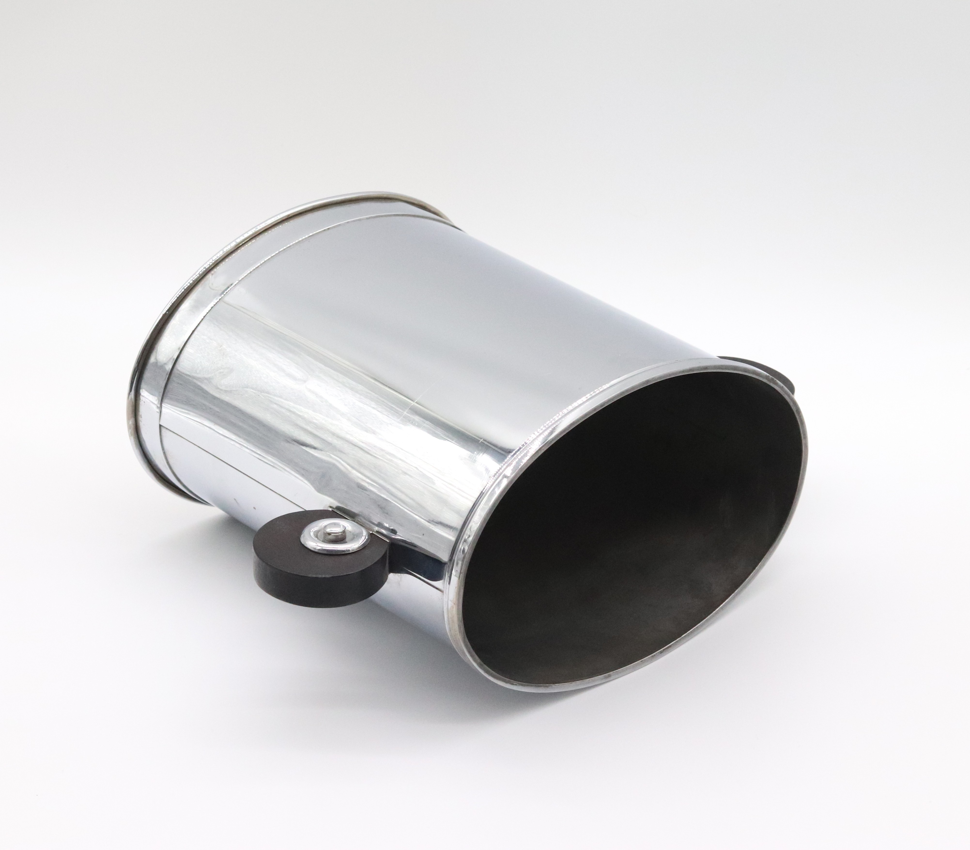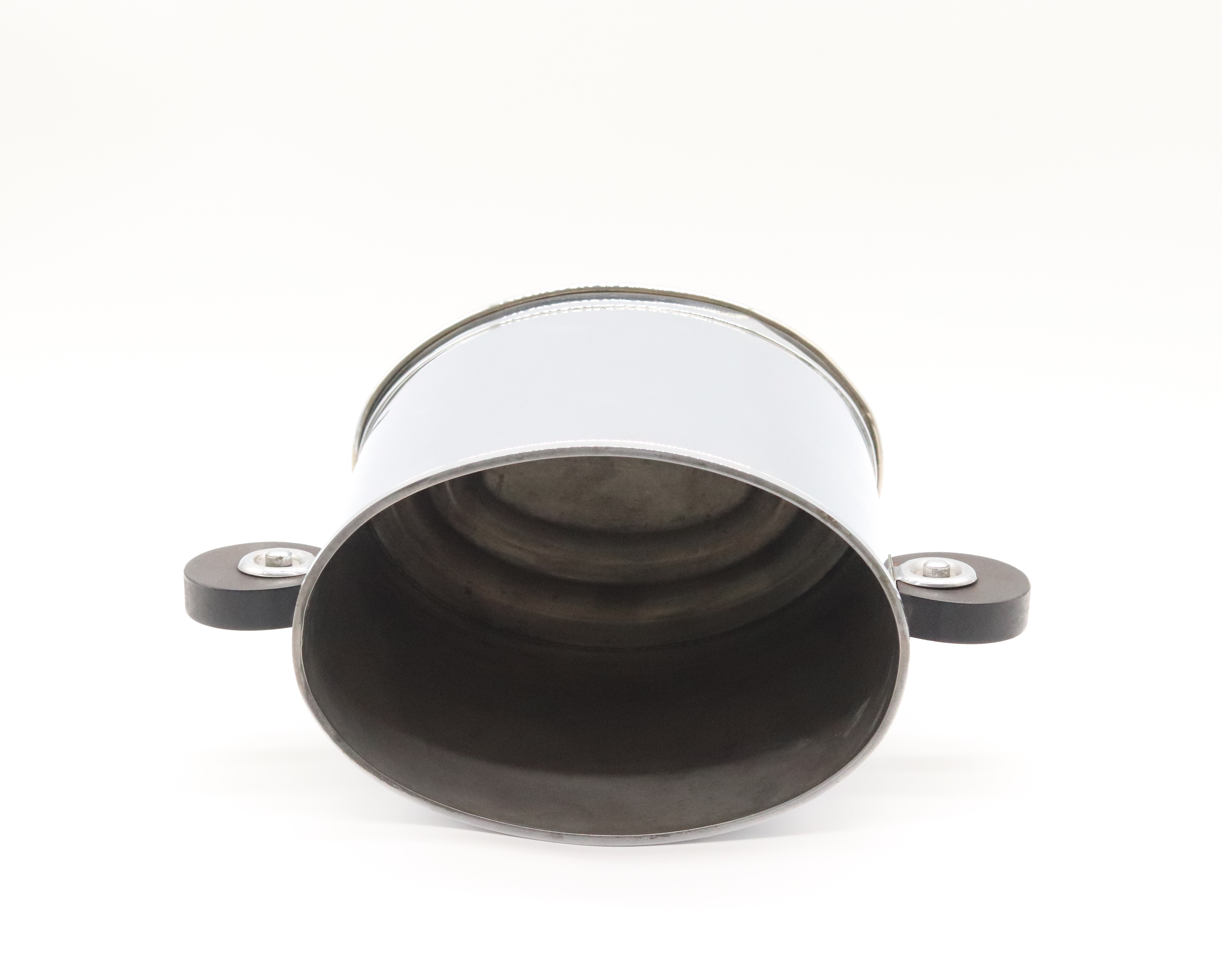 Funkcionalistický oválný chladič na víno, ice kýbl, pochromovaný obecný kov se dřevěnými kruhovými uchy, tvarově, západní Evropa, 30. léta 20. století; výška 23,5 cm, délka 21,5 cm, šířka 14,5 cm