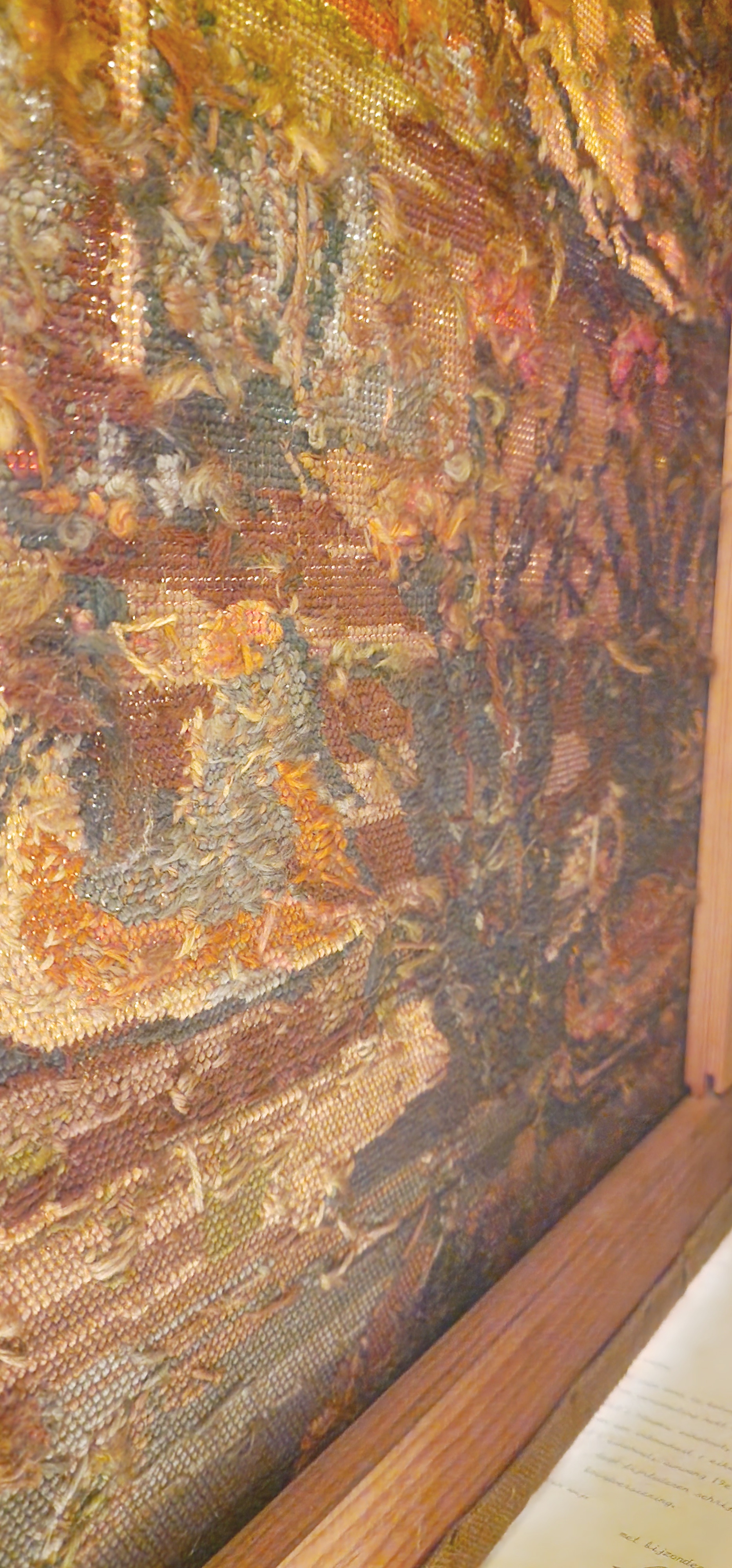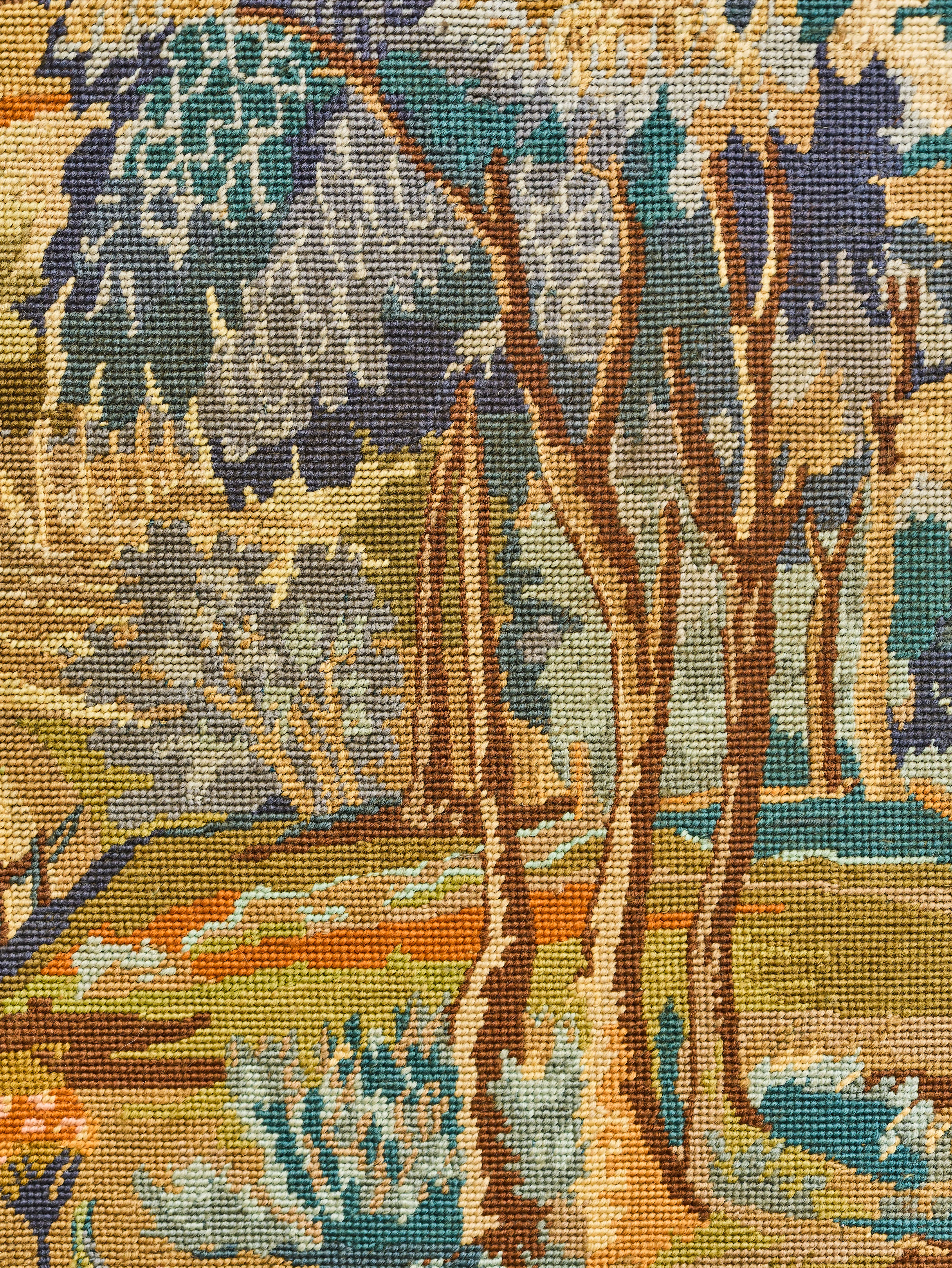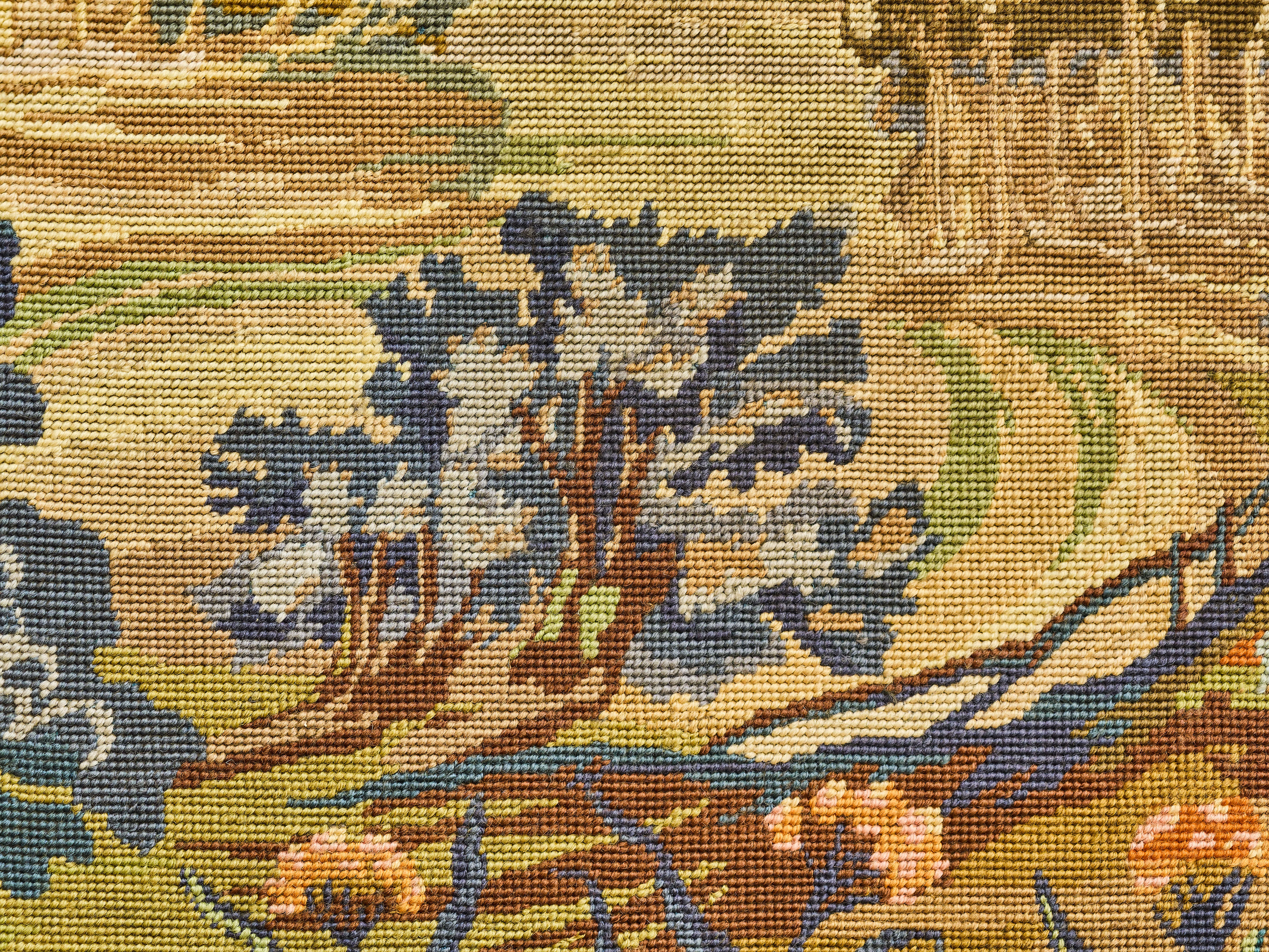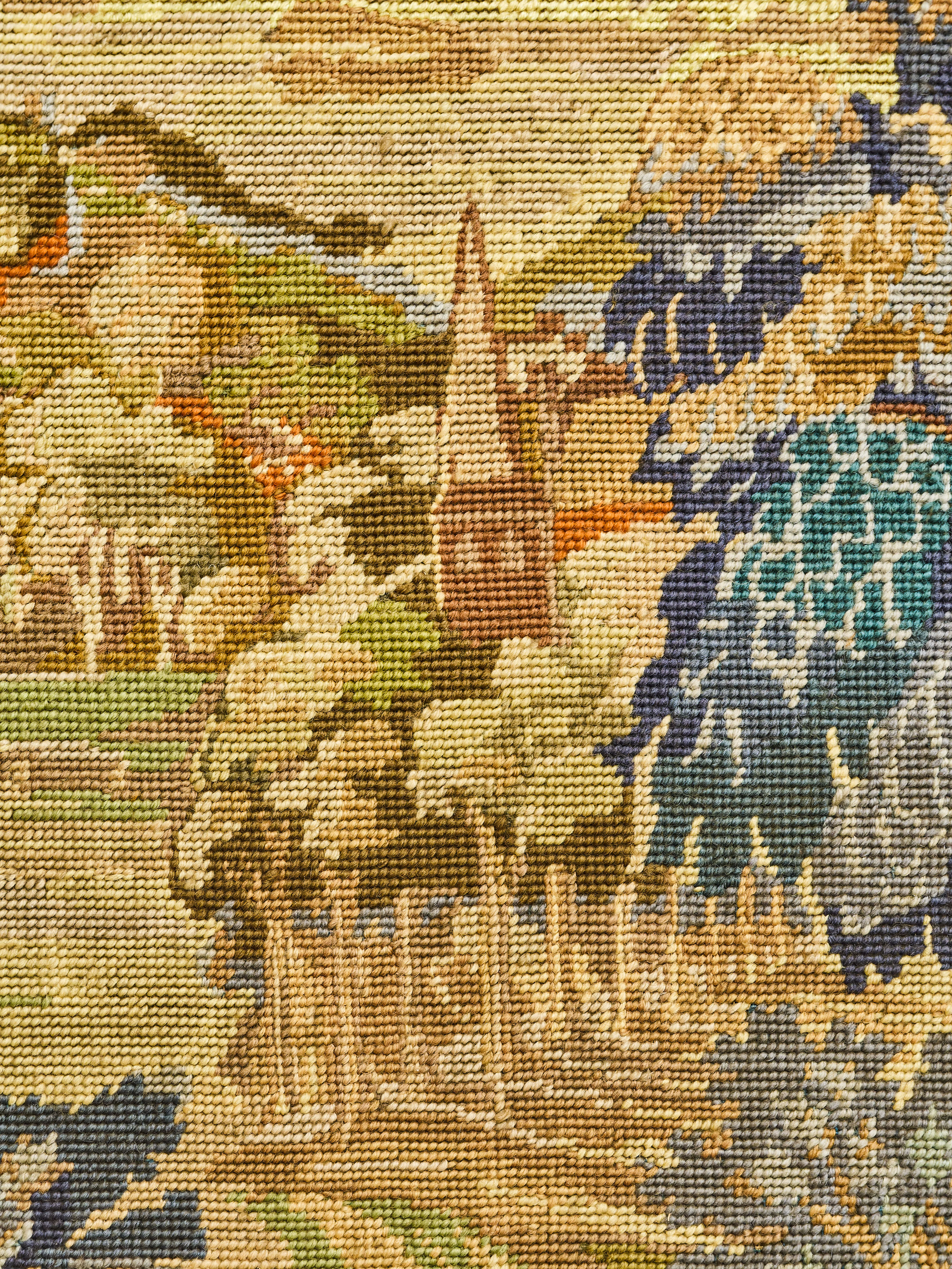 Ručně vyšívaná tapiserie s klasickým krajinářským motivem bohatě zpracovaným do detailů. V popředí se nachází hustá vegetace s listnatými stromy, křovinami a květinami, mezi nimiž se objevují i drobní ptáci. V dolní části lze spatřit vodní plochu s párem plovoucích kachen. Scéna pokračuje do hloubky a odhaluje cestu vedoucí lesním porostem přes mostek, která mizí mezi stromy. V pozadí vystupuje zvlněná krajina s poli, vinicemi a charakteristickou siluetou věžiček a budov, což připomíná romantickou představu ideálního venkovského kostelíku.