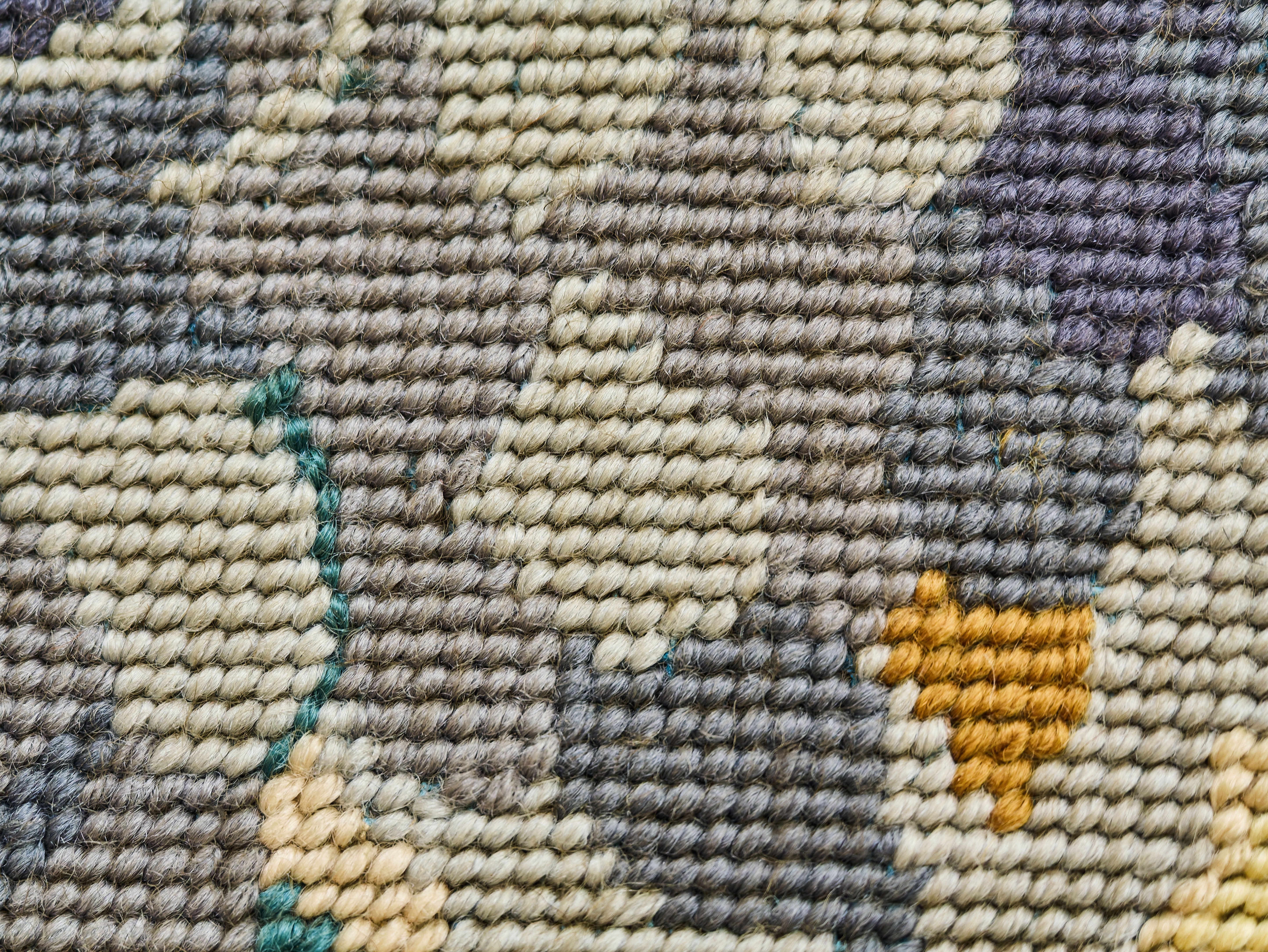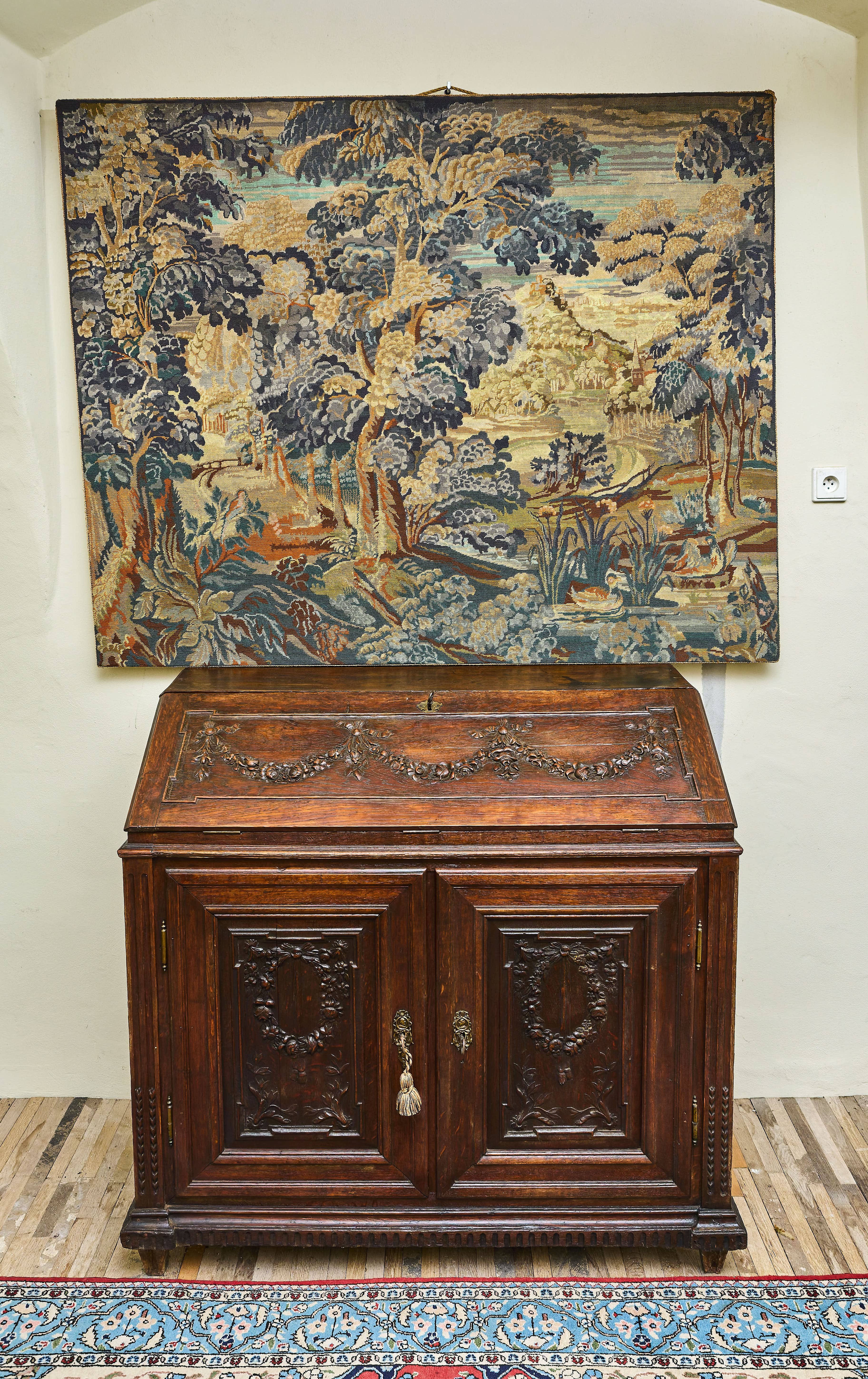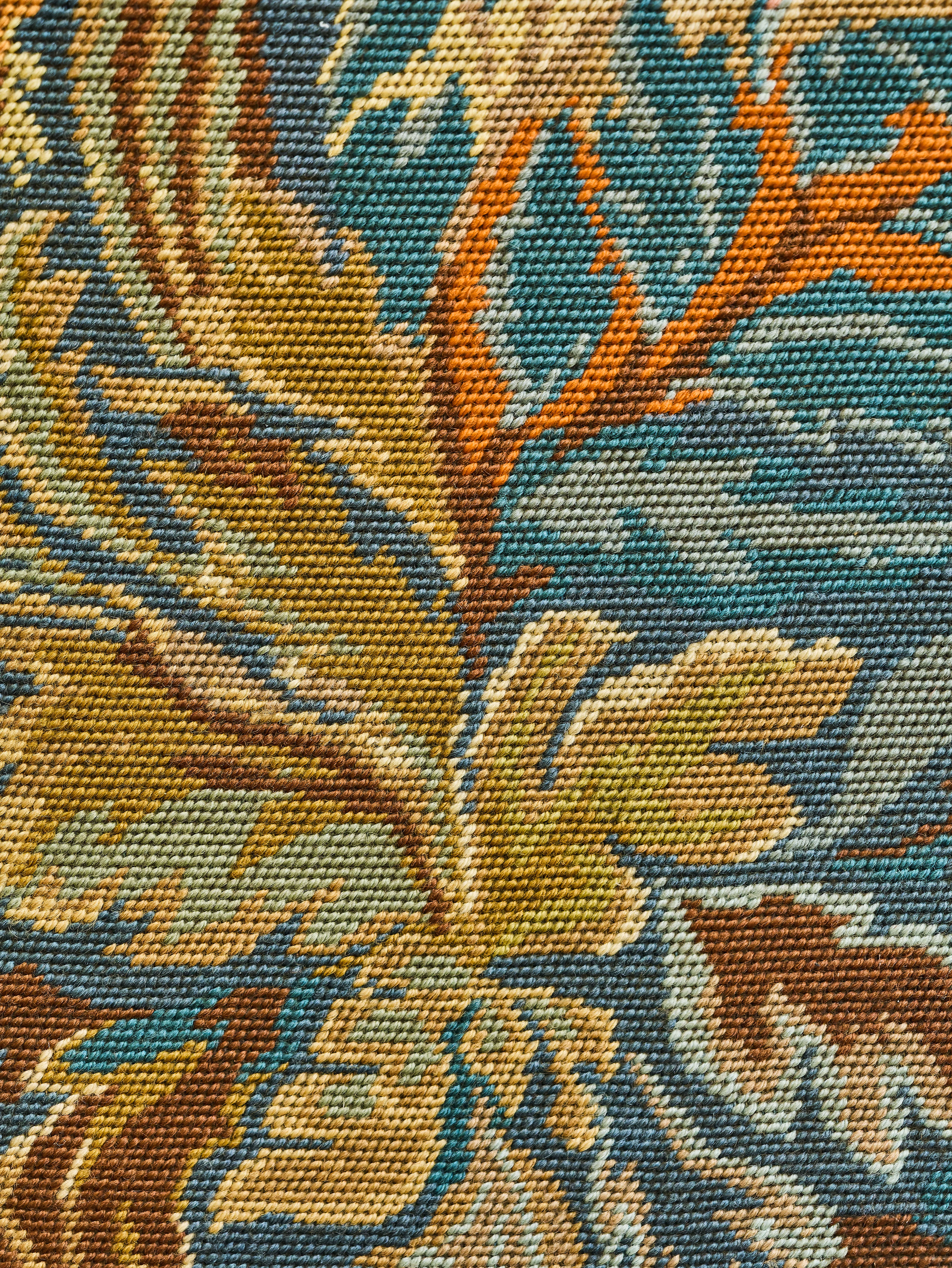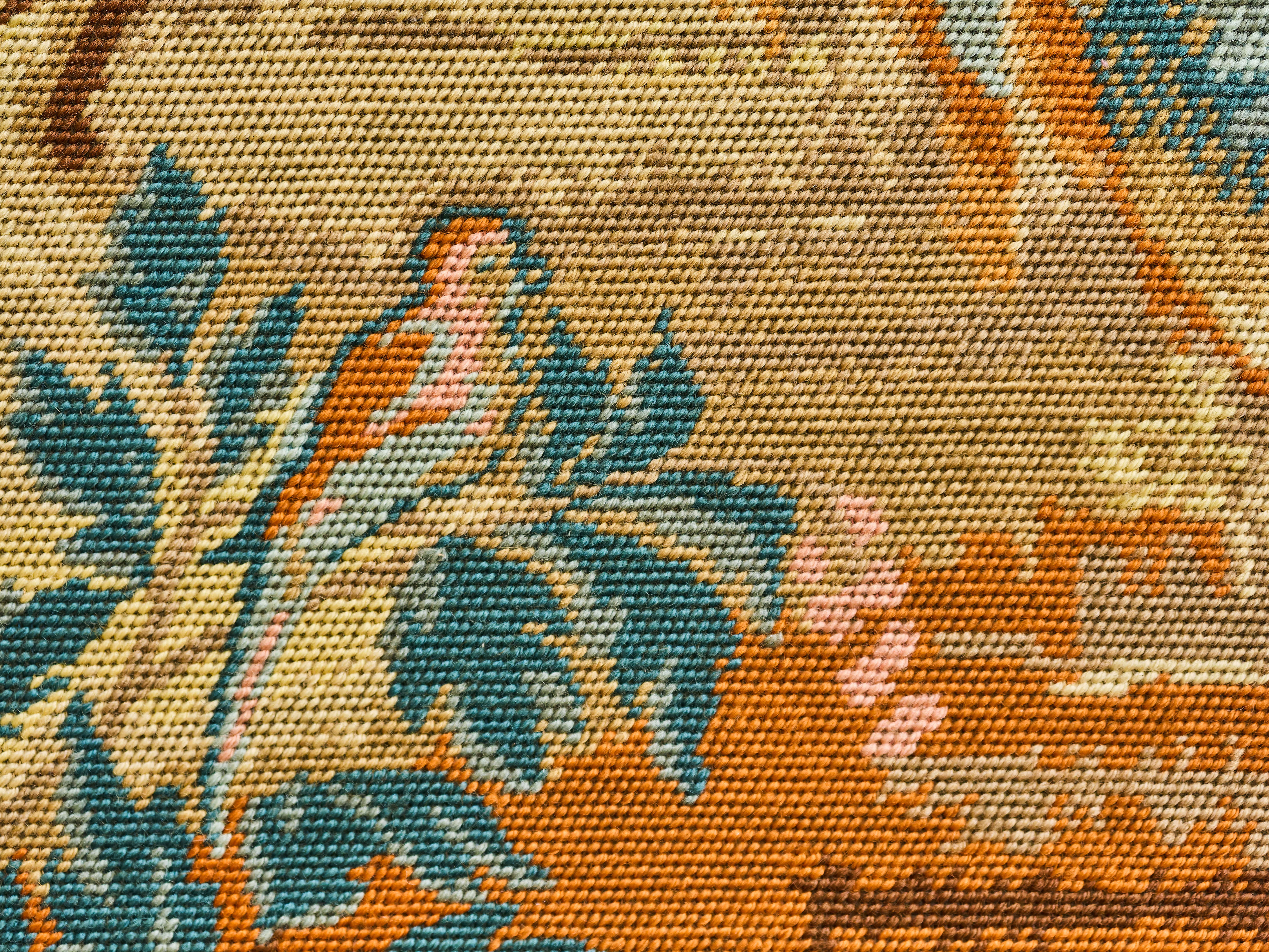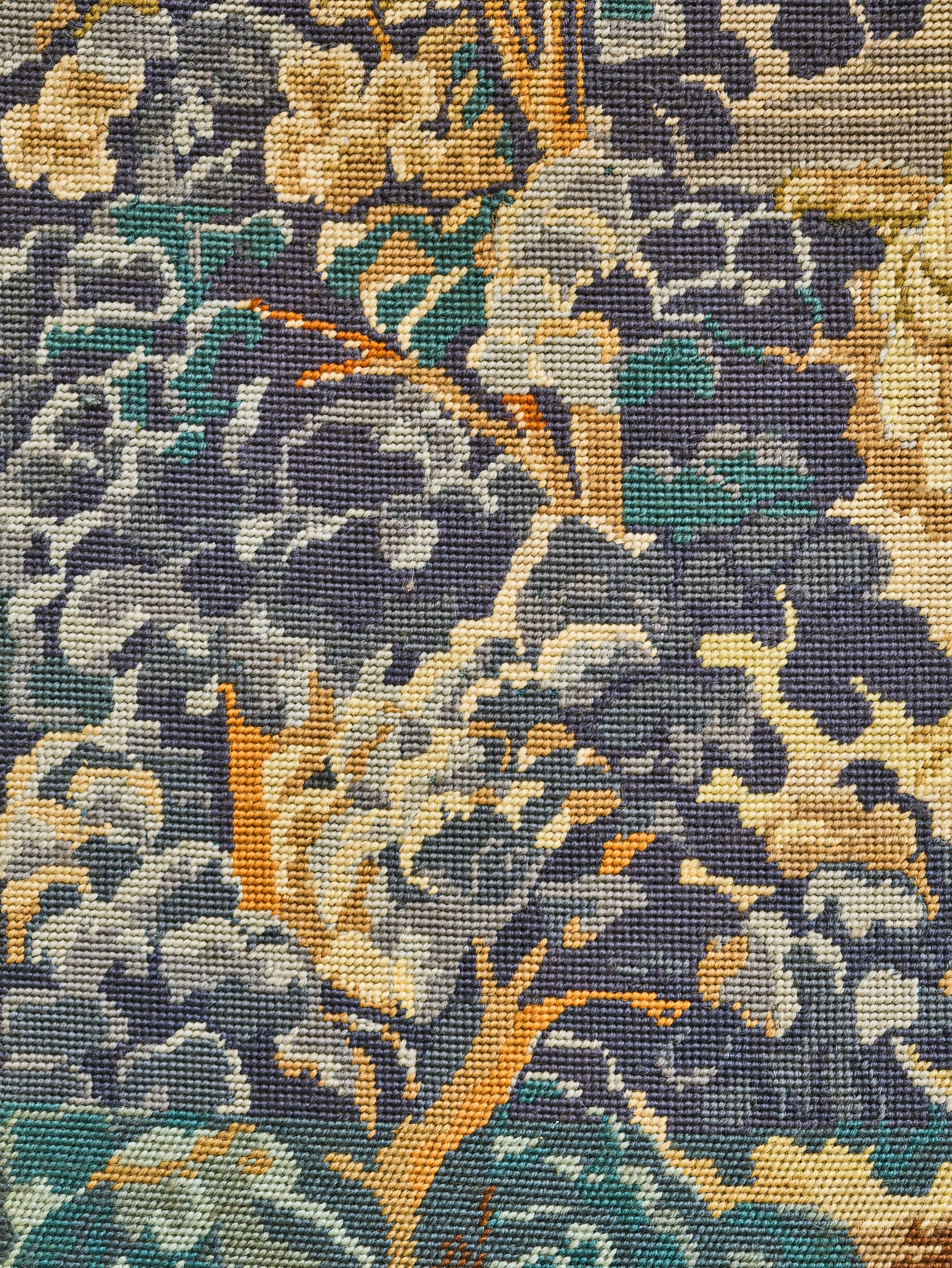 Barevnost tapiserie je výrazná, s převahou zelených, modrých a zlatavých odstínů, které dodávají celku živost a hloubku. Motiv působí harmonicky a dekorativně, připomíná klasické tapiserie francouzského či vlámského typu inspirované přírodou a architekturou.