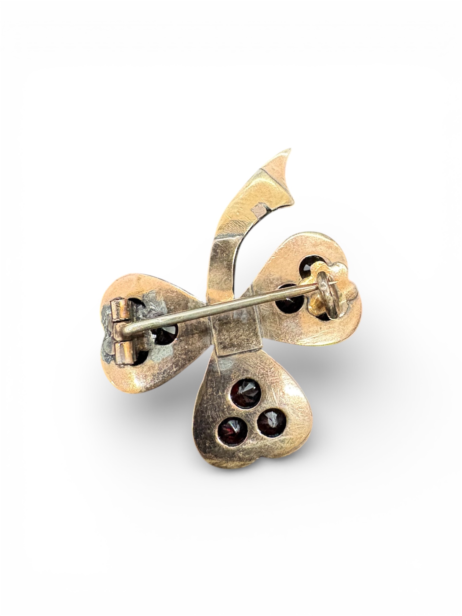 Brož ve tvaru trojlístku v tombaku s českými granáty. Velikost: 2,5 x 3 cm. Čechy, 2. polovina 19. století.