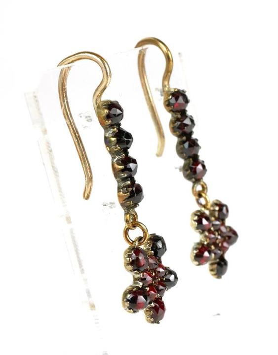 Granátové náušnice Čechy, druhá polovina 19. století, český granát zasazený v tombaku, délka náušnice: 3,5 cm
