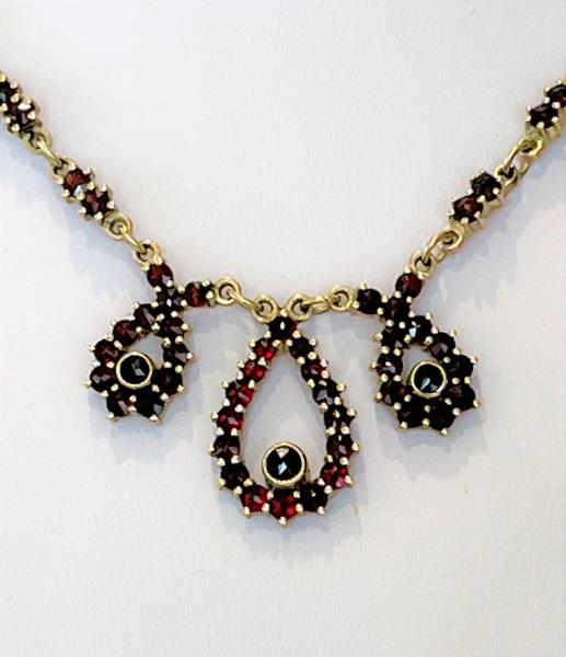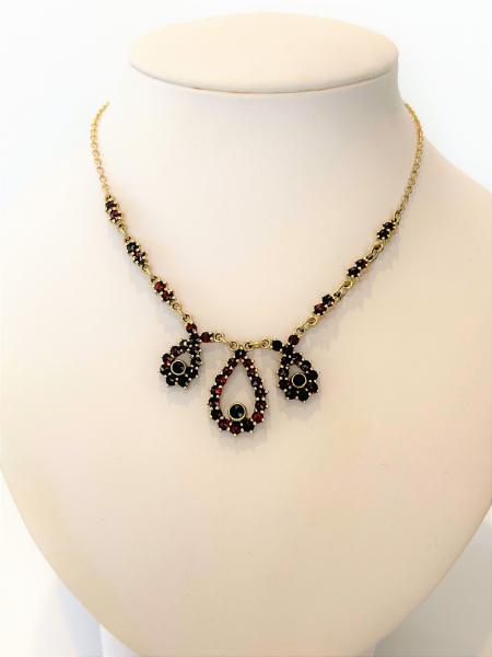 Krásný náhrdelník z jemně pozlaceného stříbra v ryzosti AG 900/1000 doplněný přírodními granáty, váha náhrdelníku 7,26 gramů brutto. Délka náhrdelníku cca 42,5 cm. Hezký stav šperku.
