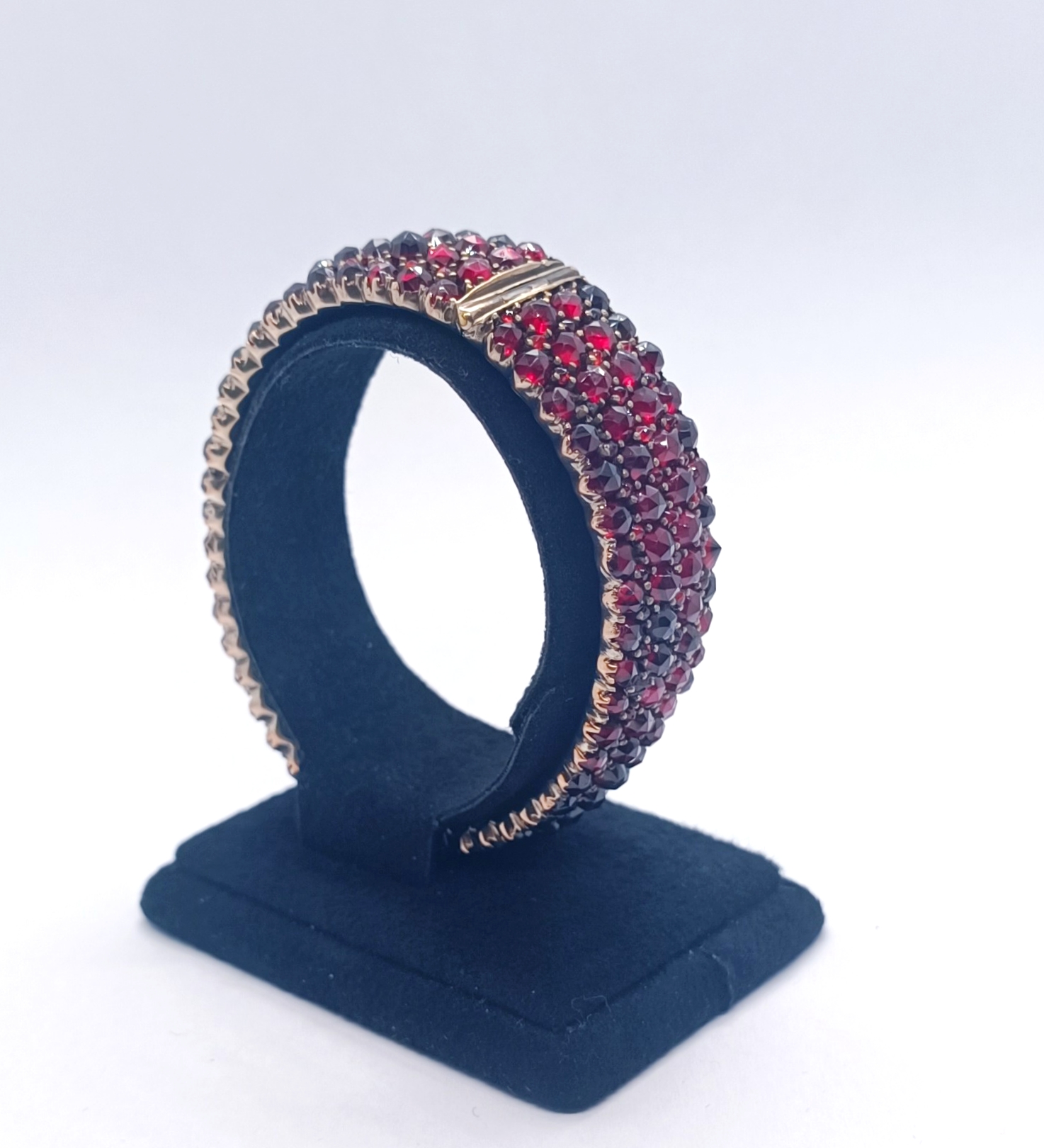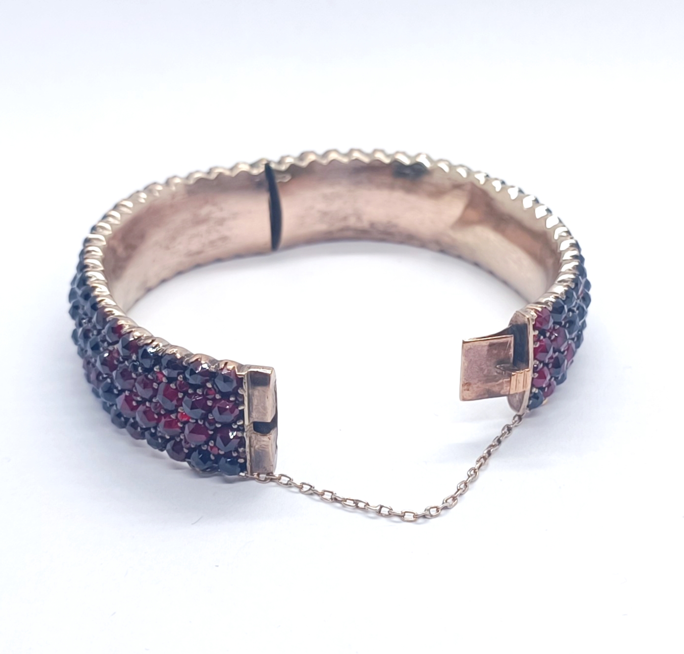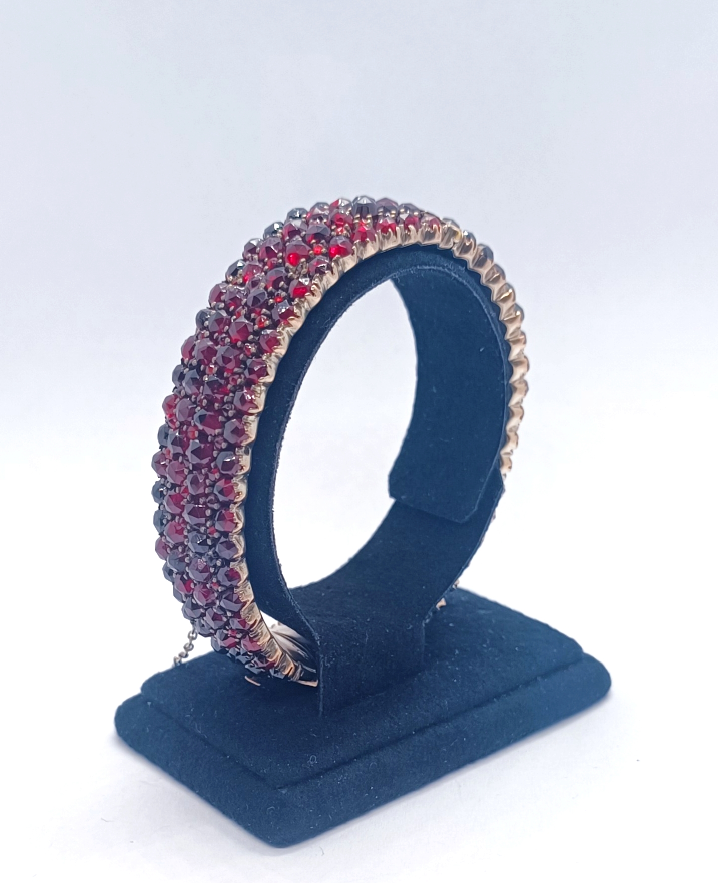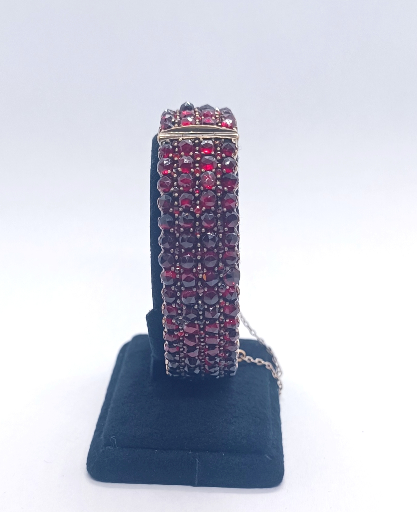 Čtyřřadý náramek z českých granátů osazených do tombaku, Čechy, kolem roku 1880, uvnitř náramku dvě promačkliny, které nemají vliv na nošení náramku; délka obvodu 17,5 cm, šířka 1,6 cm