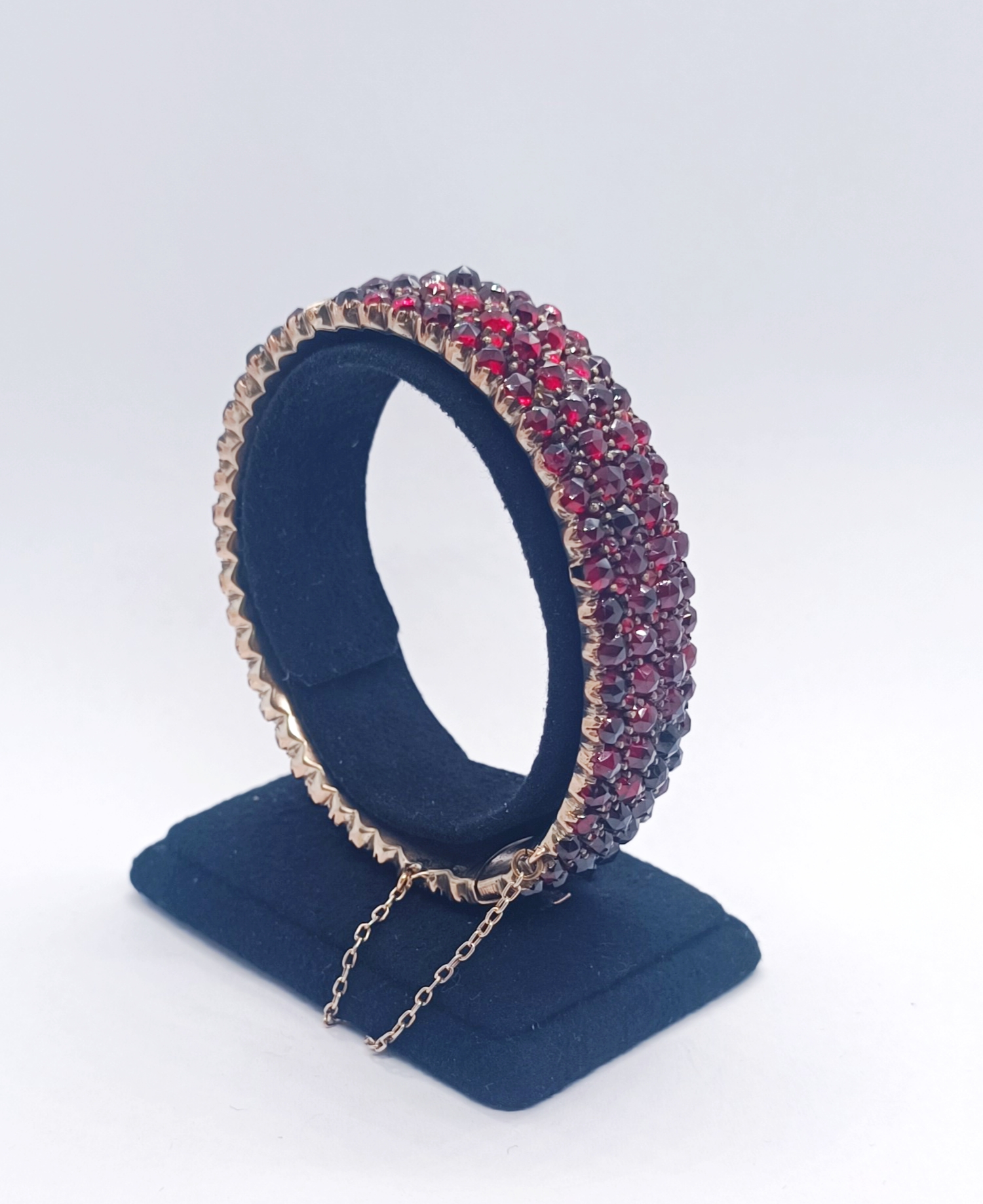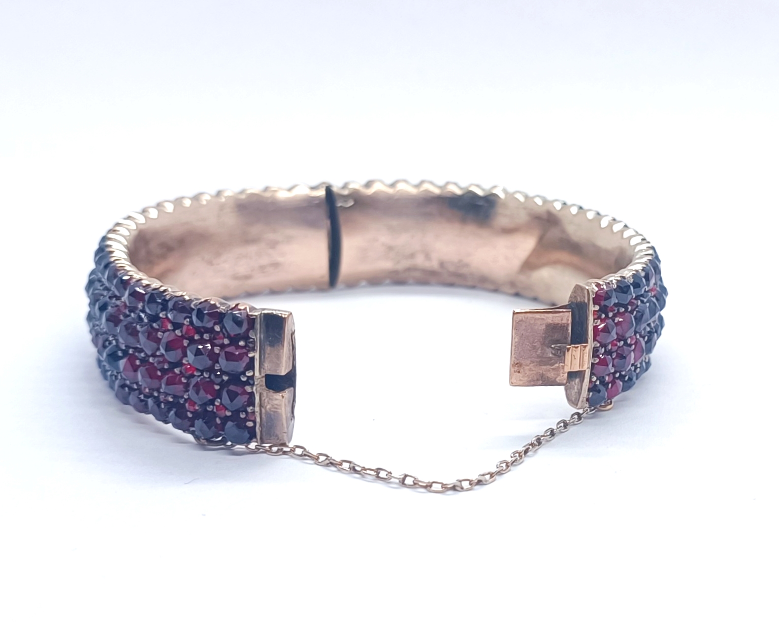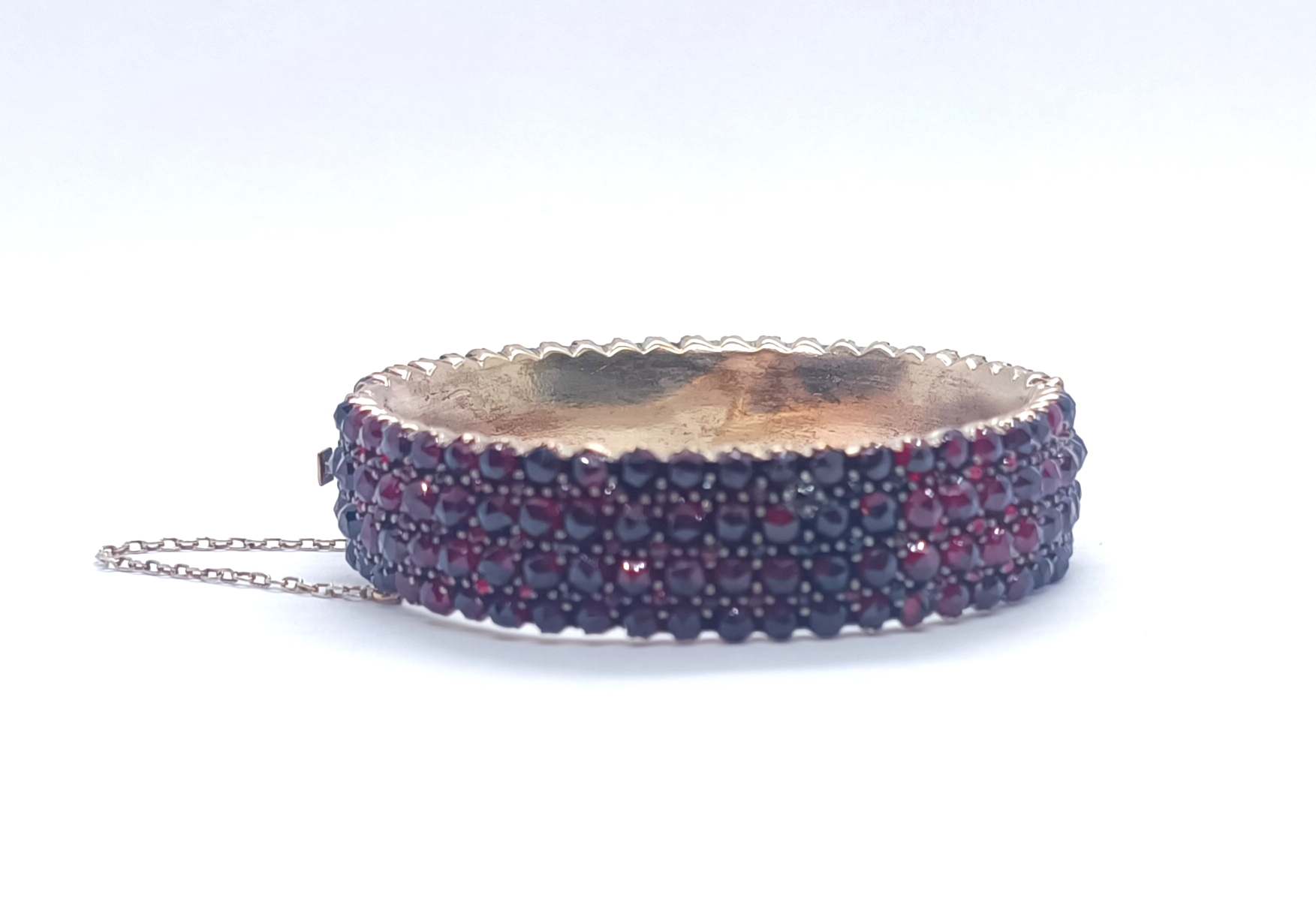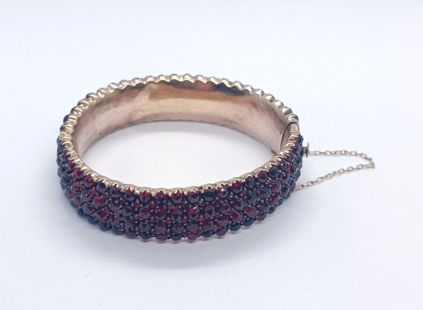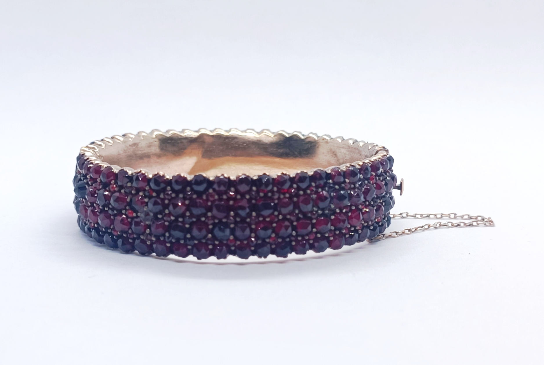 Čtyřřadý náramek z českých granátů osazených do tombaku, Čechy, kolem roku 1880, uvnitř náramku dvě promačkliny, které nemají vliv na nošení náramku; délka obvodu 17,5 cm, šířka 1,6 cm