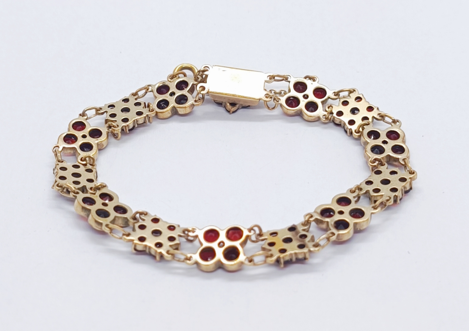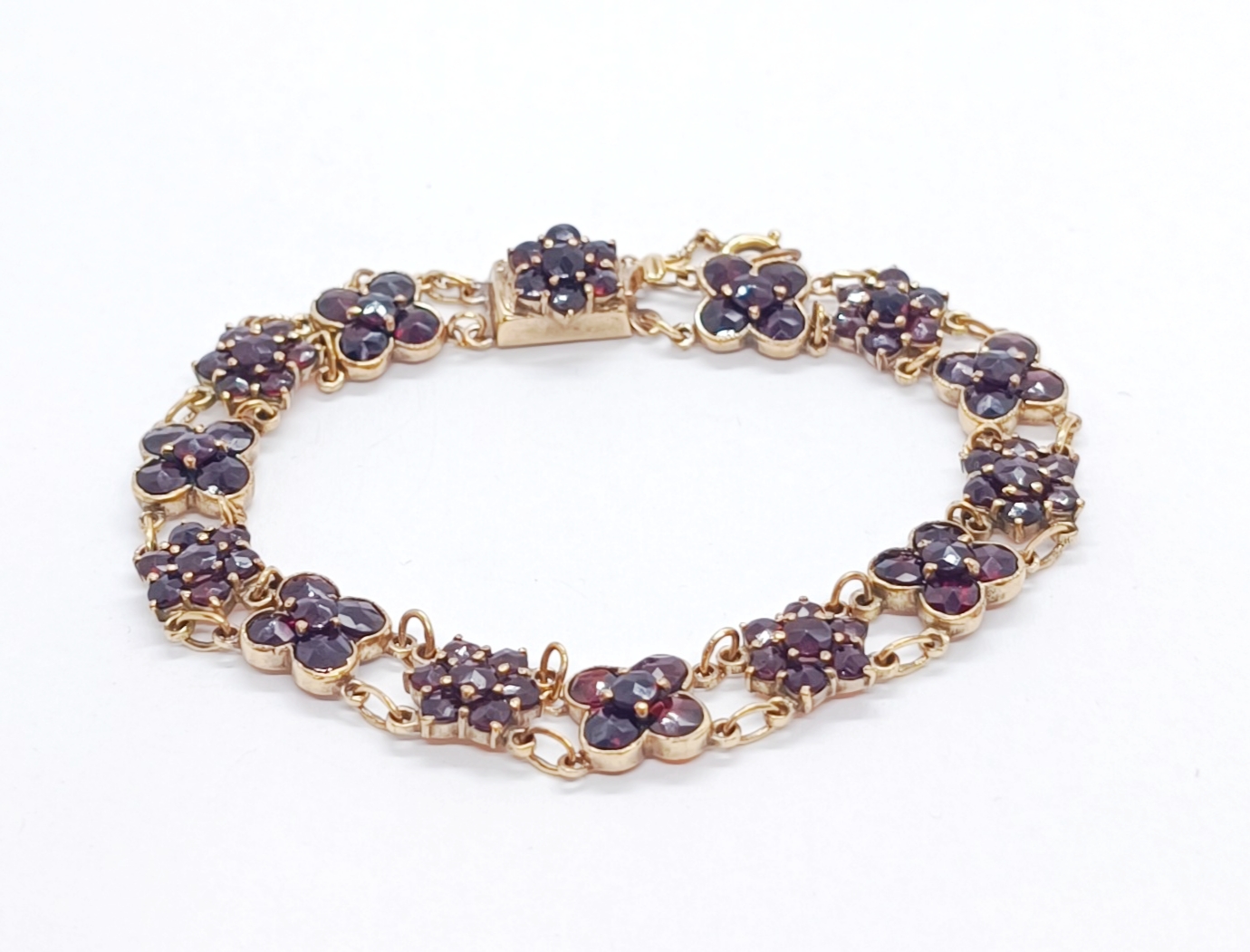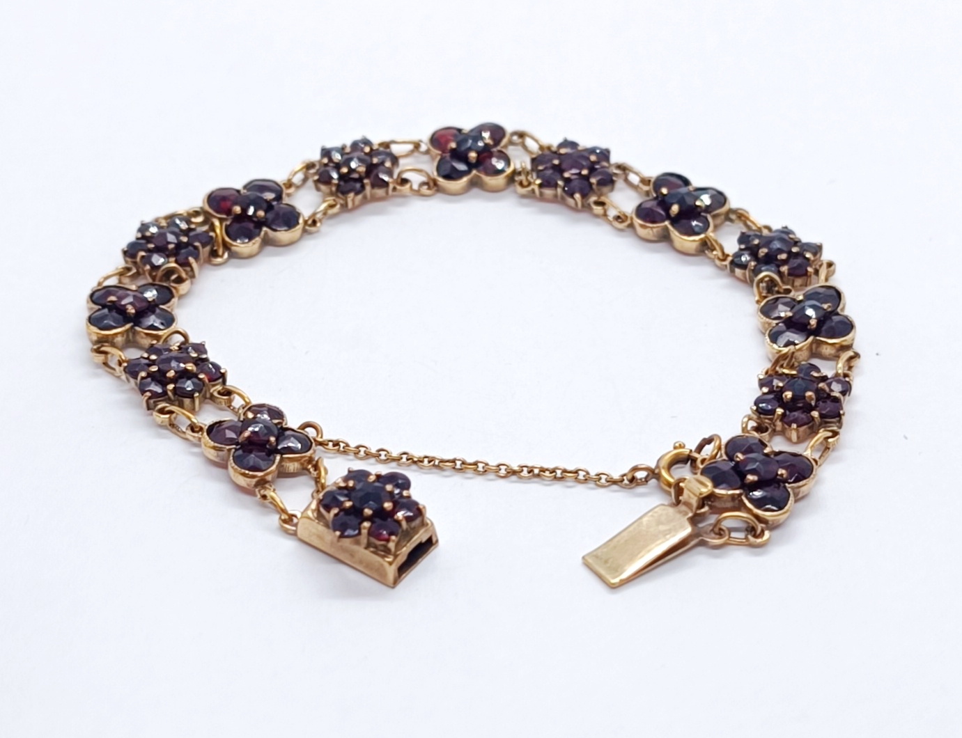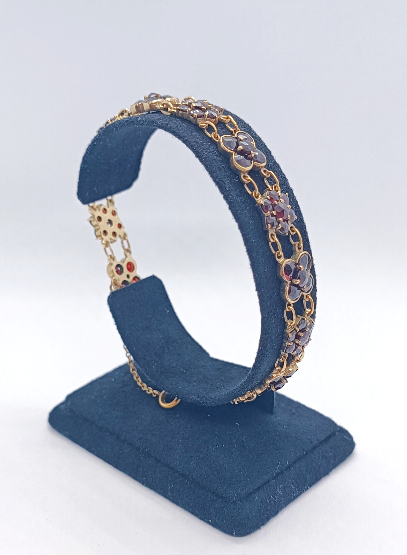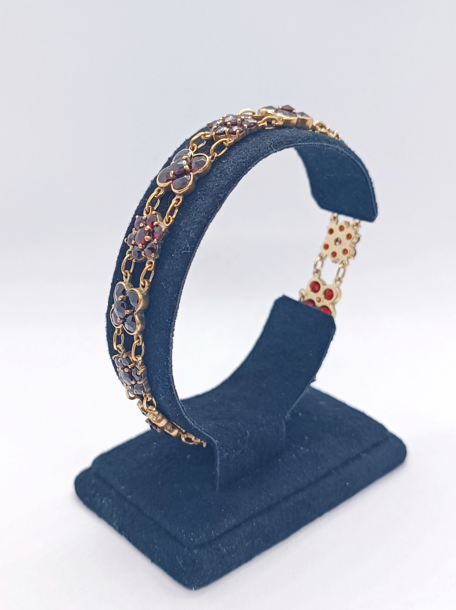 Článkový náramek z granátů (almandinů), zlacený obecný kov, granáty broušené a poskládané v květy, západní Evropa, 1. polovina 20. století; délka 19 cm, šířka 0,9 cm