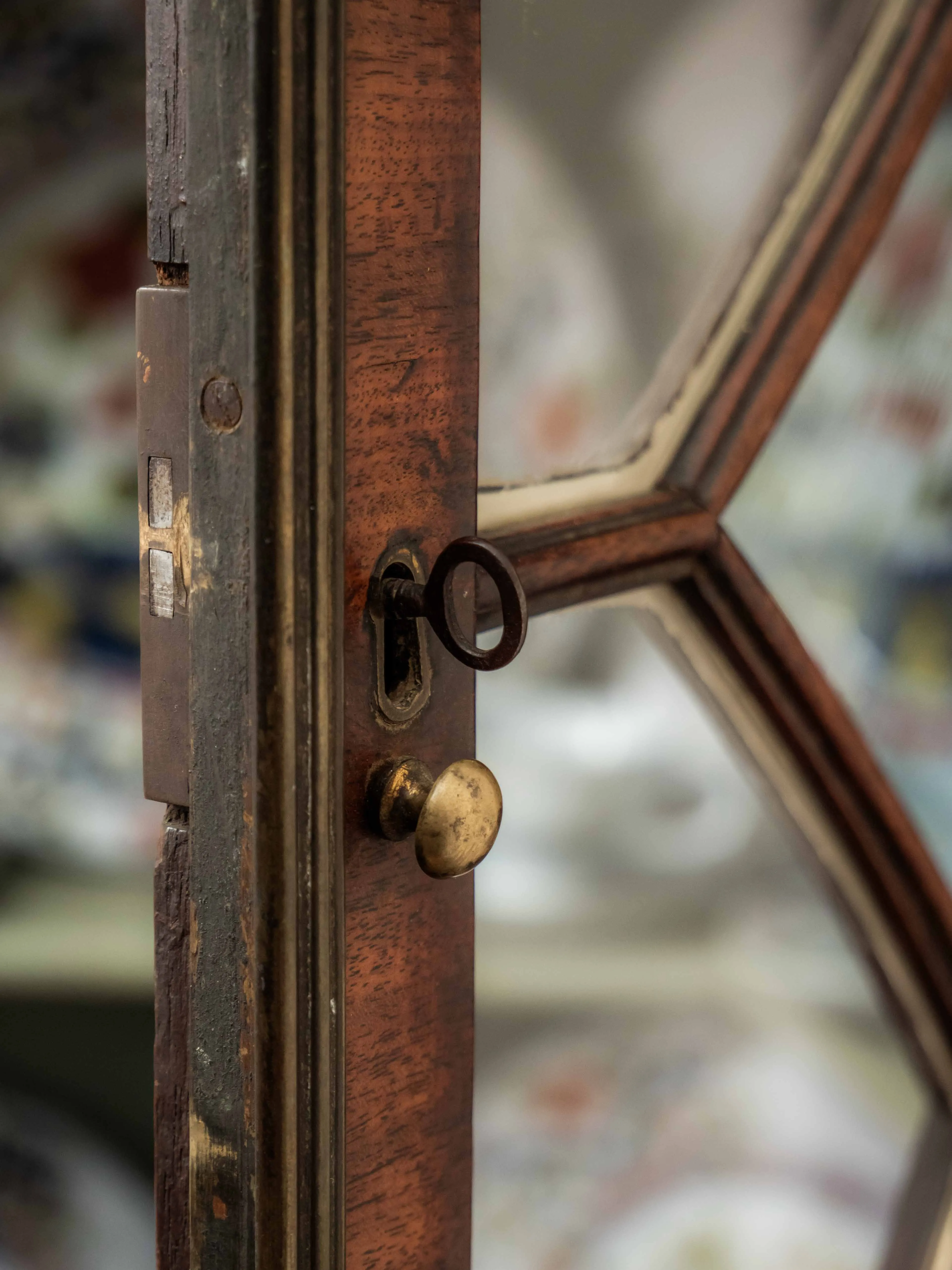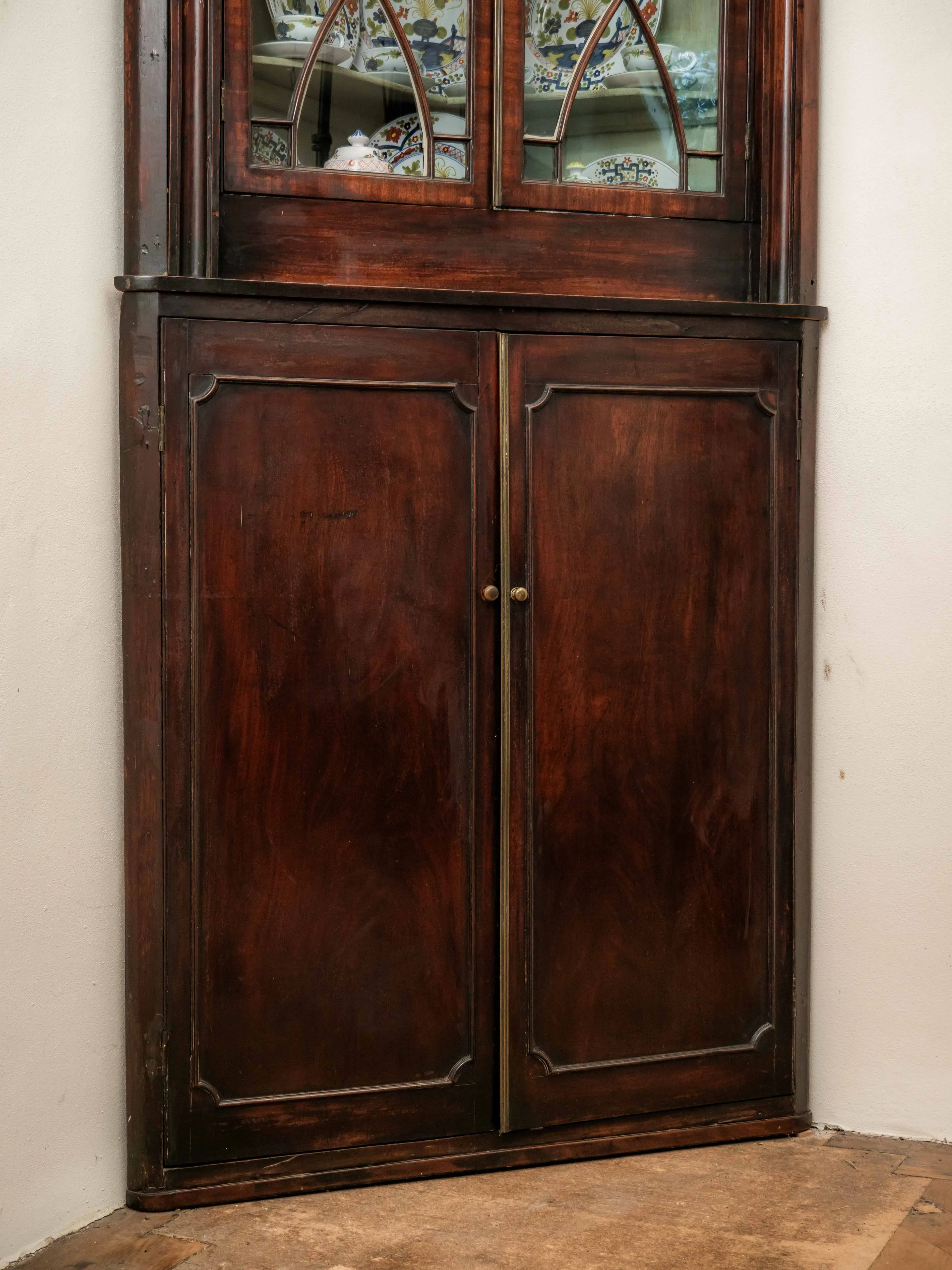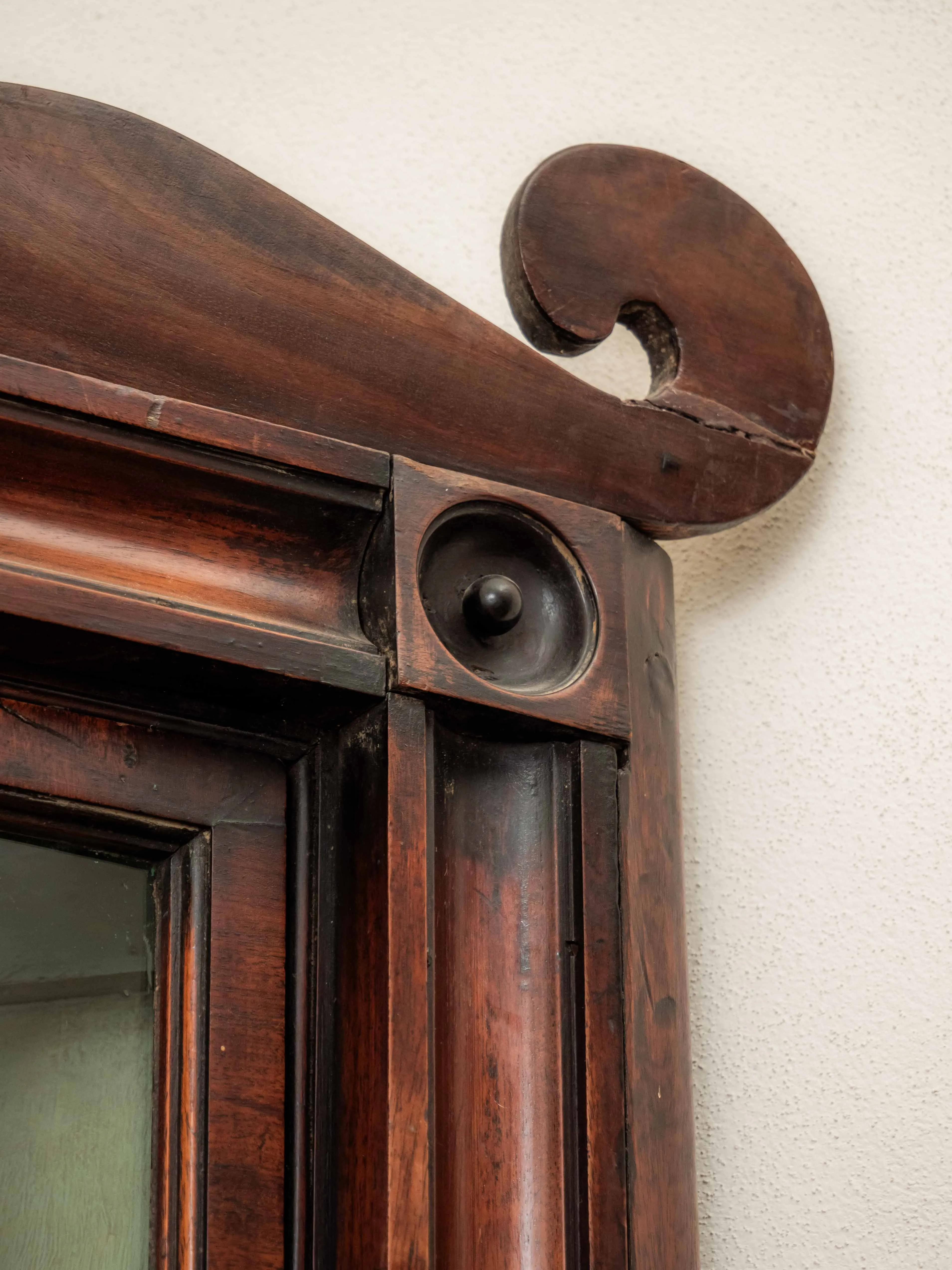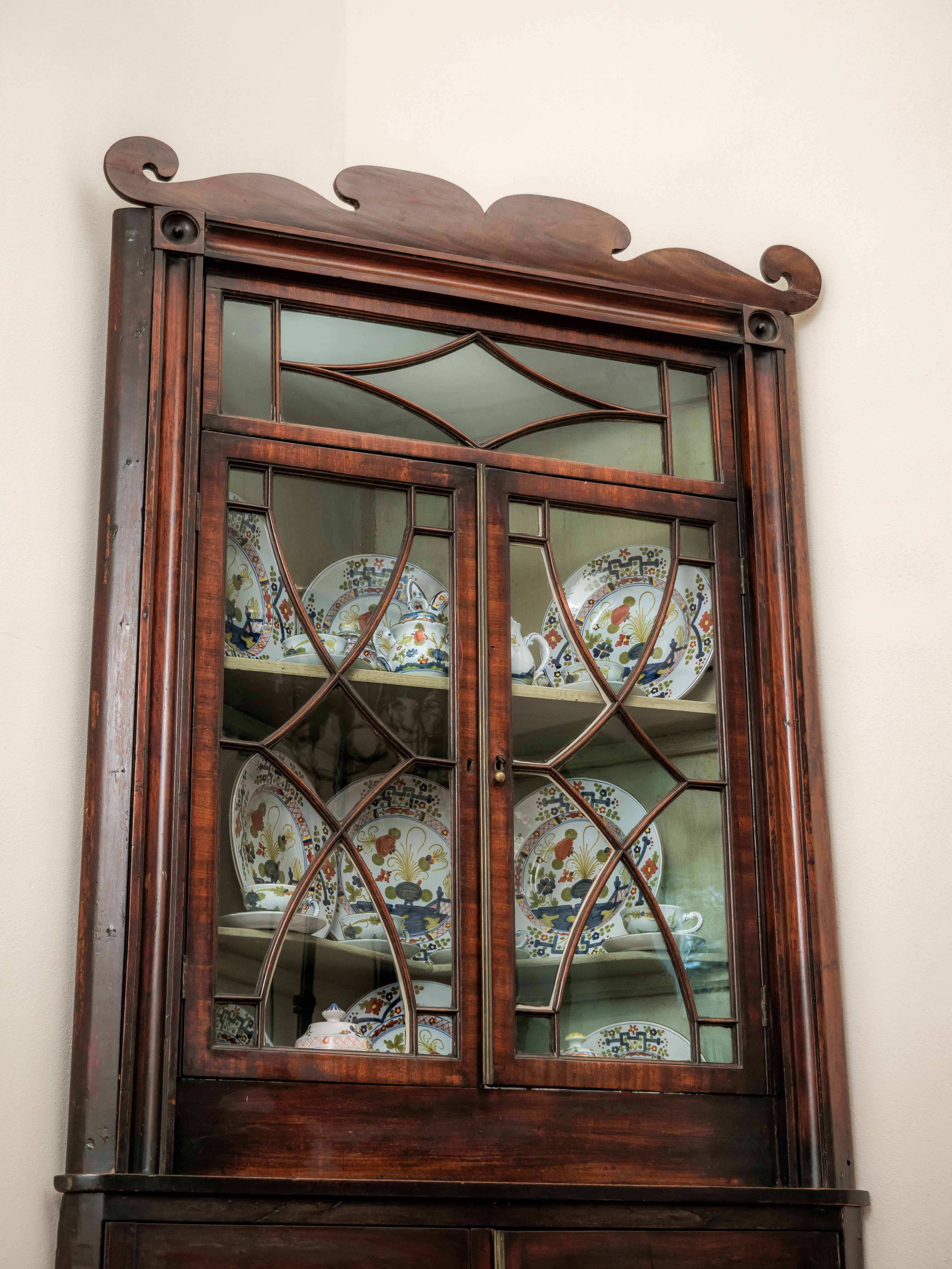 Starožitná rohová vitrína z mahagonového masivu s mosazným kováním. Vrchní prosklená část se dvěma dvířky a vrchním světlíkem, má dělená skla – většina skel je ještě původních. Uvnitř jsou dvě police. Spodní část s plnými dvířky s jednou policí. Vrchní dvířka jsou uzamykatelná, klíček je součástí a zámeček funkční. Knihovna je zdobená profilacemi a vrchní ozdobnou římsou. Stav: velmi dobrý, bez červotoče. Provenience: Anglie. Datace: 19. století.