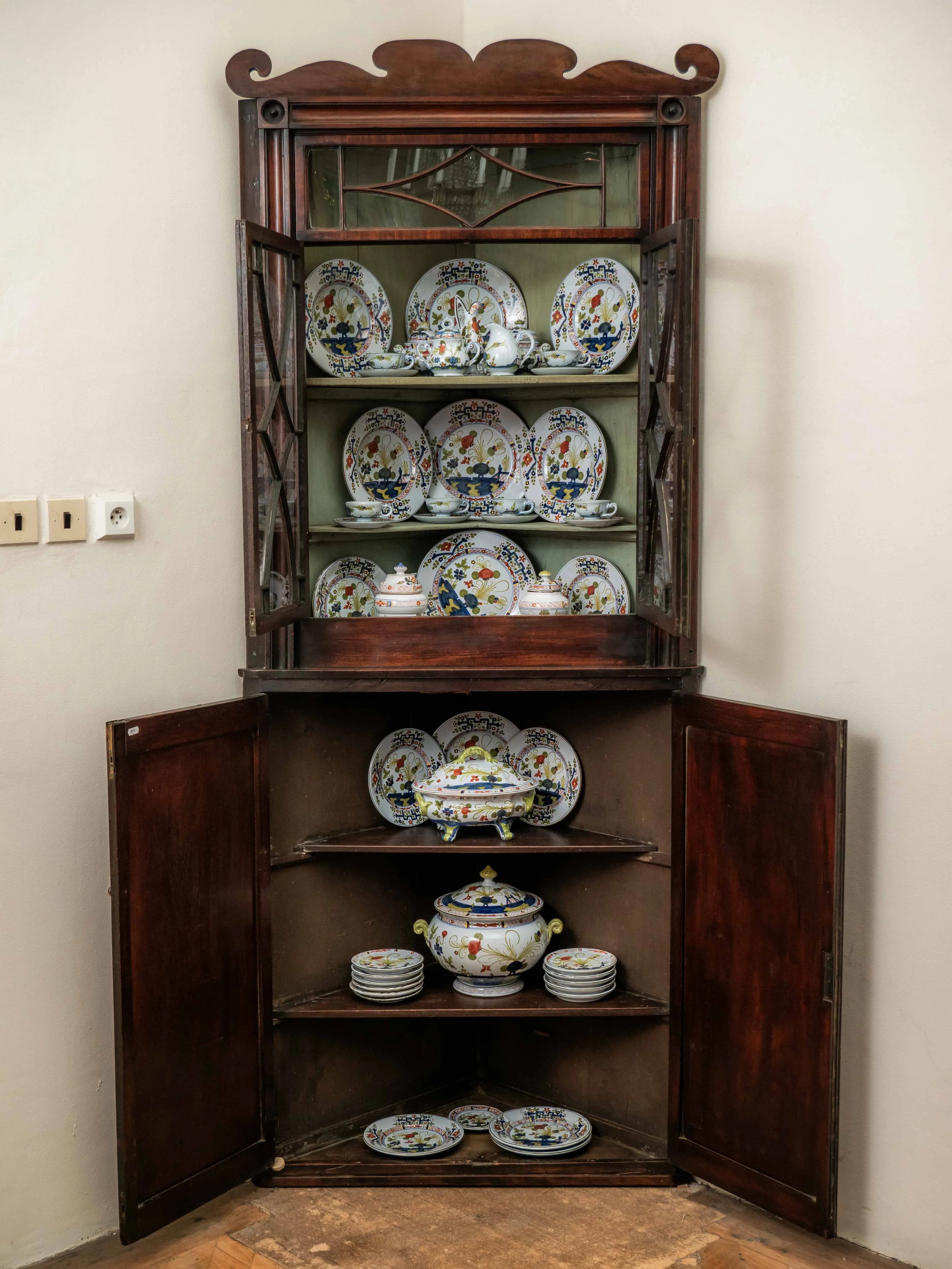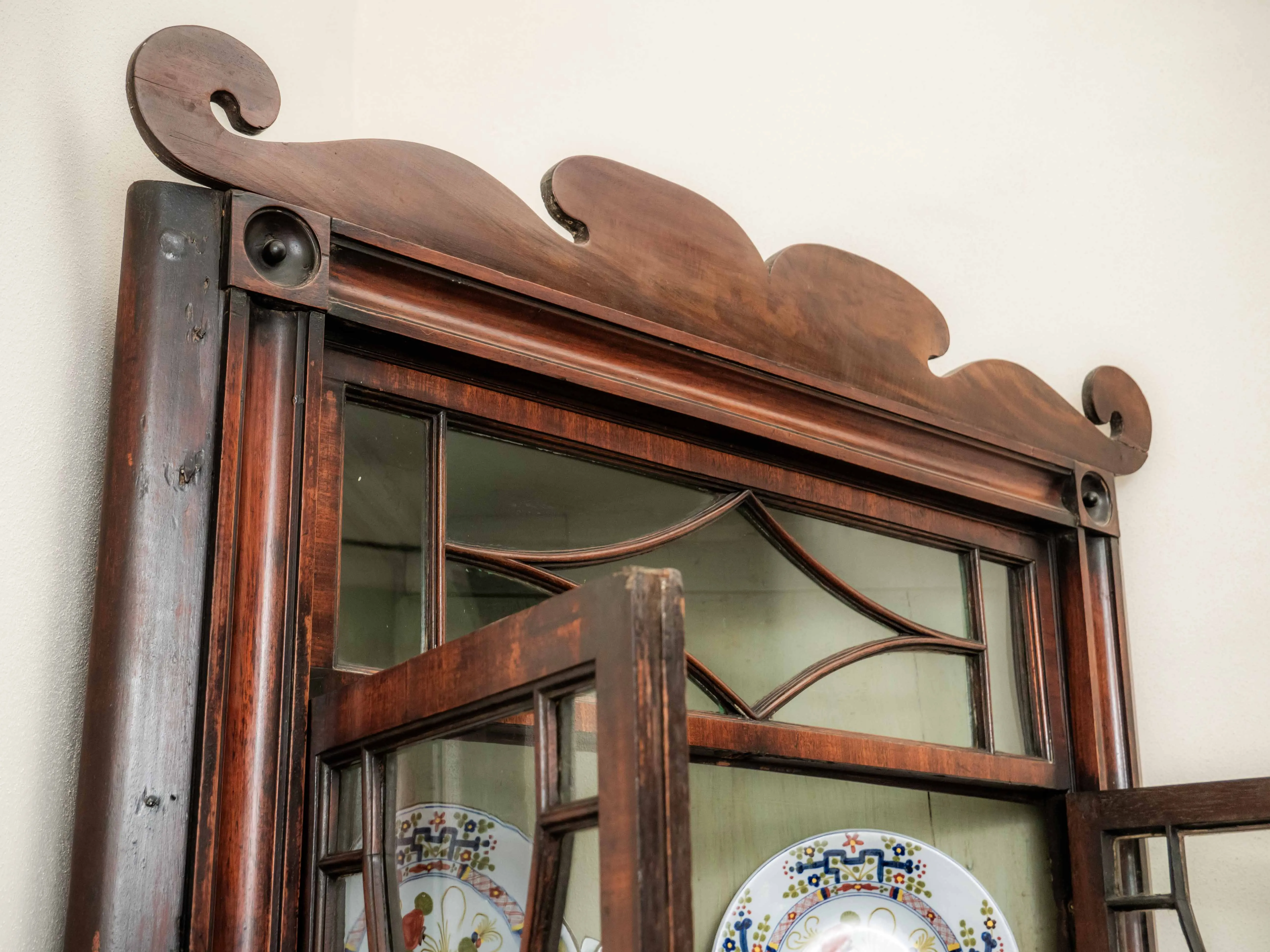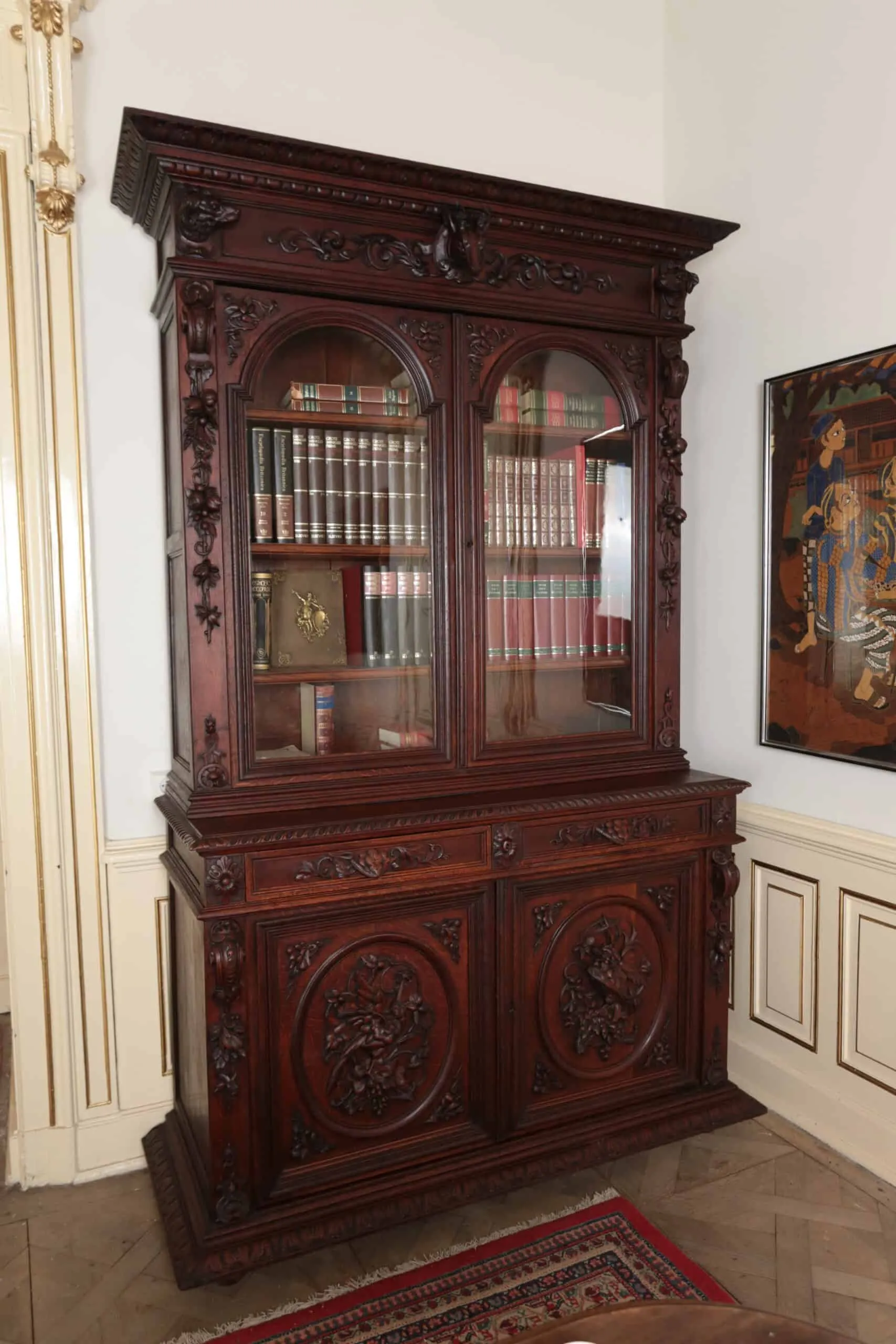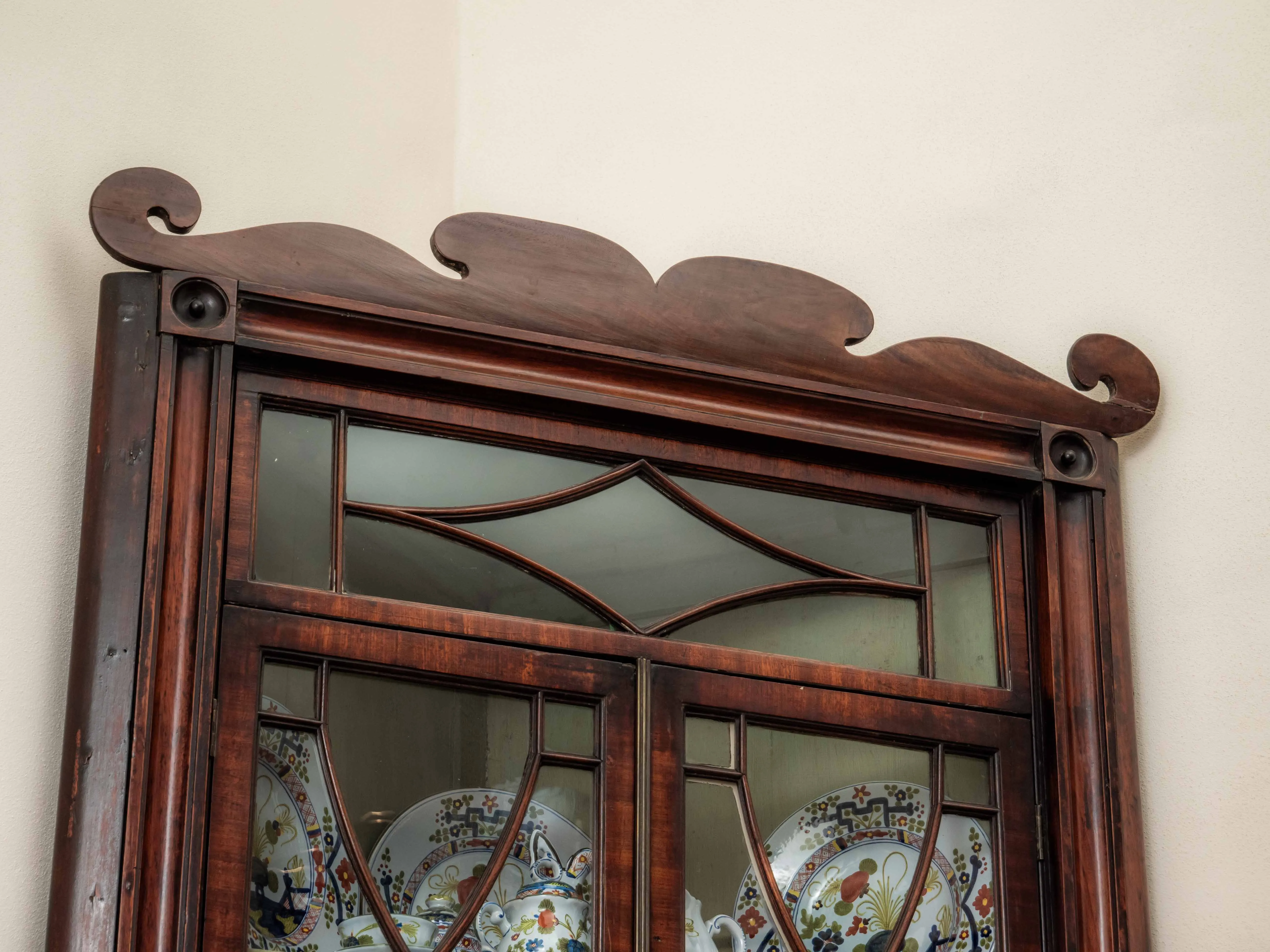 Starožitná rohová vitrína z mahagonového masivu s mosazným kováním. Vrchní prosklená část se dvěma dvířky a vrchním světlíkem, má dělená skla – většina skel je ještě původních. Uvnitř jsou dvě police. Spodní část s plnými dvířky s jednou policí. Vrchní dvířka jsou uzamykatelná, klíček je součástí a zámeček funkční. Knihovna je zdobená profilacemi a vrchní ozdobnou římsou. Stav: velmi dobrý, bez červotoče. Provenience: Anglie. Datace: 19. století.