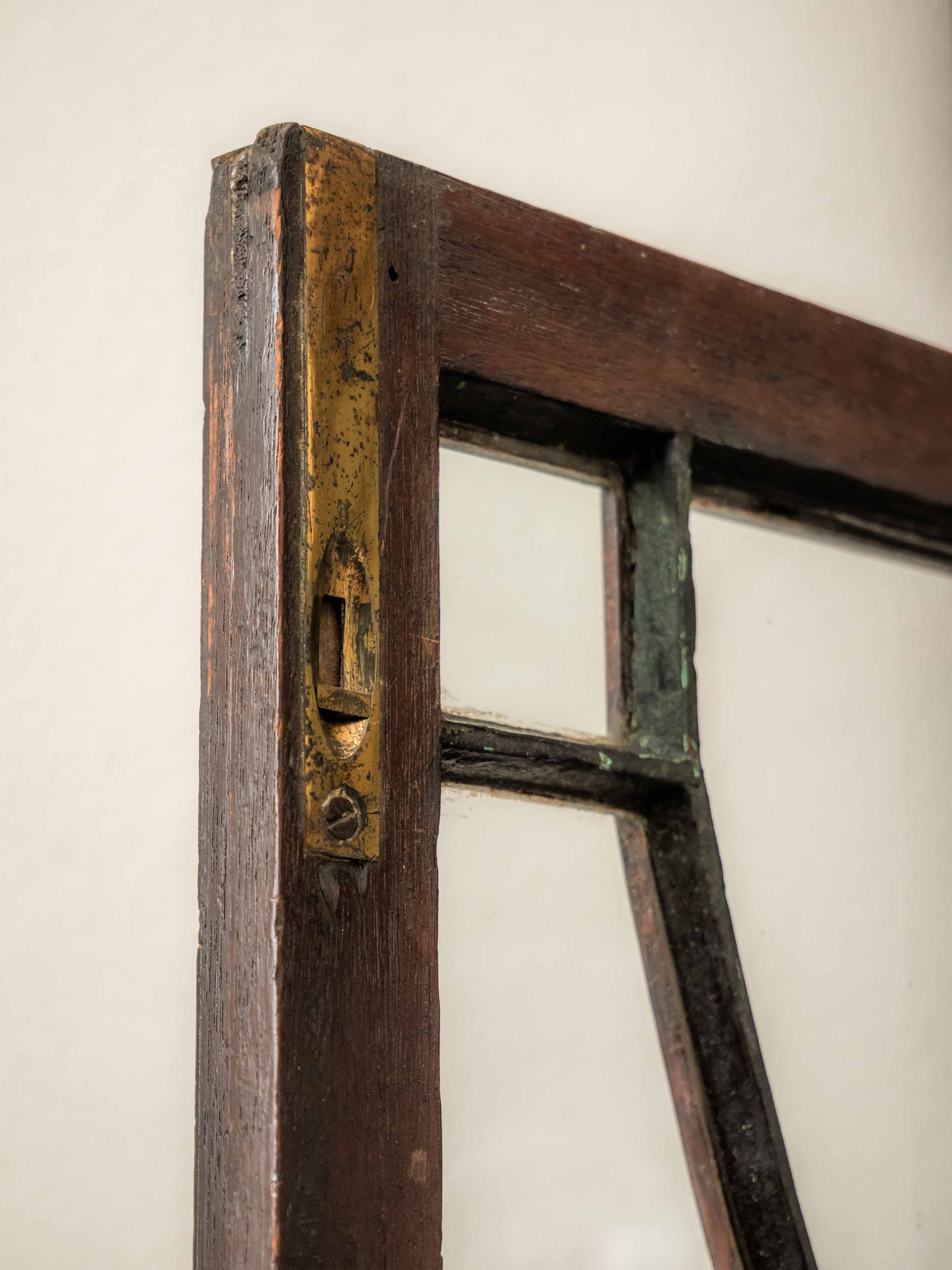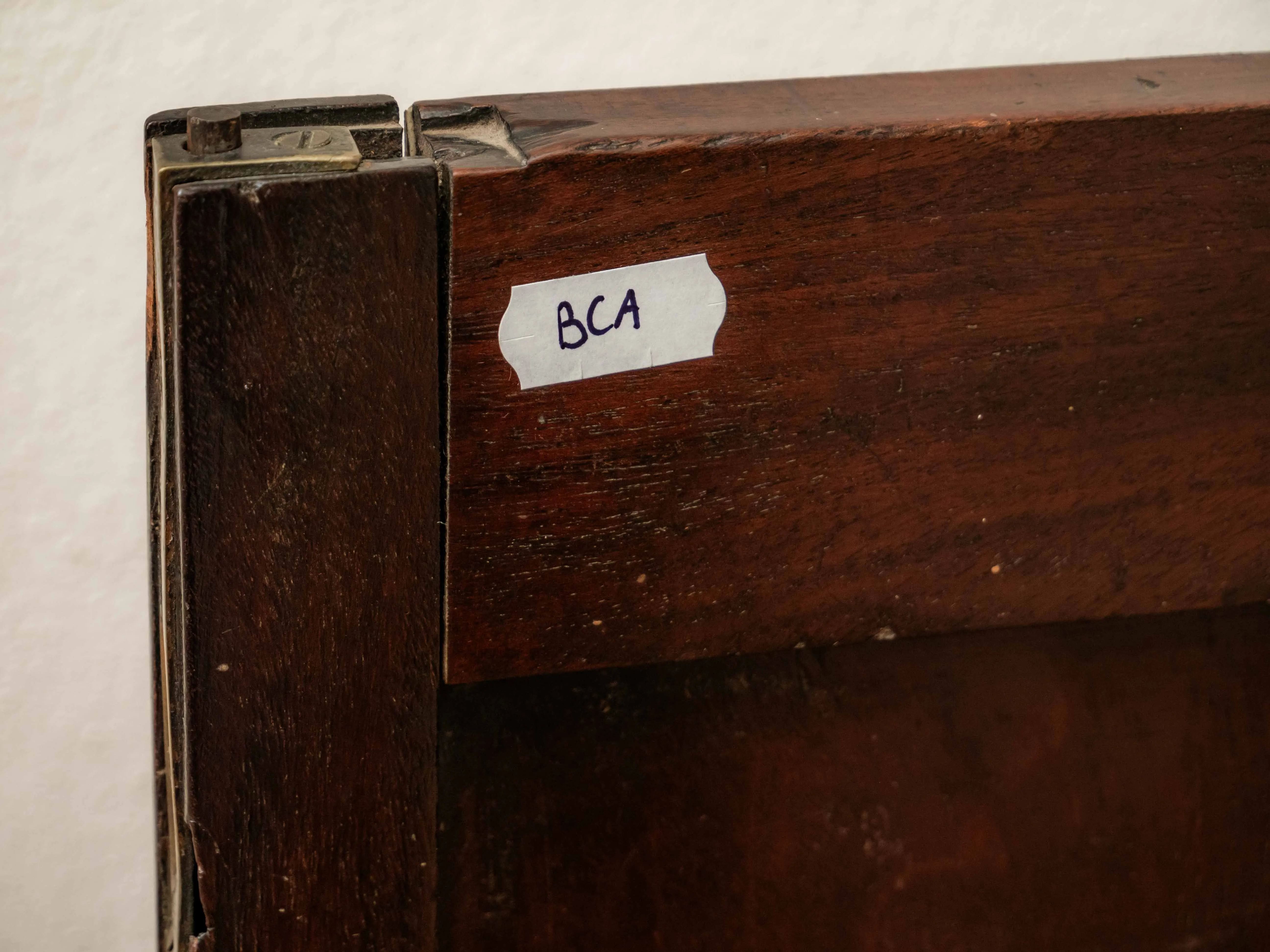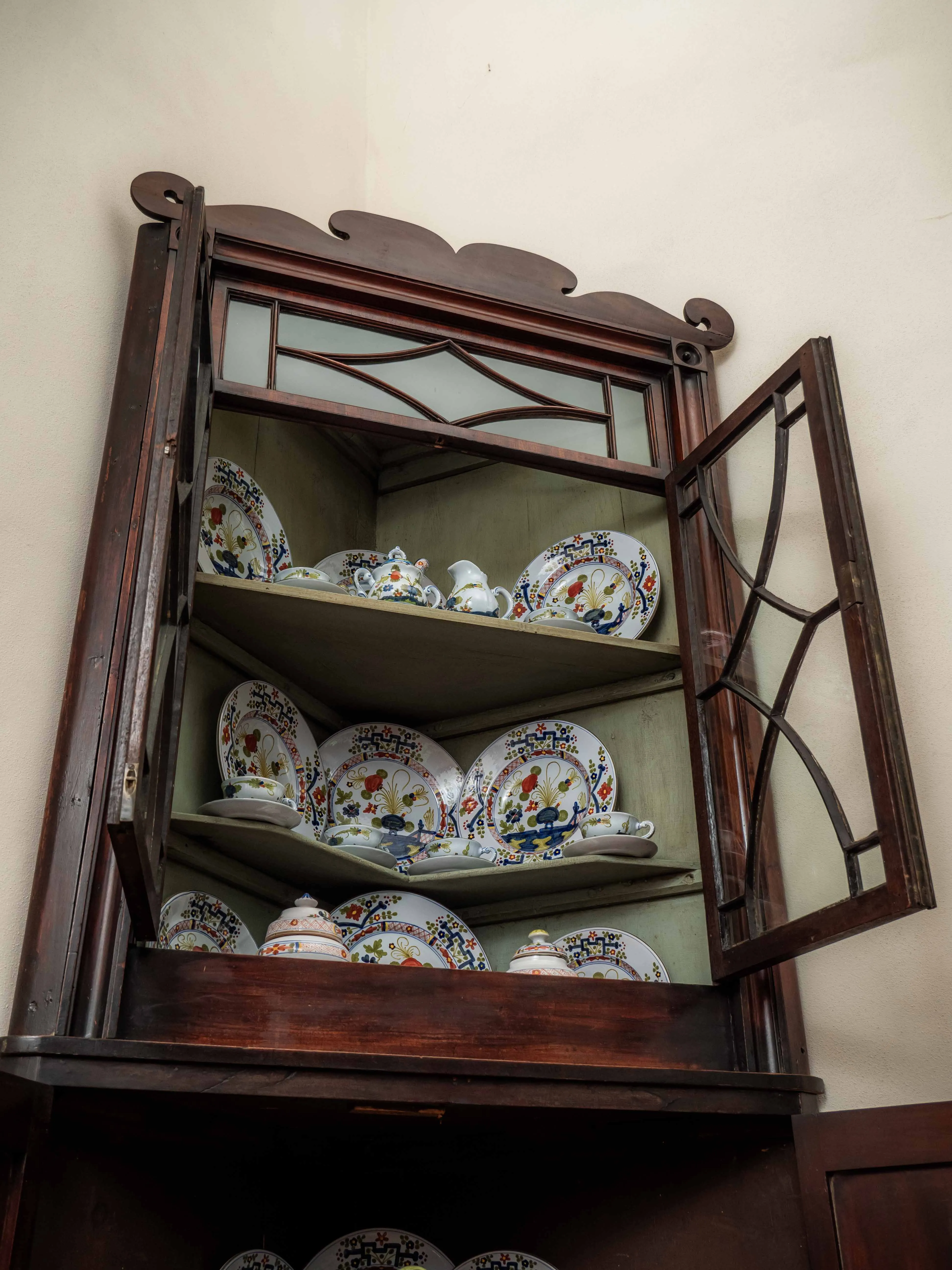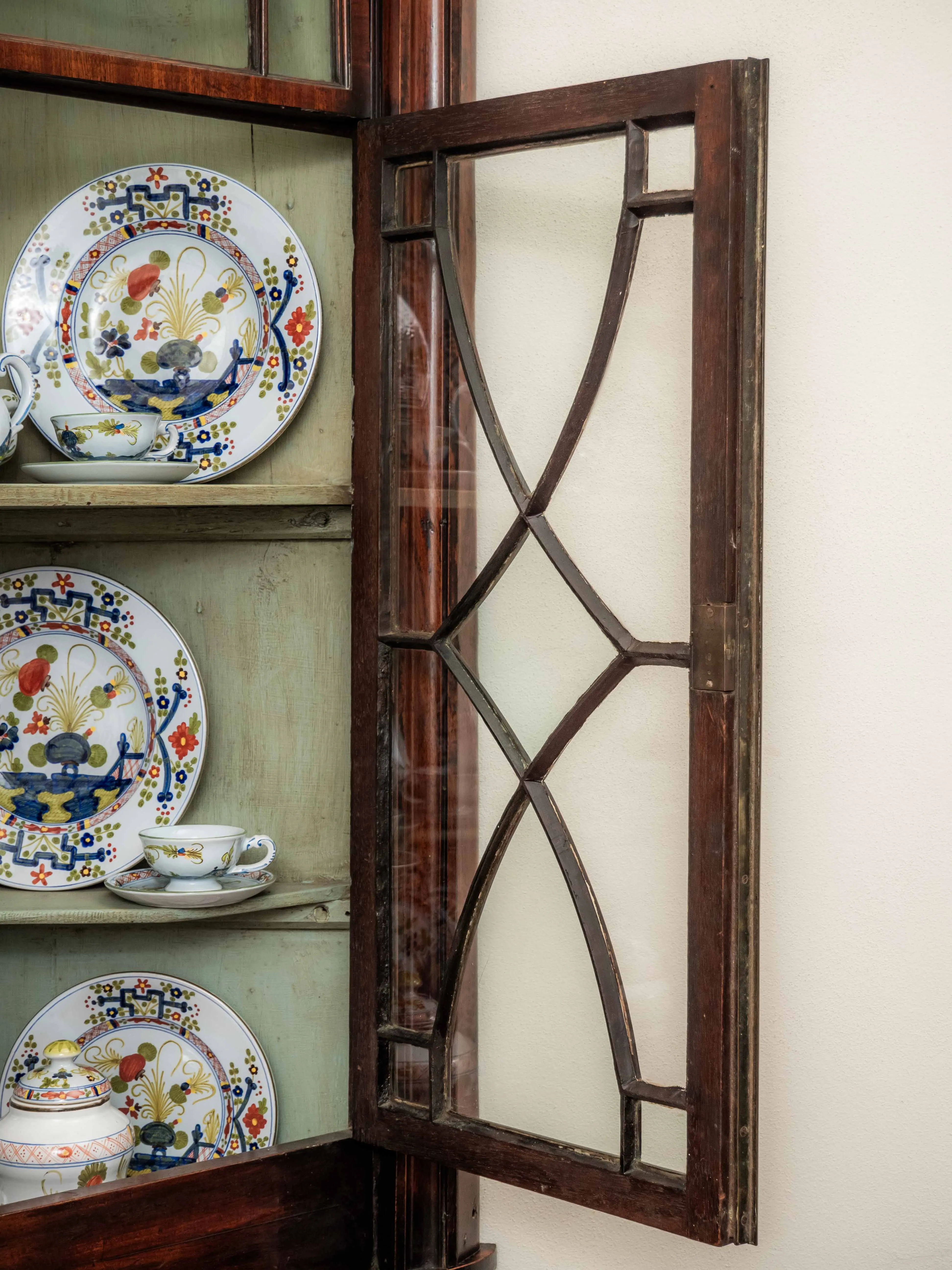 Starožitná rohová vitrína z mahagonového masivu s mosazným kováním. Vrchní prosklená část se dvěma dvířky a vrchním světlíkem, má dělená skla – většina skel je ještě původních. Uvnitř jsou dvě police. Spodní část s plnými dvířky s jednou policí. Vrchní dvířka jsou uzamykatelná, klíček je součástí a zámeček funkční. Knihovna je zdobená profilacemi a vrchní ozdobnou římsou. Stav: velmi dobrý, bez červotoče. Provenience: Anglie. Datace: 19. století.