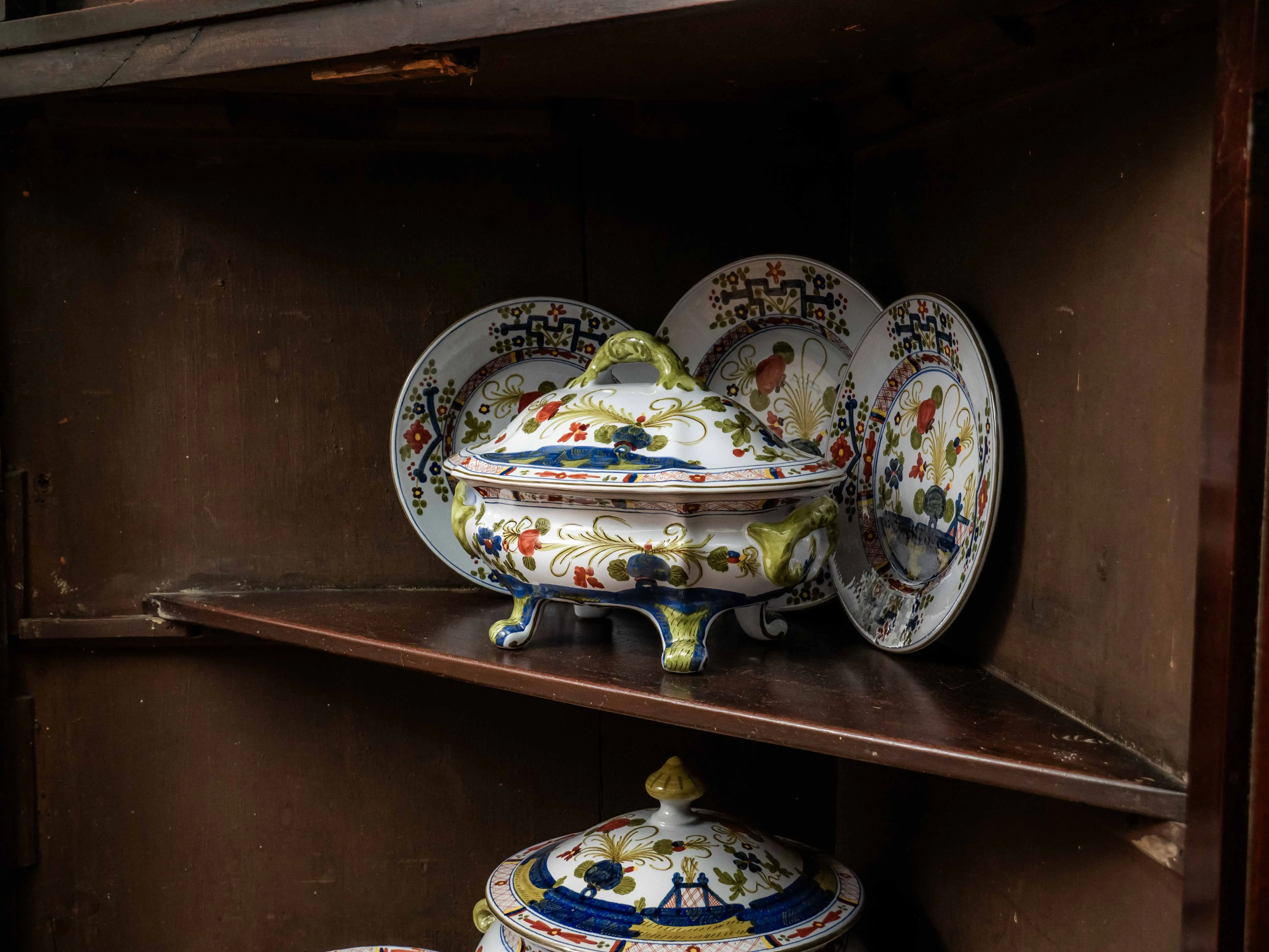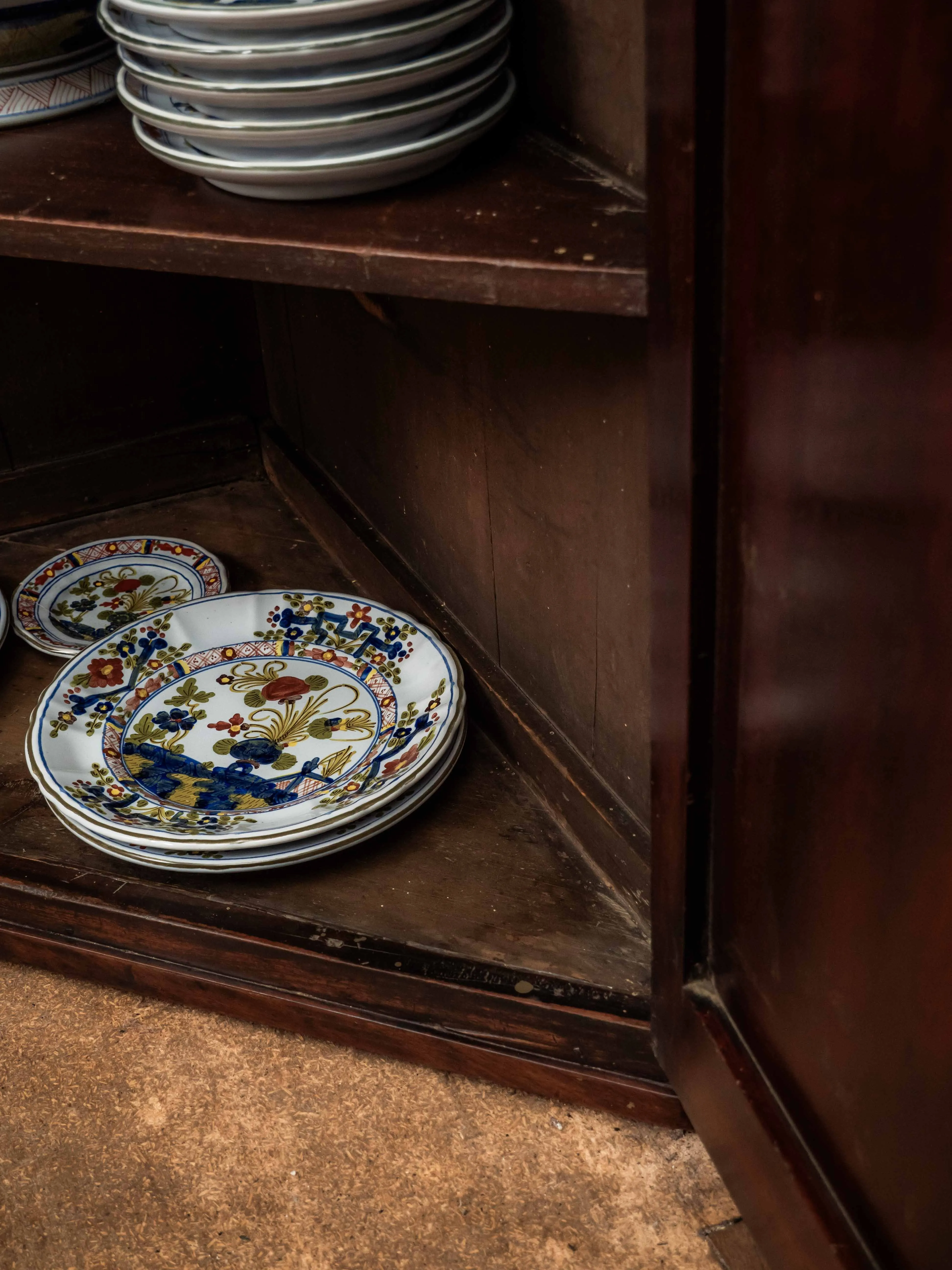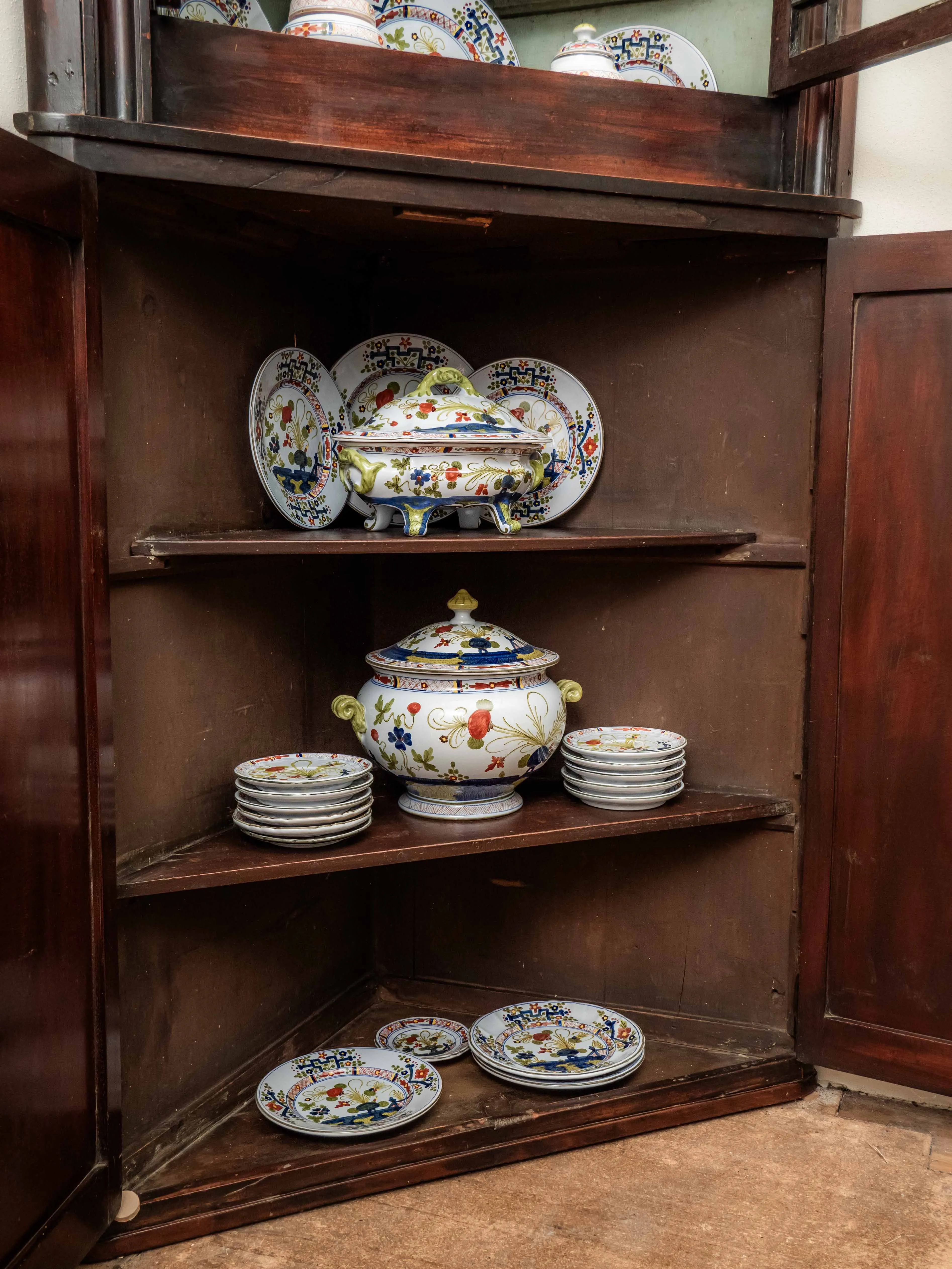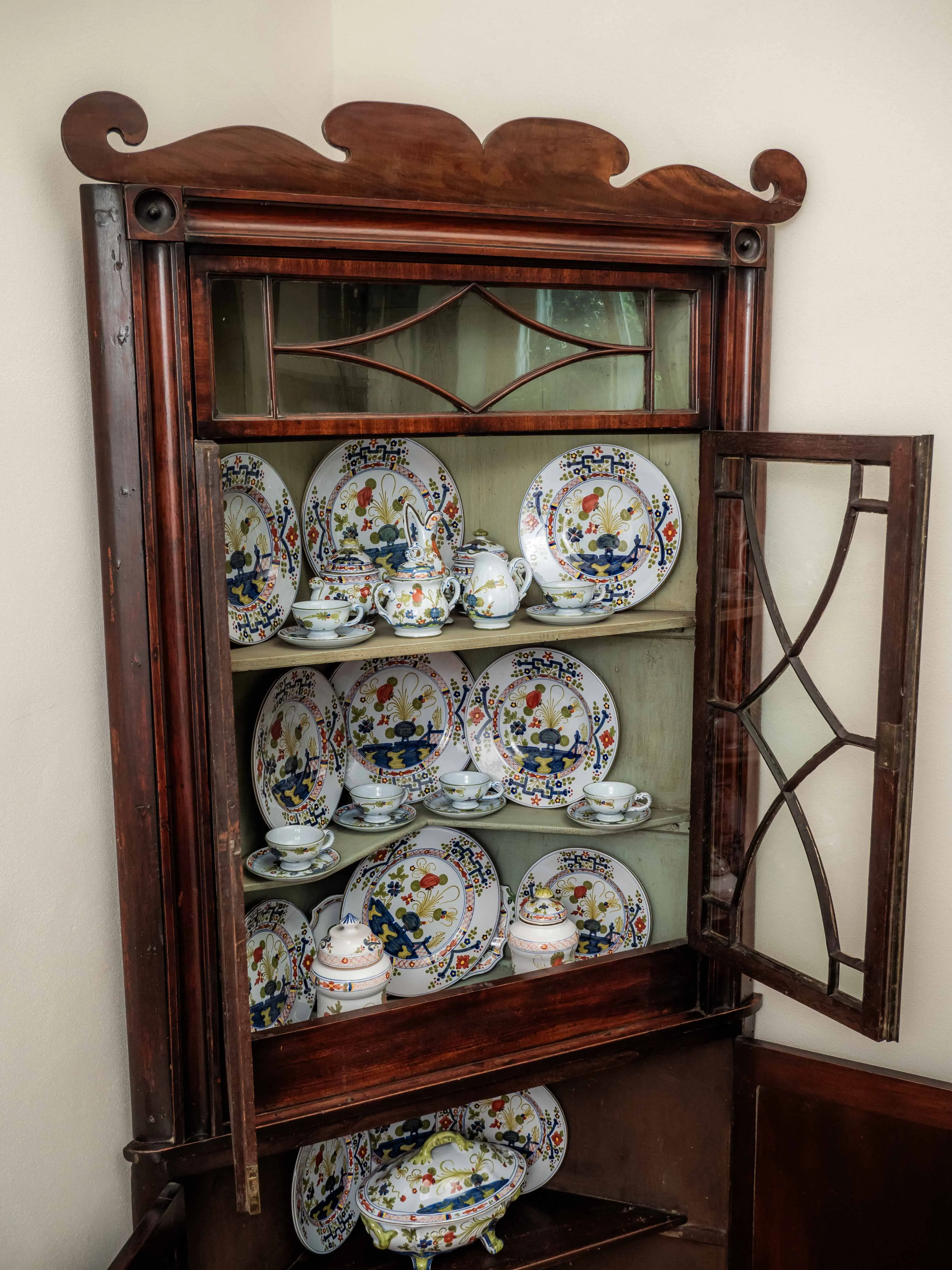 Starožitná rohová vitrína z mahagonového masivu s mosazným kováním. Vrchní prosklená část se dvěma dvířky a vrchním světlíkem, má dělená skla – většina skel je ještě původních. Uvnitř jsou dvě police. Spodní část s plnými dvířky s jednou policí. Vrchní dvířka jsou uzamykatelná, klíček je součástí a zámeček funkční. Knihovna je zdobená profilacemi a vrchní ozdobnou římsou. Stav: velmi dobrý, bez červotoče. Provenience: Anglie. Datace: 19. století.