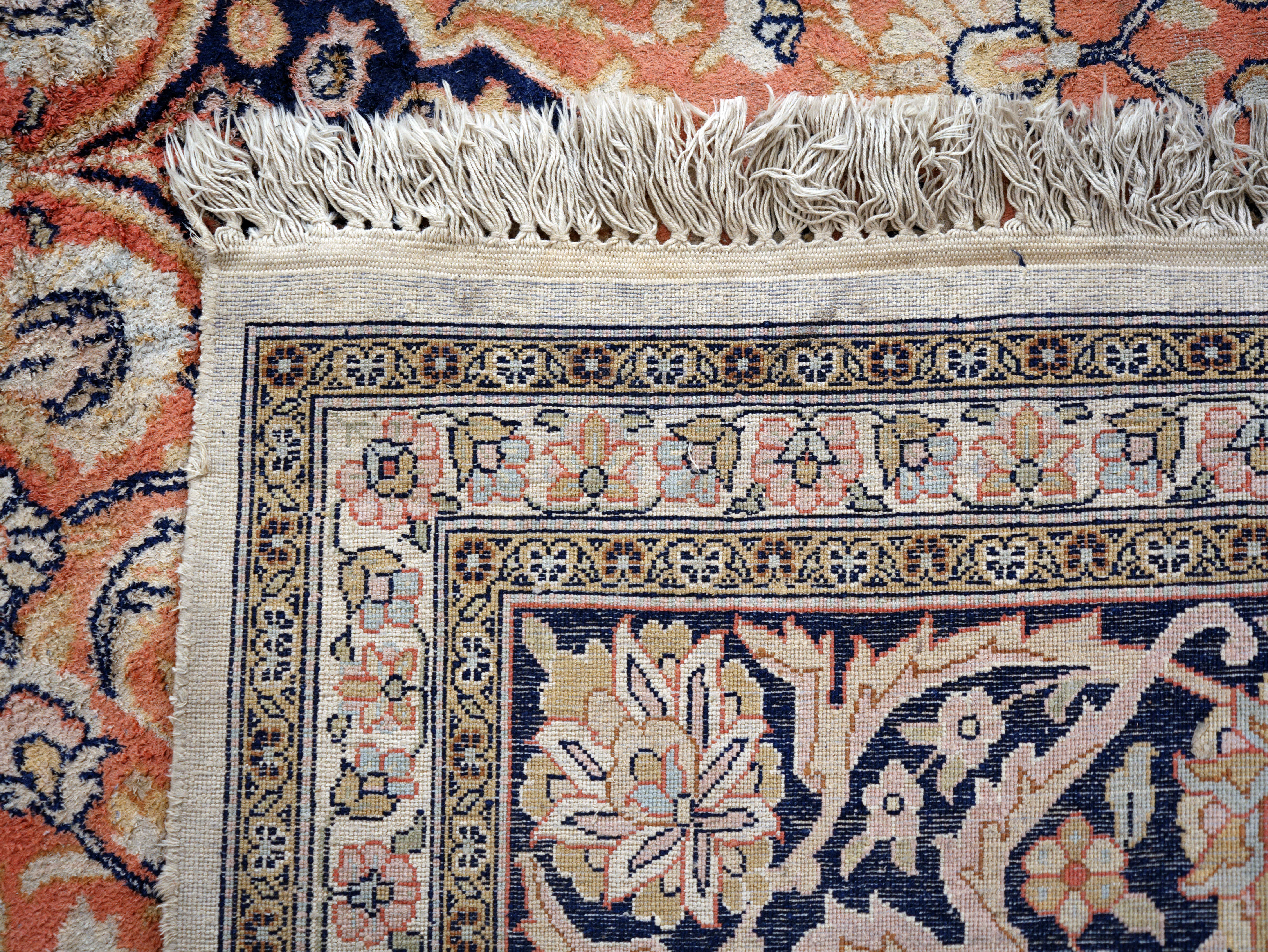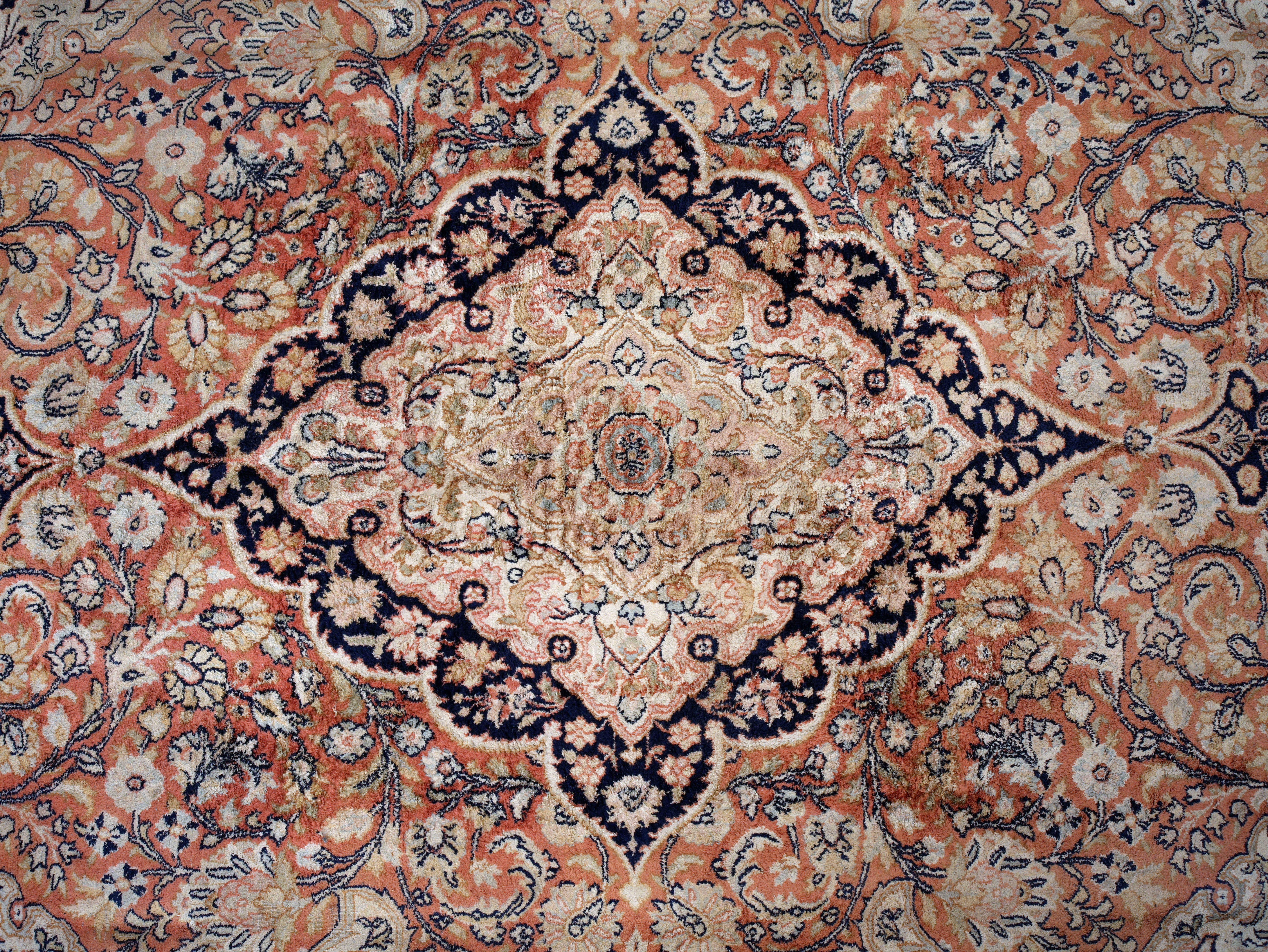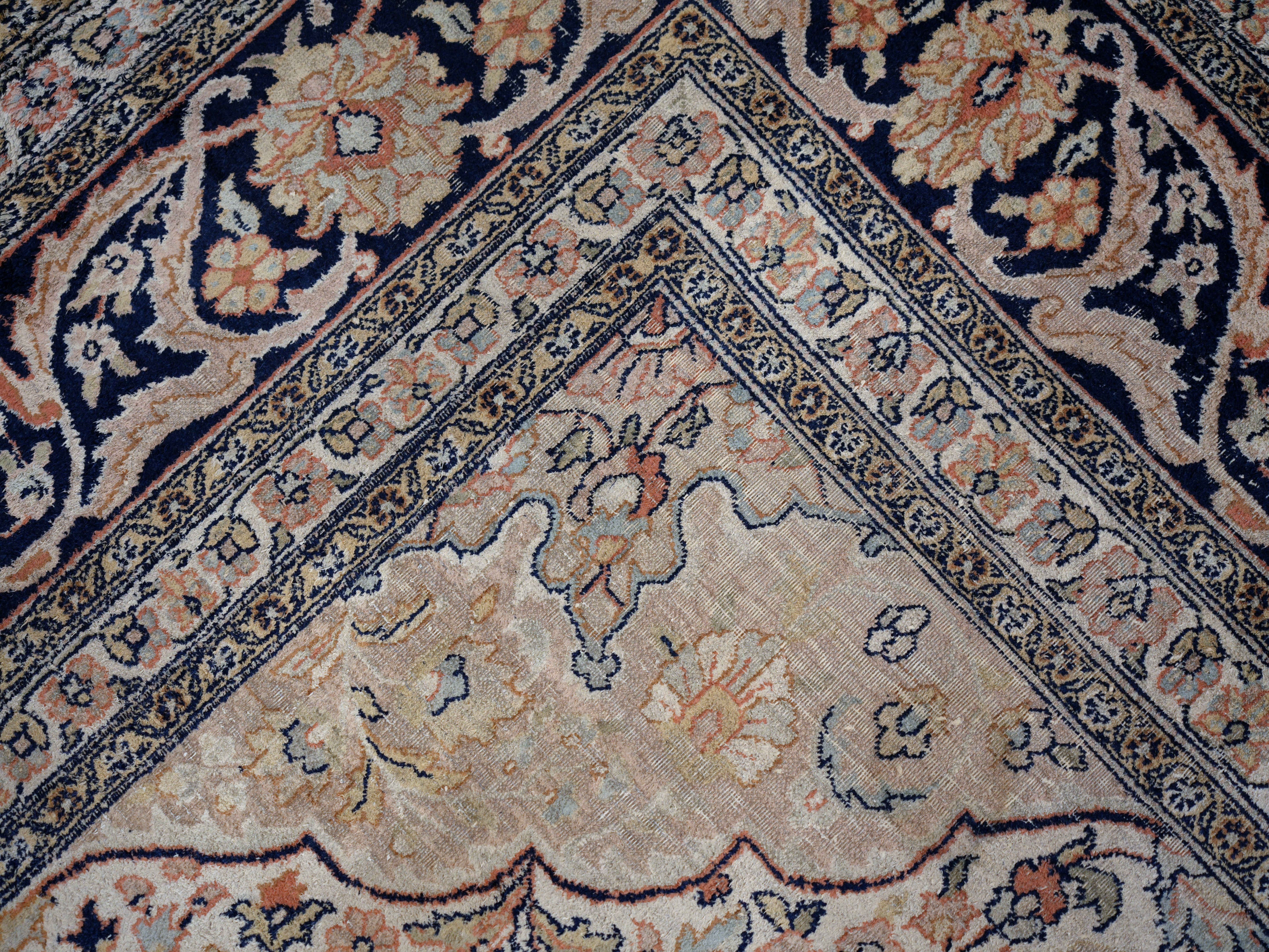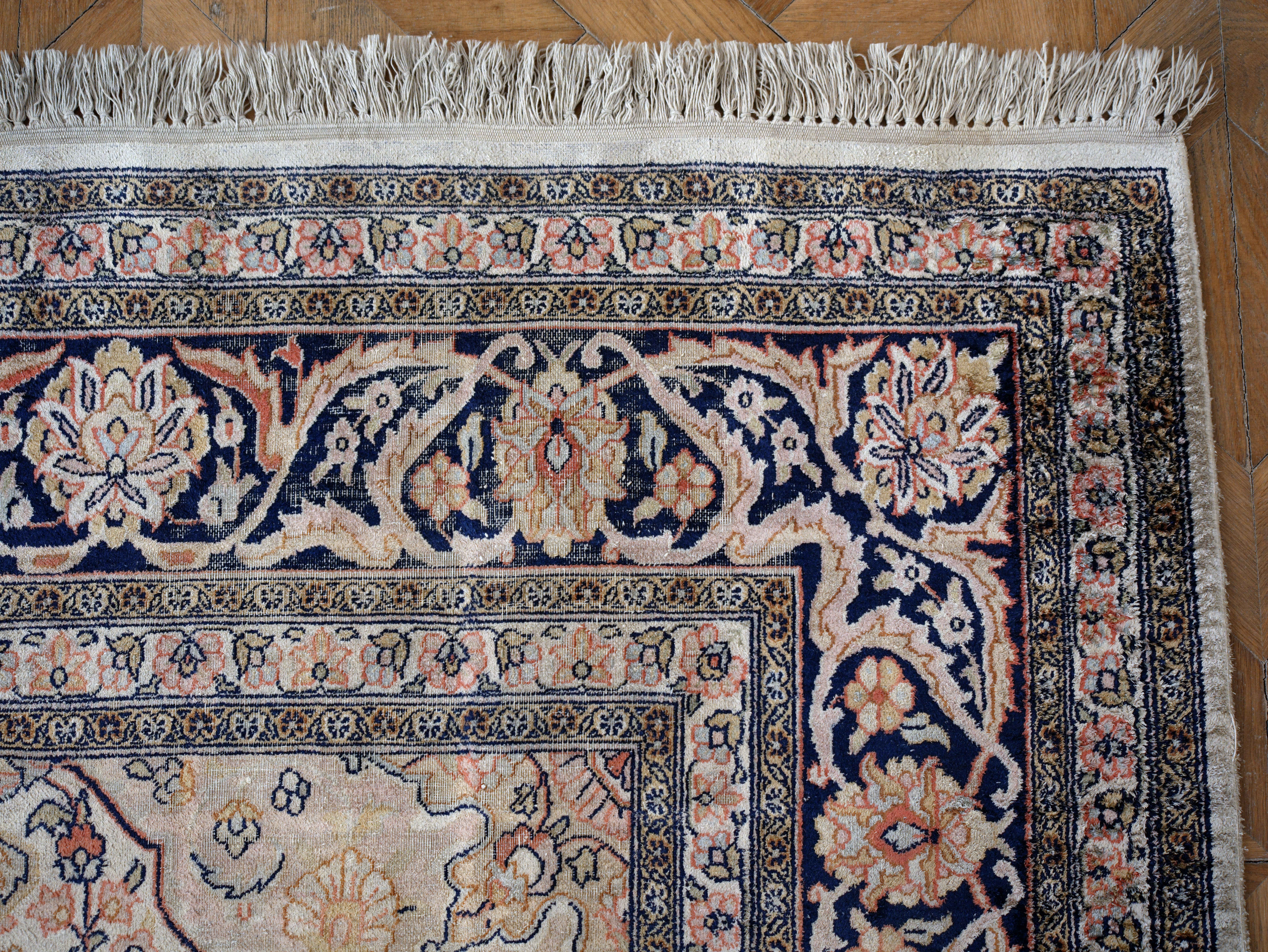 Elegantní ručně vázaný koberec z kašmírského hedvábí na bavlněné osnově, vyznačující se jemnou strukturou a bohatým ornamentálním dekorem s centrálním medailonem. Harmonická barevnost v odstínech slonové kosti, starorůžové a tmavě modré dodává koberci nadčasový a reprezentativní vzhled.